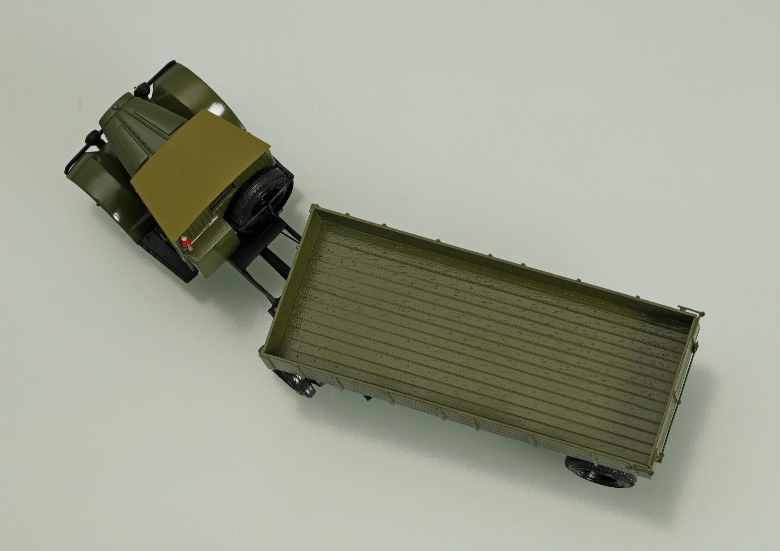 Верхняя часть сцепного устройства находилась между передними концами лонжеронов рамы полуприцепа, была укреплена на мощной поперечине, и состояла из металлических губ, захватывавших кабестан при сцепке. Поворотно-сцепное устройство давало возможность водителю производить сцепку и расцепку прямо из кабины. Через него же проходил и привод тормозов полуприцепа. Заднее окно кабины тягача получило увеличенные размеры по сравнению со стандартным, что позволяло лучше следить за маневрированием и сцепными операциями.