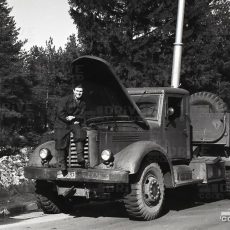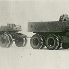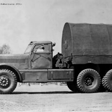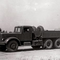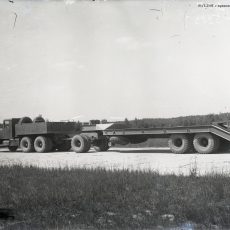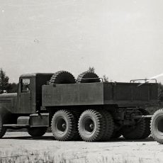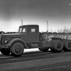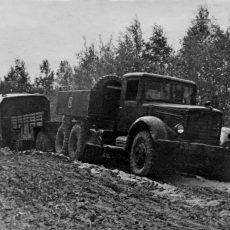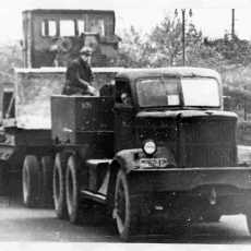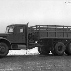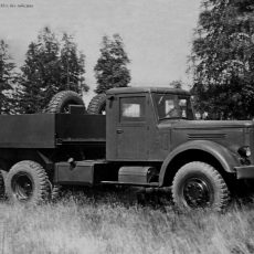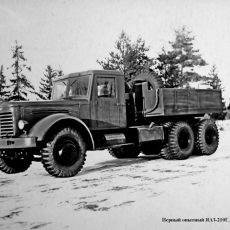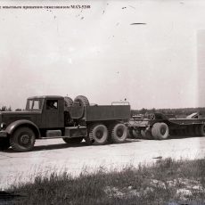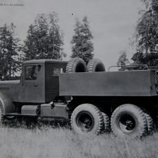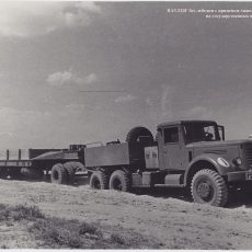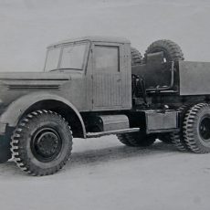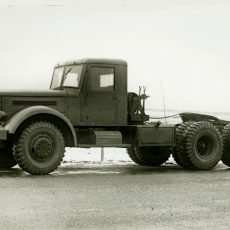 ЯАЗ-210Г 6х4 первый советский балластный тягач для перевозки на прицепе тяжелых неделимых грузов с тяговой лебедкой усилием 12 тс, мест: 3, вес: балласта до 8 тонн, буксируемого прицепа до 54 тонн, снаряжённый 12.4 тонн, с нагрузкой 20.58 тонн, максимальная скорость до 45 км/час.
