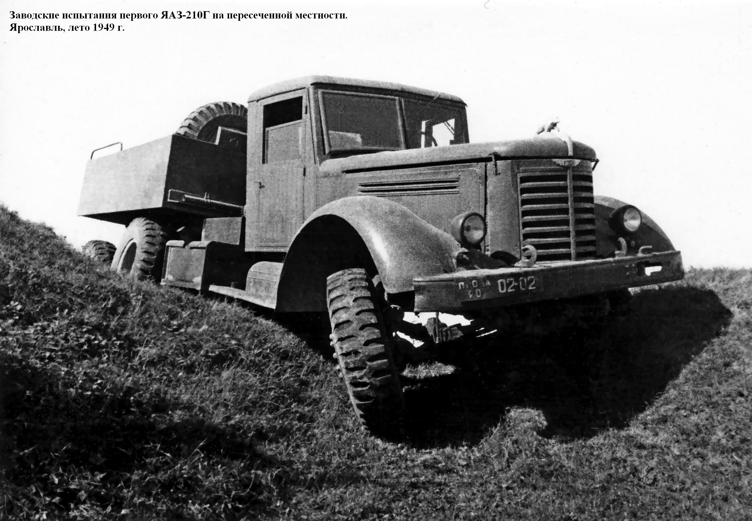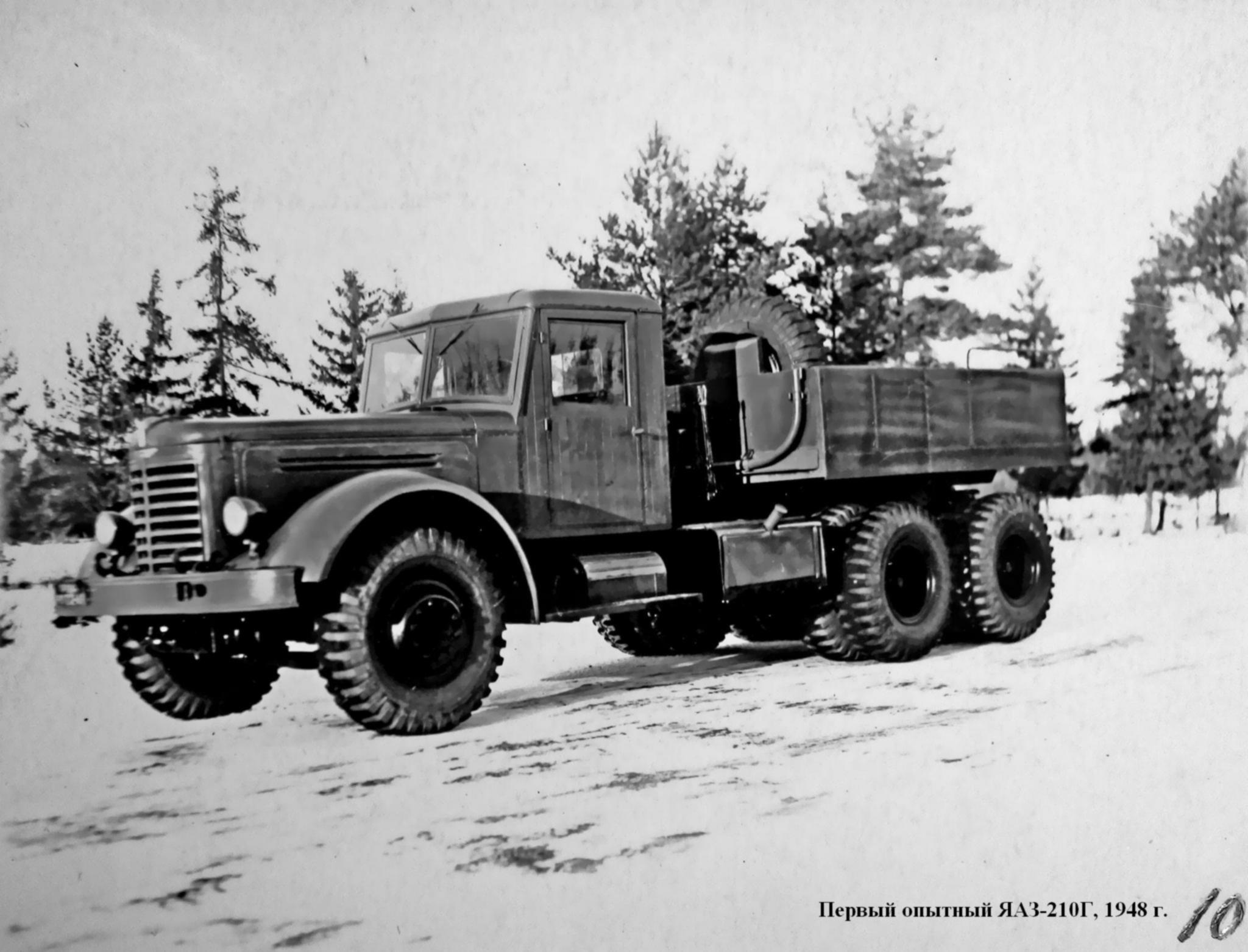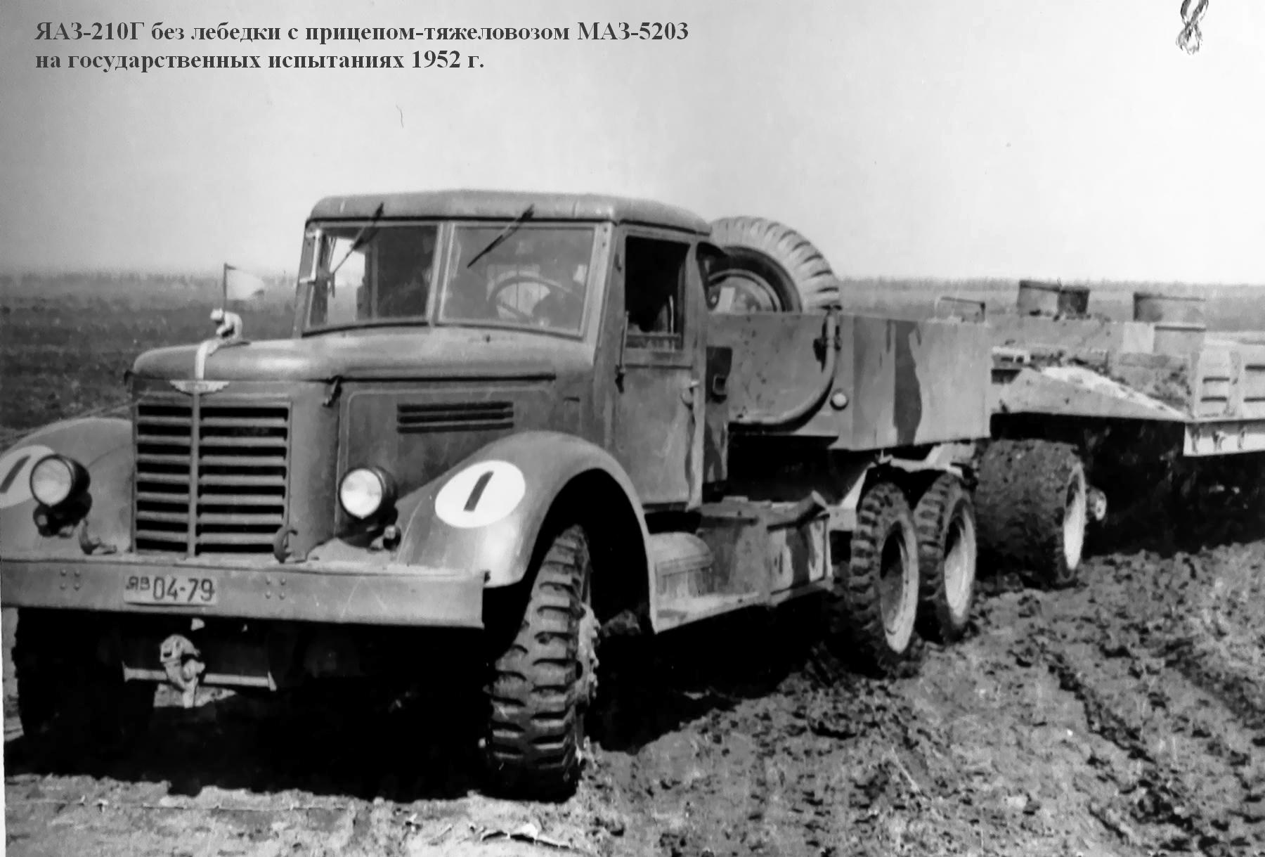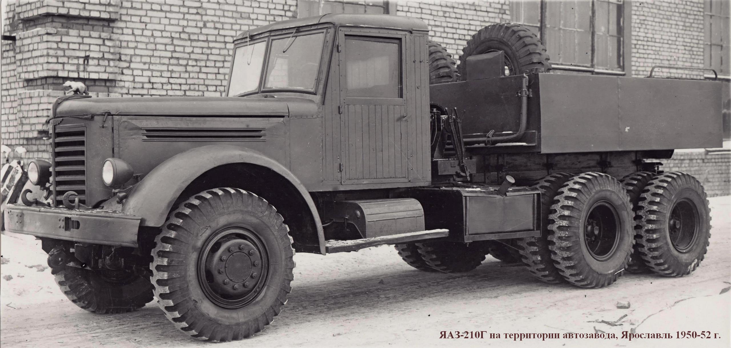 Опытный ЯАЗ-210Г действительно был построен к концу 1948 г. и оснащен форсированной версией американского дизеля GMC-6-71 мощностью 200 л.с. (установленный на тягаче экземпляр такого силового агрегата, похоже, реально выдавал до 215 л.с.), поскольку в тот момент стандартный дизель ЯАЗ-206 еще только осваивался в Ярославле, а о его форсировании речь вообще еще не шла. Однако за неимением достаточного количества таких дизелей на серийные тягачи начиная с 1951 г. пришлось устанавливать обычные 165-сильные ЯАЗ-206, что и заставило снизить показатели грузоподъемности. Собственной нагрузки ЯАЗ-210Г это не коснулось, она была определена в 8 т груза или балласта в зависимости от типа дорожного покрытия для ранних серийных машин пришлось уменьшить до 40/25 т, а для более поздних - и вовсе до 30/15 т.