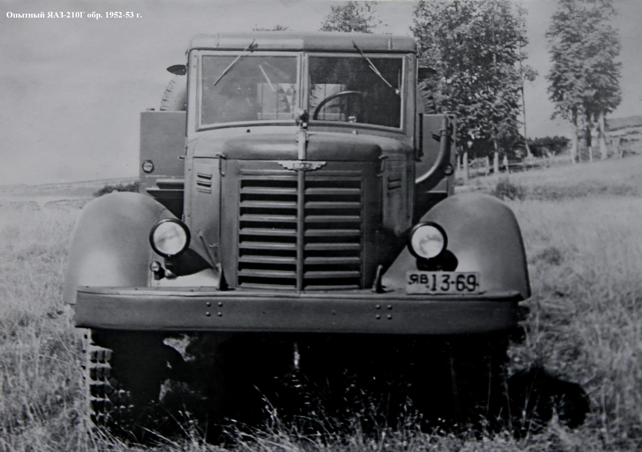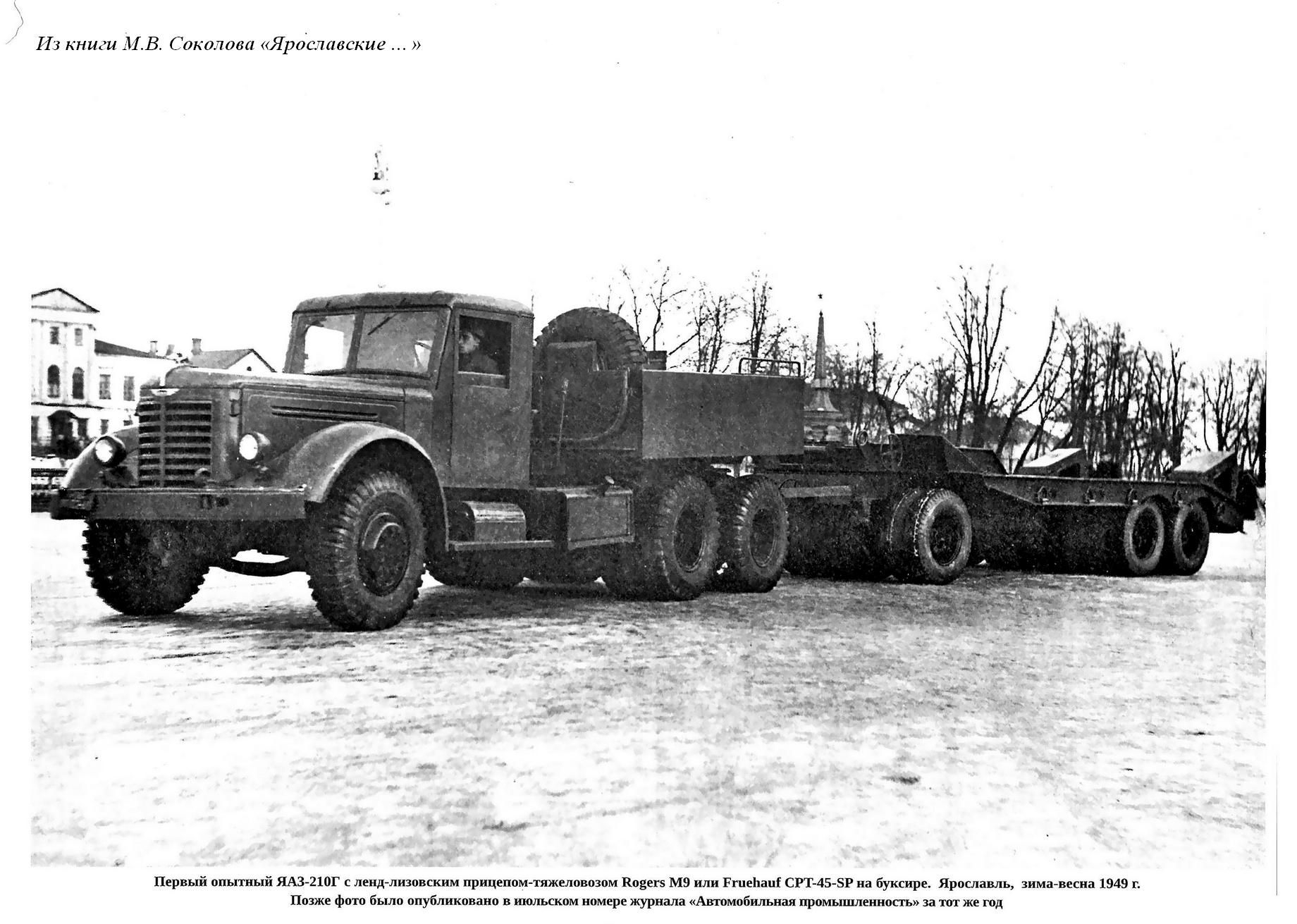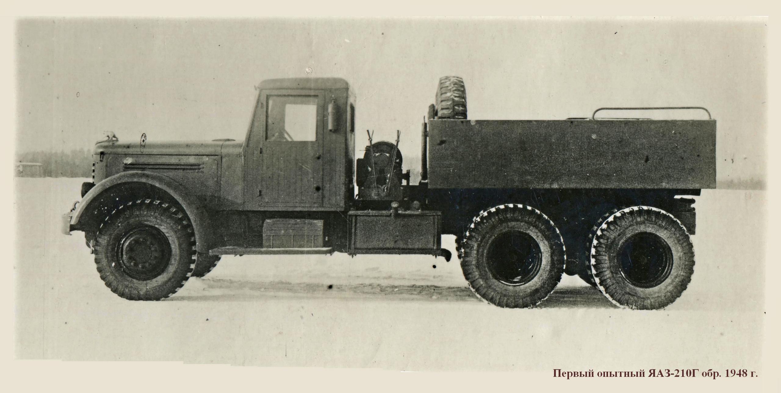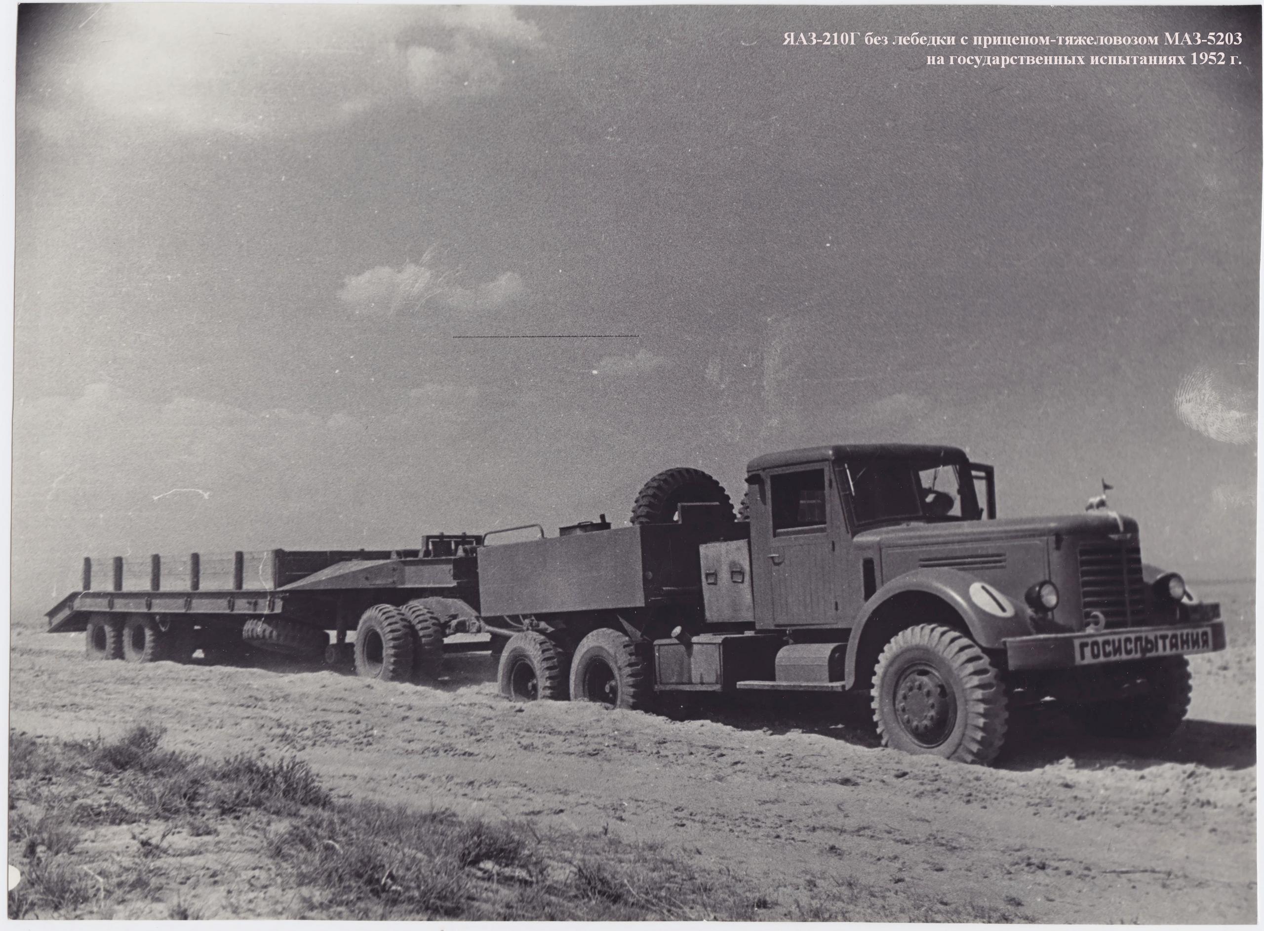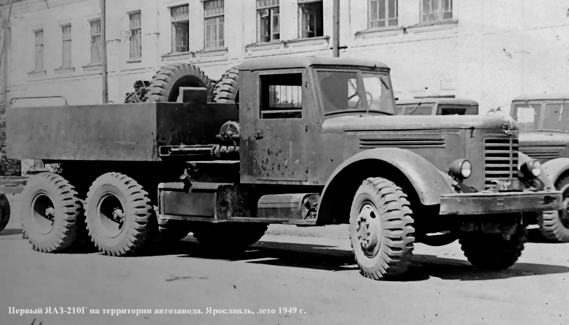 Опытный ЯАЗ-210Г действительно был построен к концу 1948 г. и оснащен форсированной версией американского дизеля GMC-6-71 мощностью 200 л.с. (установленный на тягаче экземпляр такого силового агрегата, похоже, реально выдавал до 215 л.с.), поскольку в тот момент стандартный дизель ЯАЗ-206 еще только осваивался в Ярославле, а о его форсировании речь вообще еще не шла. Однако за неимением достаточного количества таких дизелей на серийные тягачи начиная с 1951 г. пришлось устанавливать обычные 165-сильные ЯАЗ-206, что и заставило снизить показатели грузоподъемности. Собственной нагрузки ЯАЗ-210Г это не коснулось, она была определена в 8 т груза или балласта в зависимости от типа дорожного покрытия для ранних серийных машин пришлось уменьшить до 40/25 т, а для более поздних - и вовсе до 30/15 т.