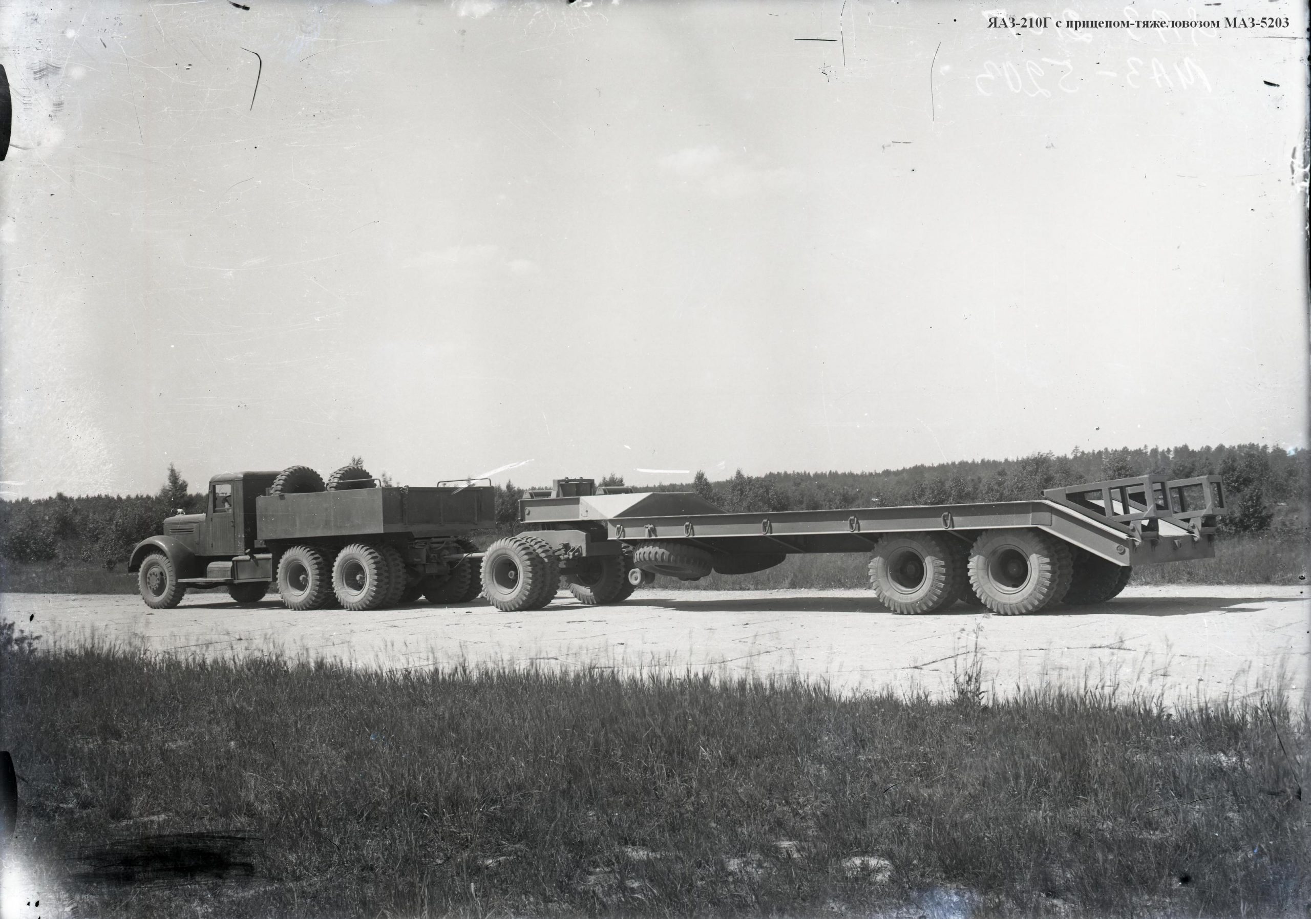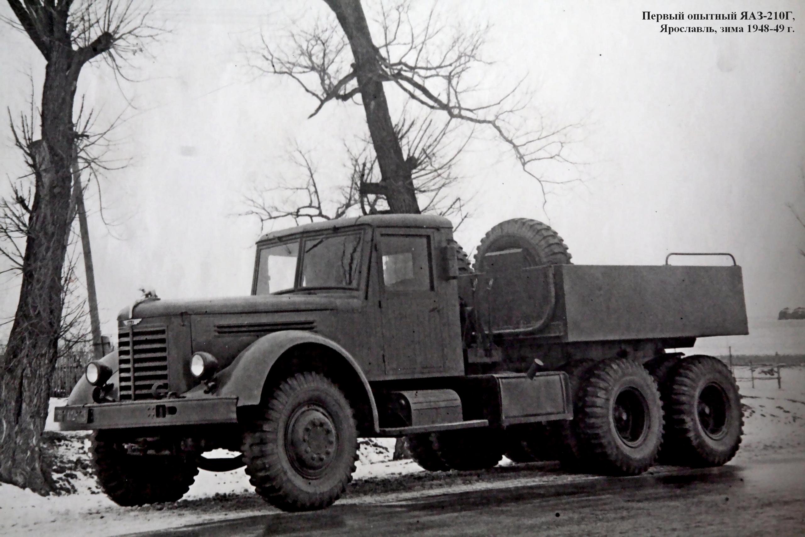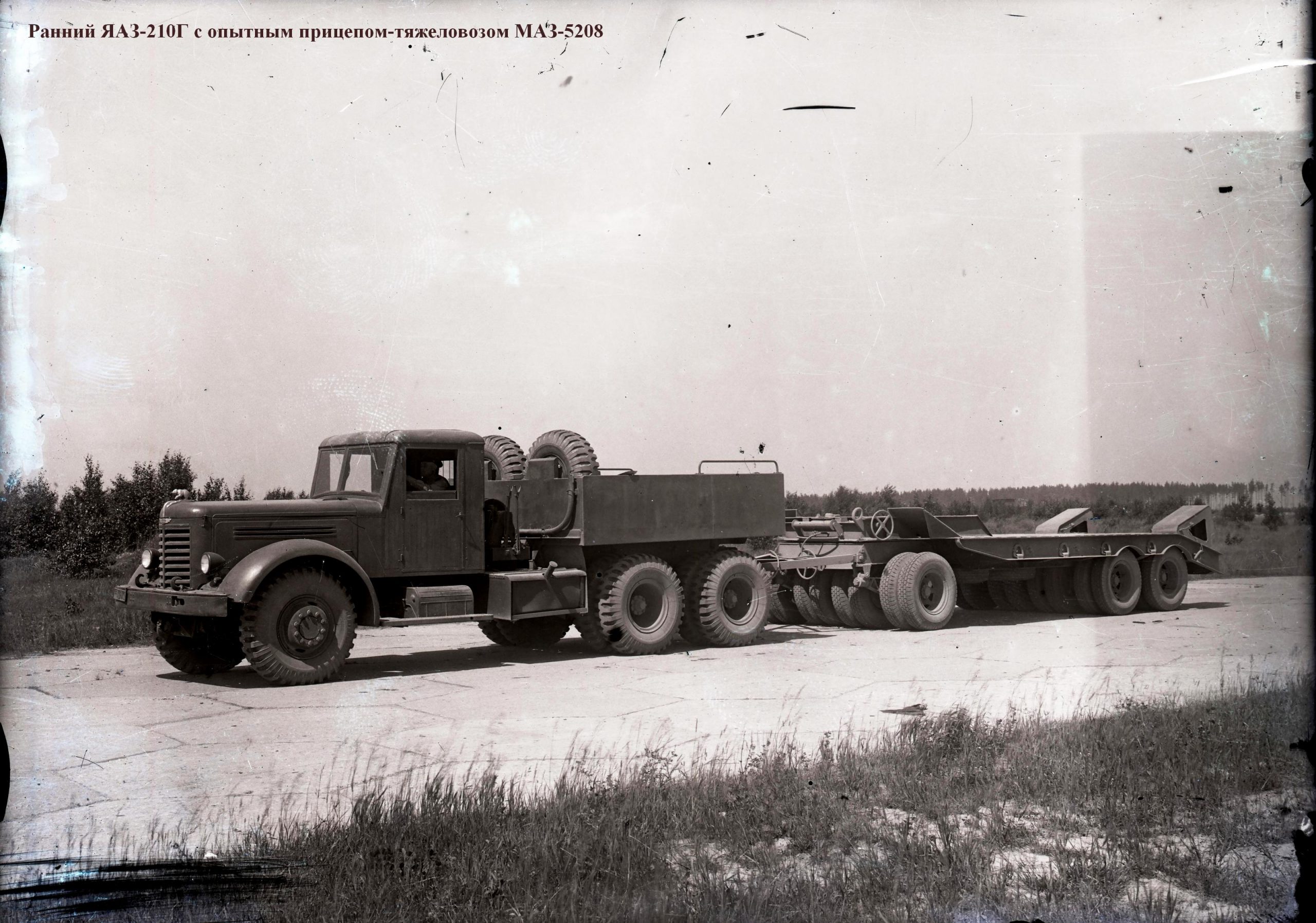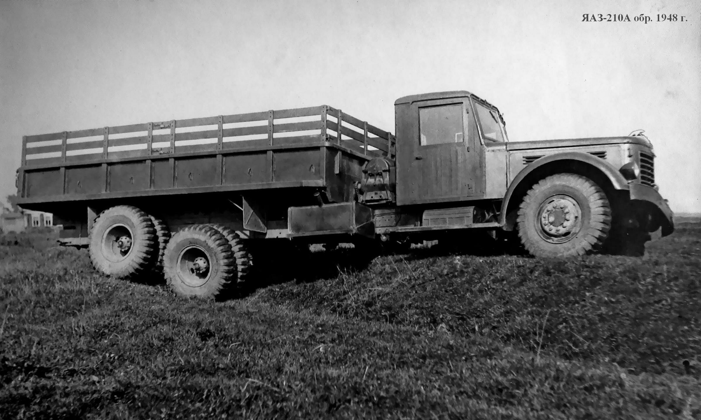 Опытный ЯАЗ-210Г действительно был построен к концу 1948 г. и оснащен форсированной версией американского дизеля GMC-6-71 мощностью 200 л.с. (установленный на тягаче экземпляр такого силового агрегата, похоже, реально выдавал до 215 л.с.), поскольку в тот момент стандартный дизель ЯАЗ-206 еще только осваивался в Ярославле, а о его форсировании речь вообще еще не шла. Однако за неимением достаточного количества таких дизелей на серийные тягачи начиная с 1951 г. пришлось устанавливать обычные 165-сильные ЯАЗ-206, что и заставило снизить показатели грузоподъемности. Собственной нагрузки ЯАЗ-210Г это не коснулось, она была определена в 8 т груза или балласта в зависимости от типа дорожного покрытия для ранних серийных машин пришлось уменьшить до 40/25 т, а для более поздних - и вовсе до 30/15 т.