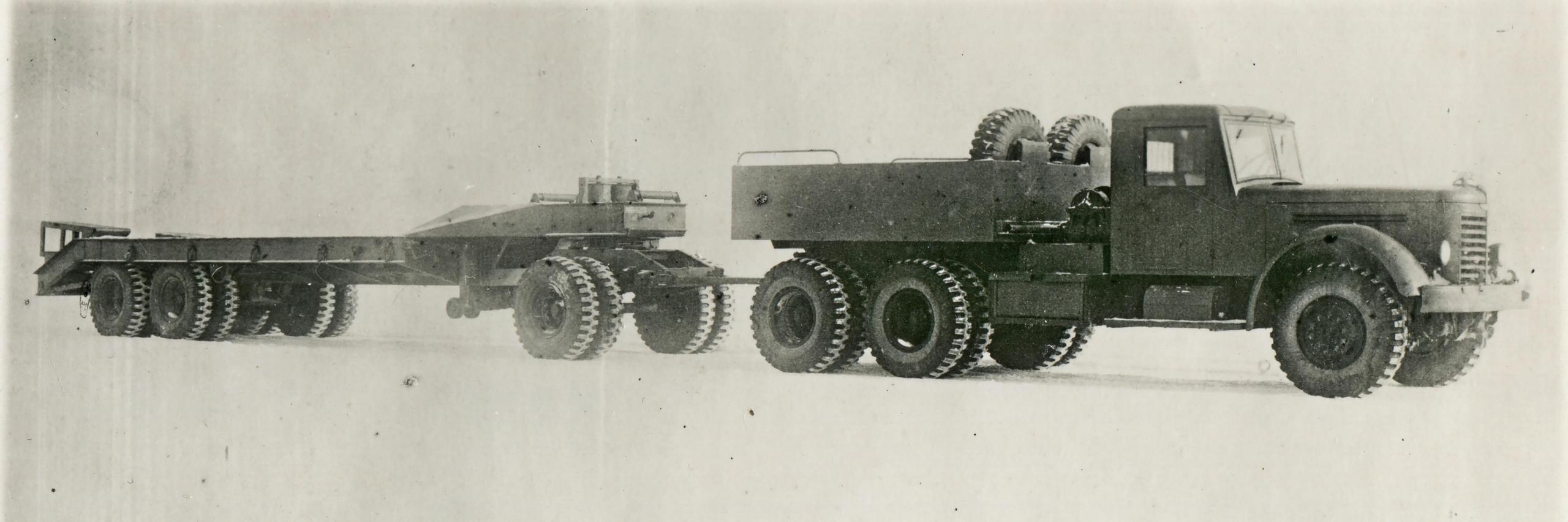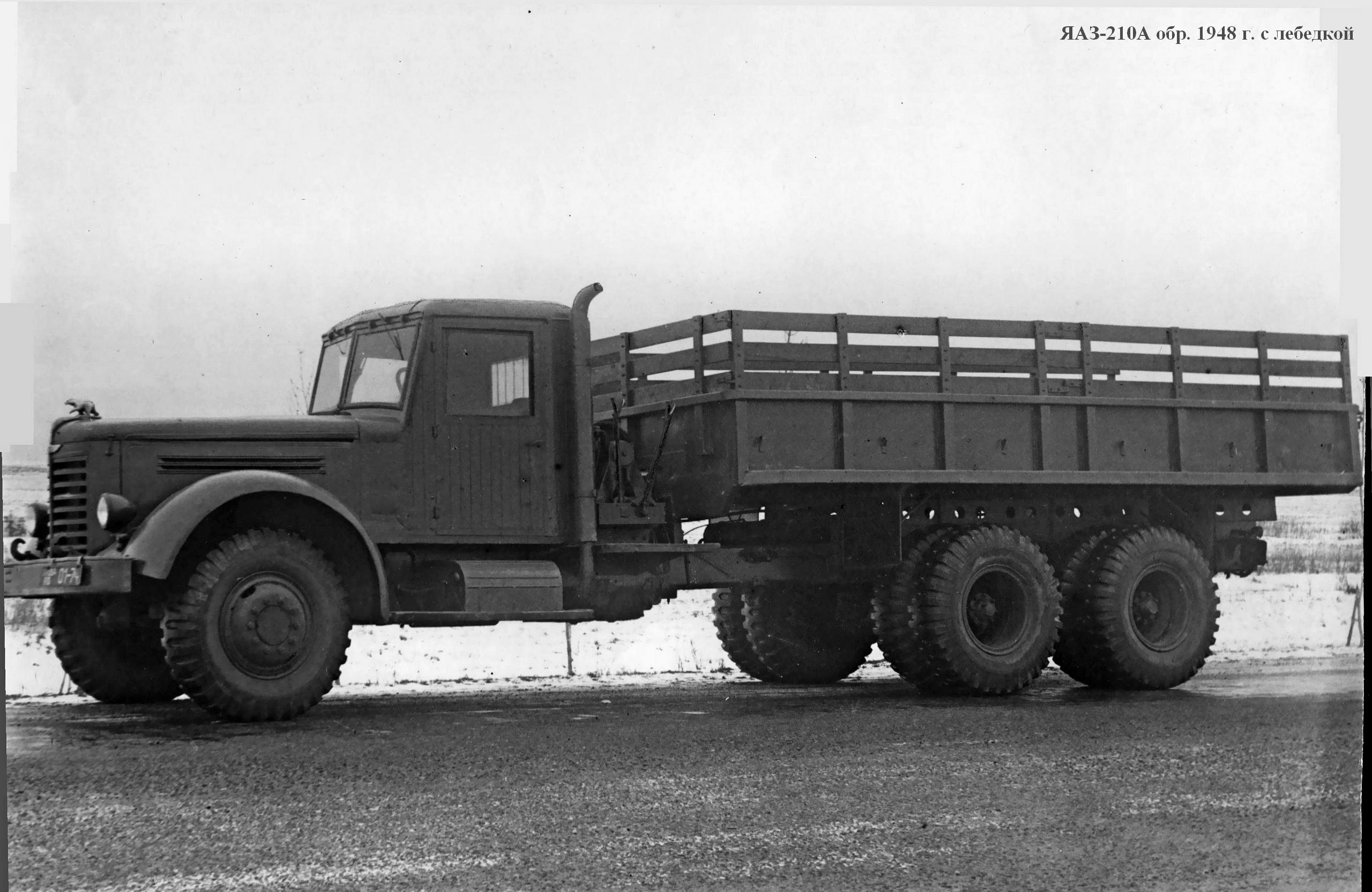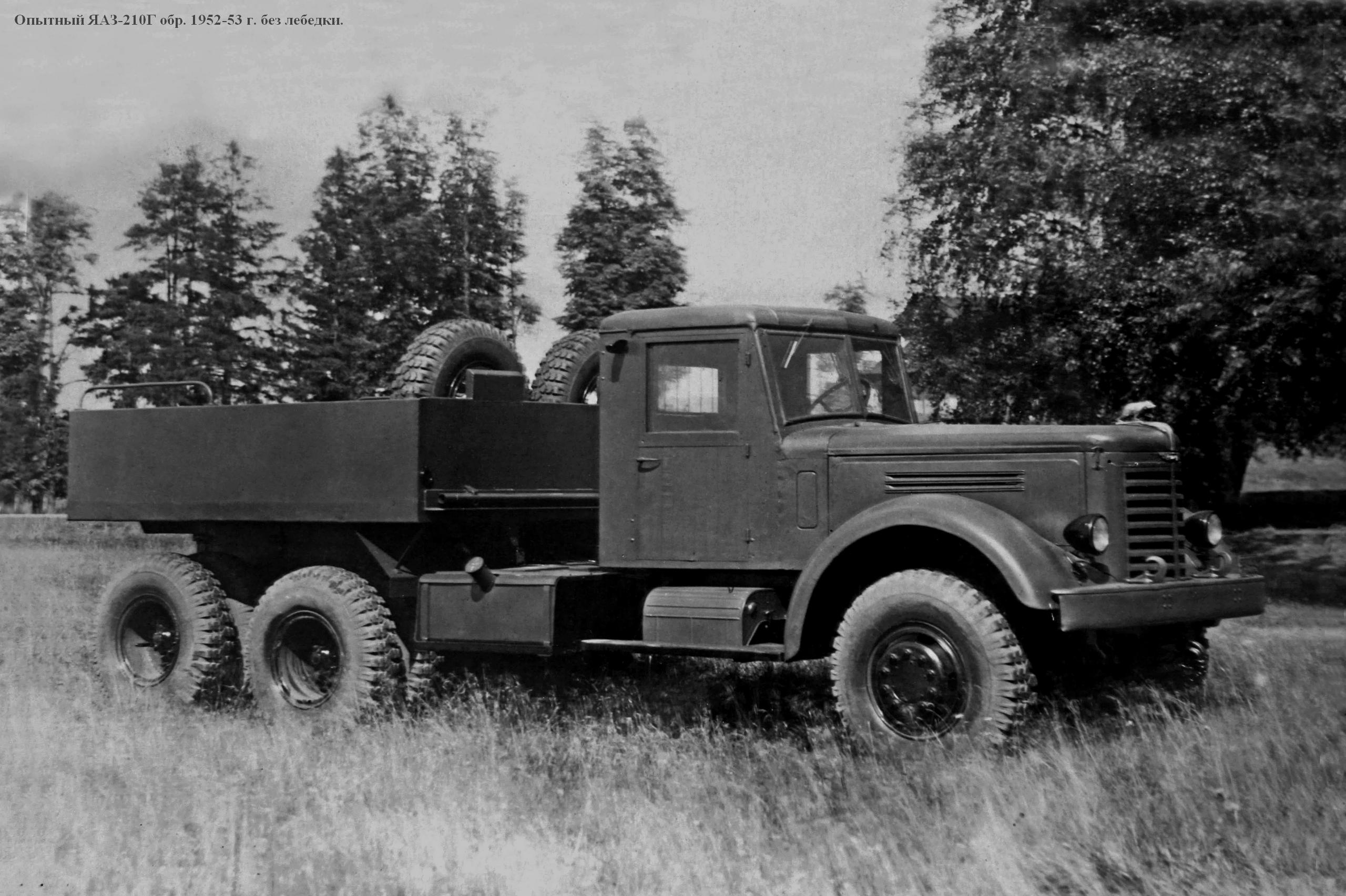 ЯАЗ-210Г 6х4 первый советский балластный тягач для перевозки на прицепе тяжелых неделимых грузов с тяговой лебедкой усилием 12 тс, мест: 3, вес: балласта до 8 тонн, буксируемого прицепа до 54 тонн, снаряжённый 12.4 тонн, с нагрузкой 20.58 тонн, максимальная скорость до 45 км/час.