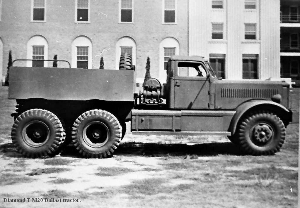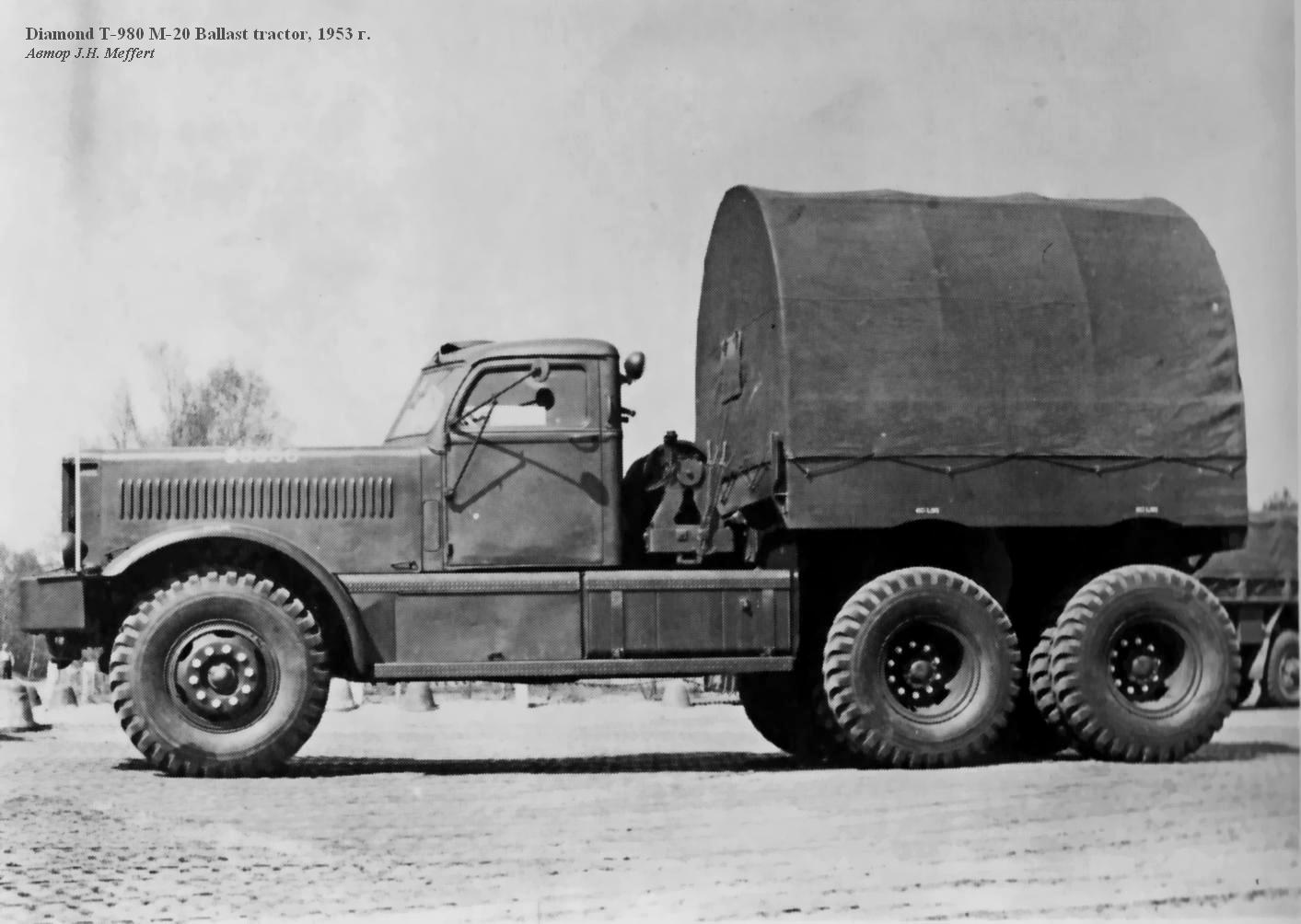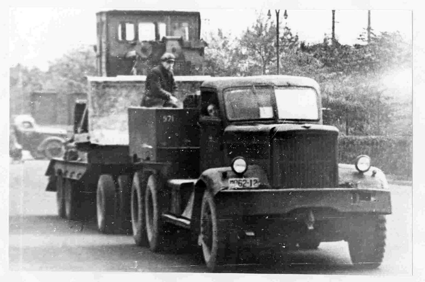 ЯАЗ-210Г 6х4 первый советский балластный тягач для перевозки на прицепе тяжелых неделимых грузов с тяговой лебедкой усилием 12 тс, мест: 3, вес: балласта до 8 тонн, буксируемого прицепа до 54 тонн, снаряжённый 12.4 тонн, с нагрузкой 20.58 тонн, максимальная скорость до 45 км/час.