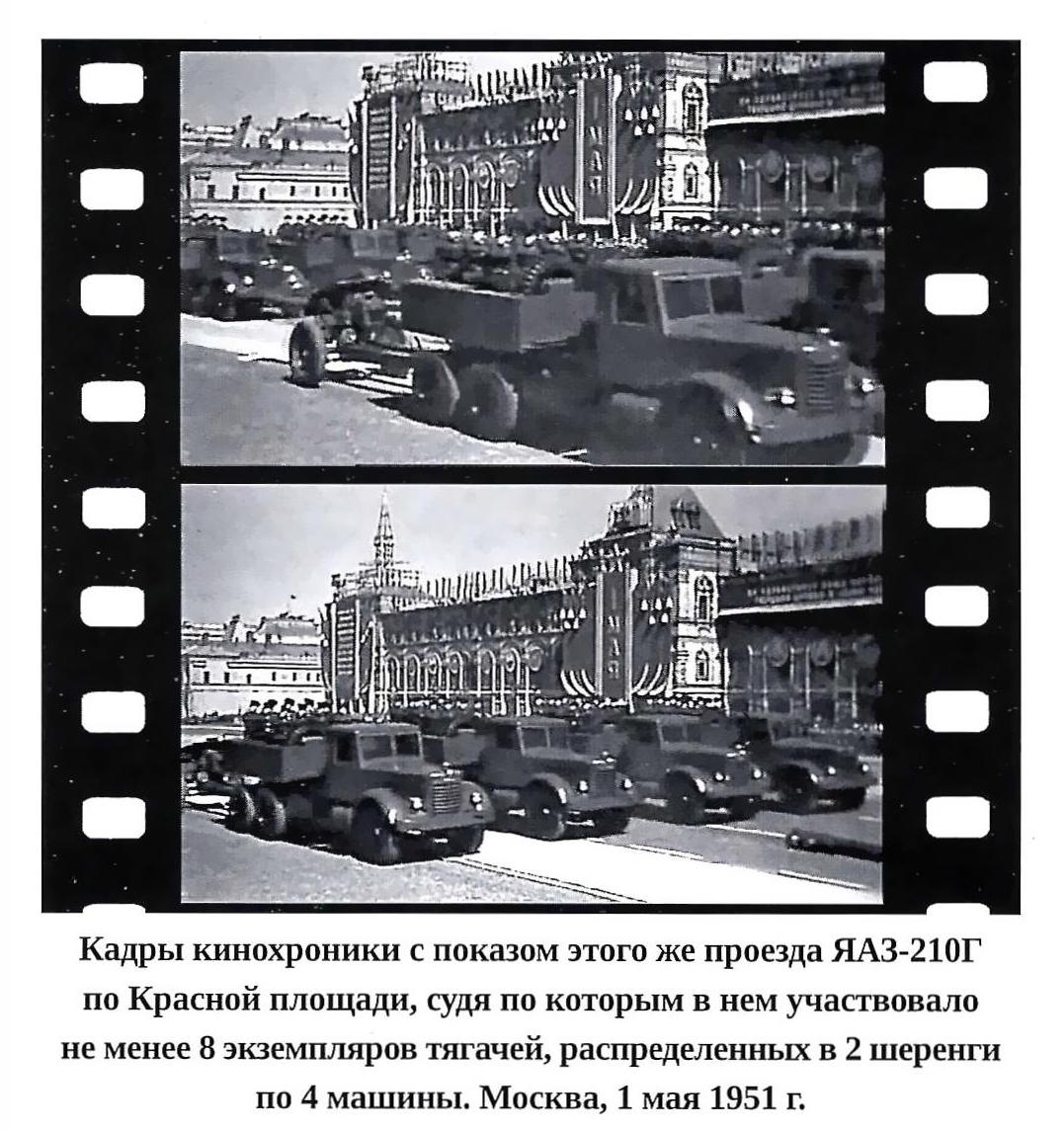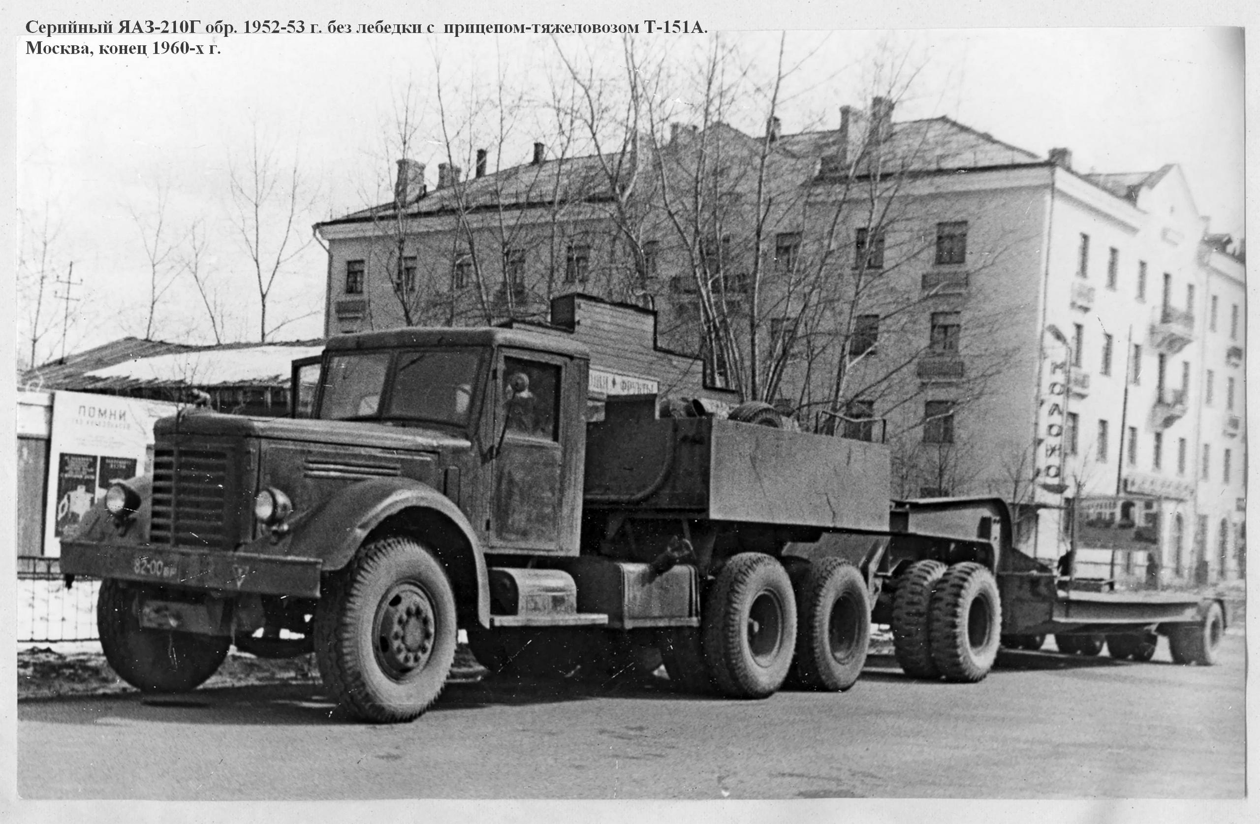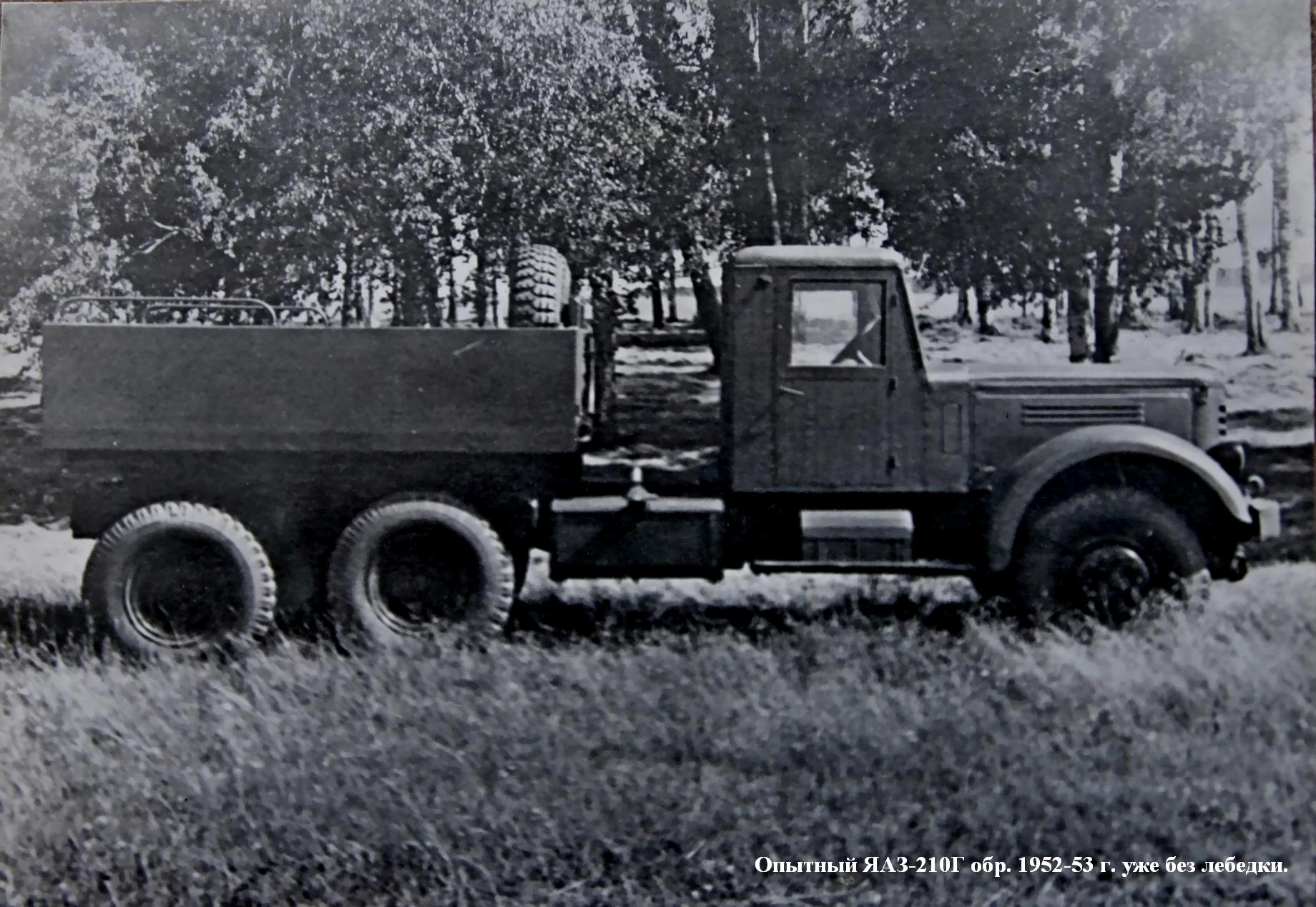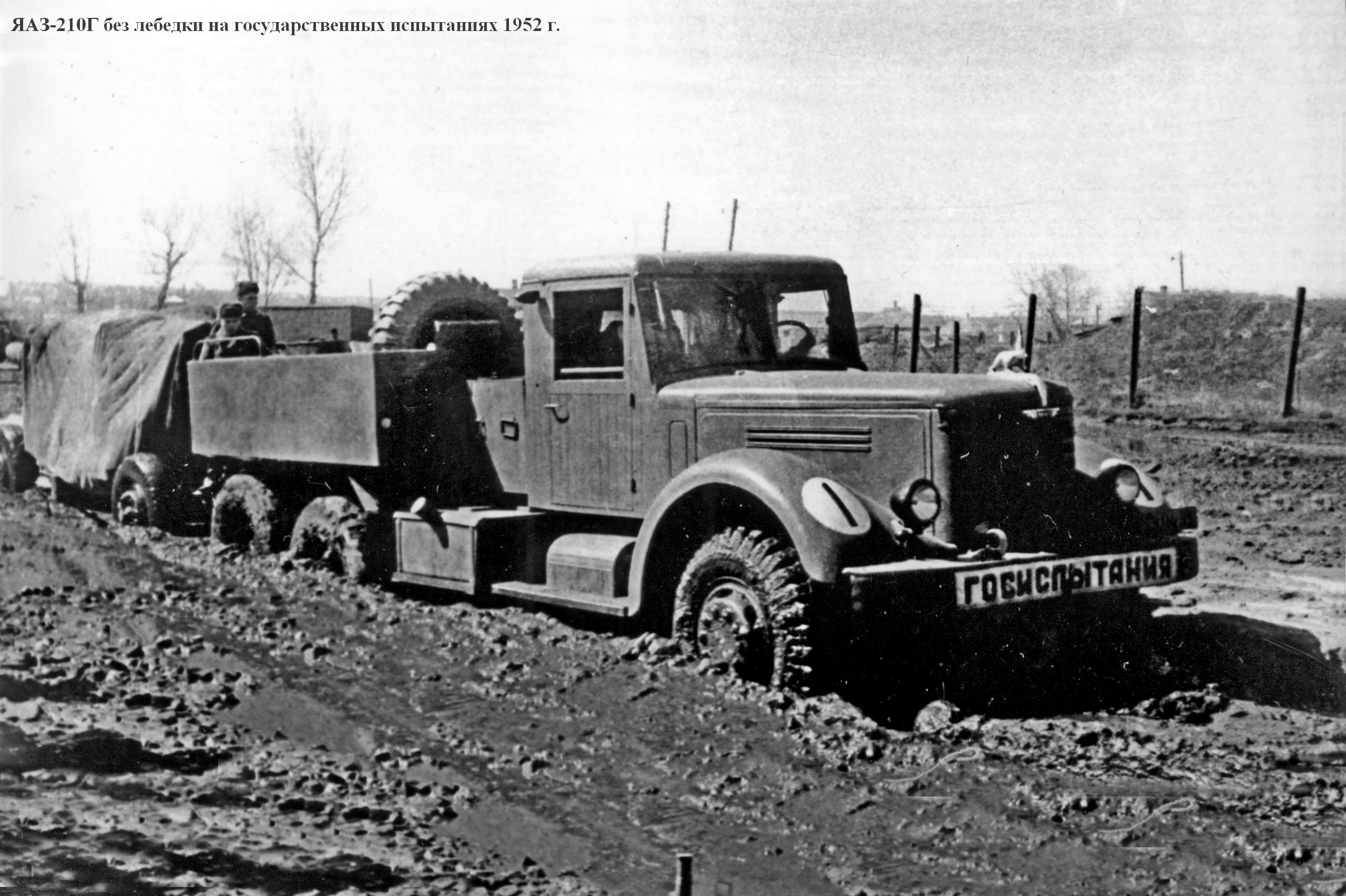 Впрочем, в выходившей в те годы справочной литературе все вышеизложенное практически никак не отражалось. Если тот факт, что с 1952 г. тягачи выпускались без лебедок, хоть изредка, но все же озвучивался, то параметры грузоподъемности (а зачастую и мощность двигателя) в справочниках по-прежнему перепечатывались с данных опытного образца, да и о полной массе буксируемого прицепа для ЯАЗ-210Г как правило умалчивали.