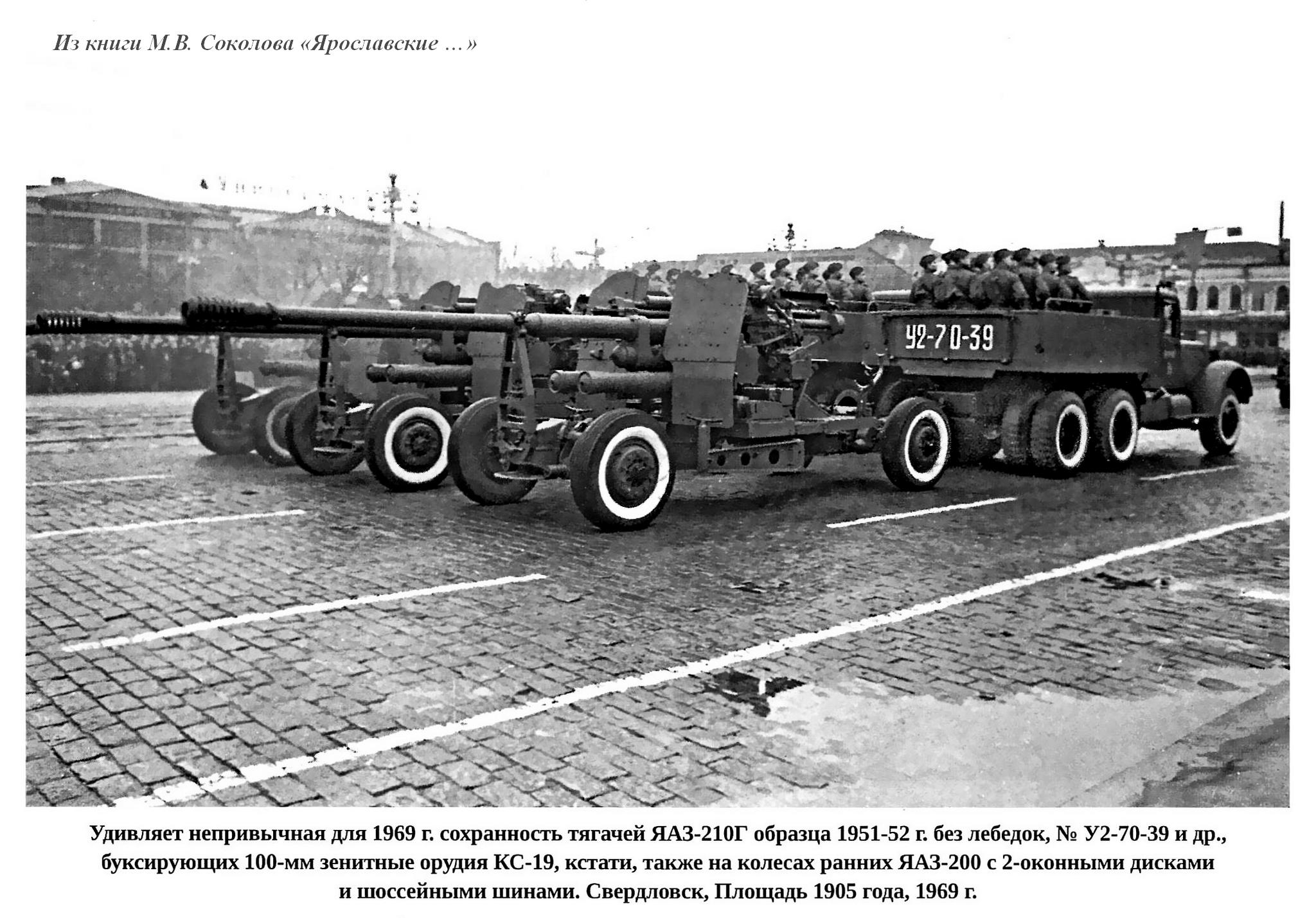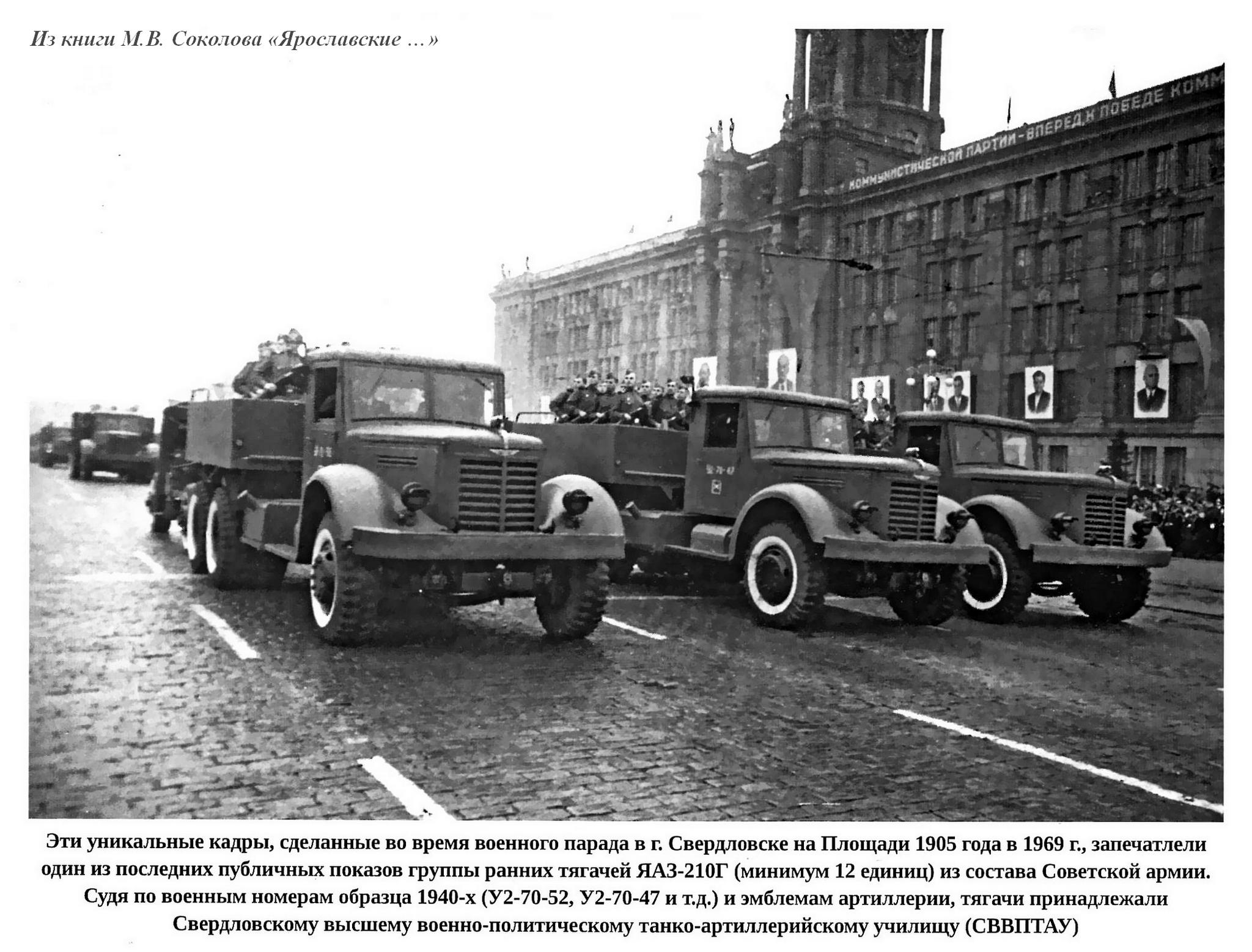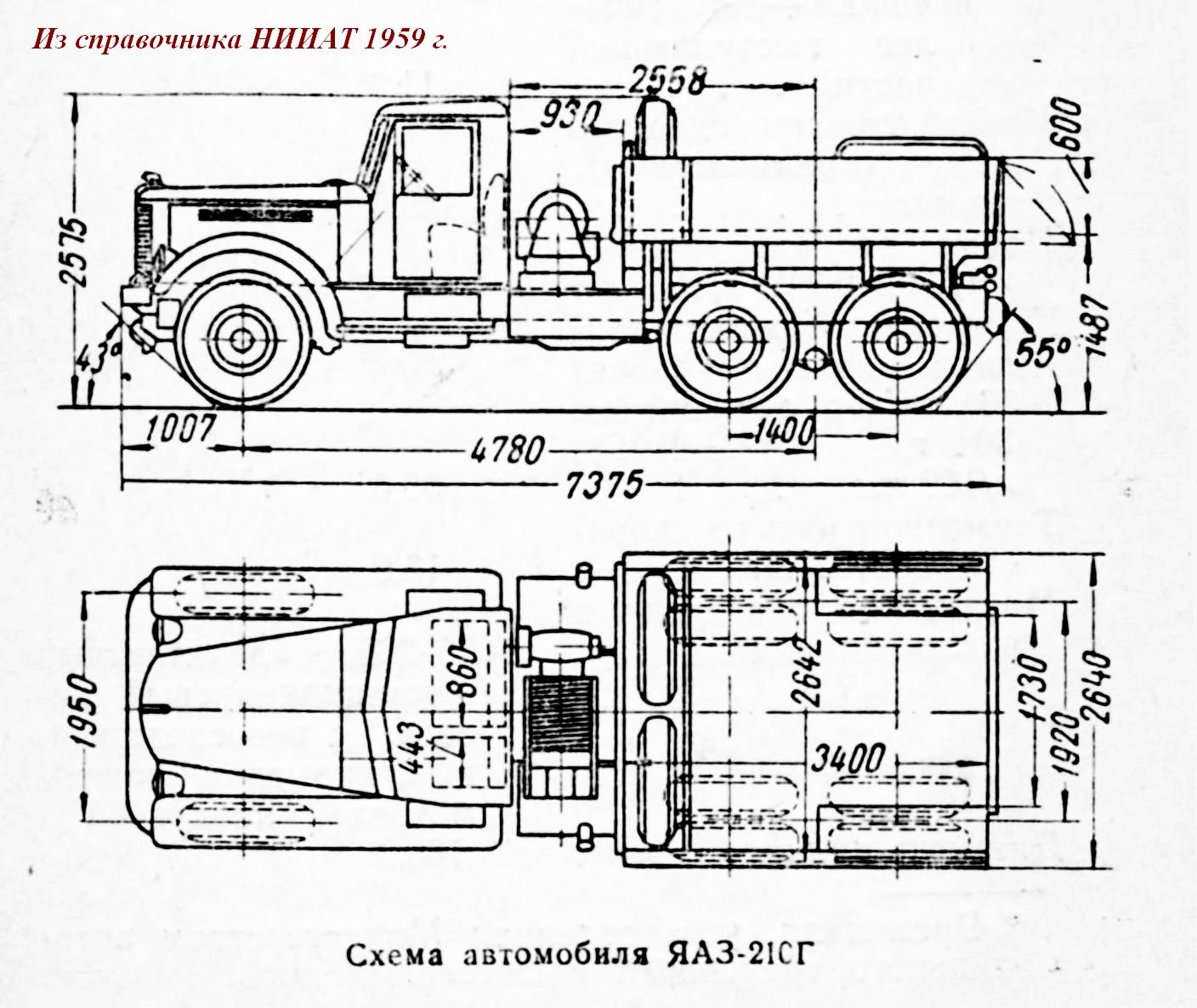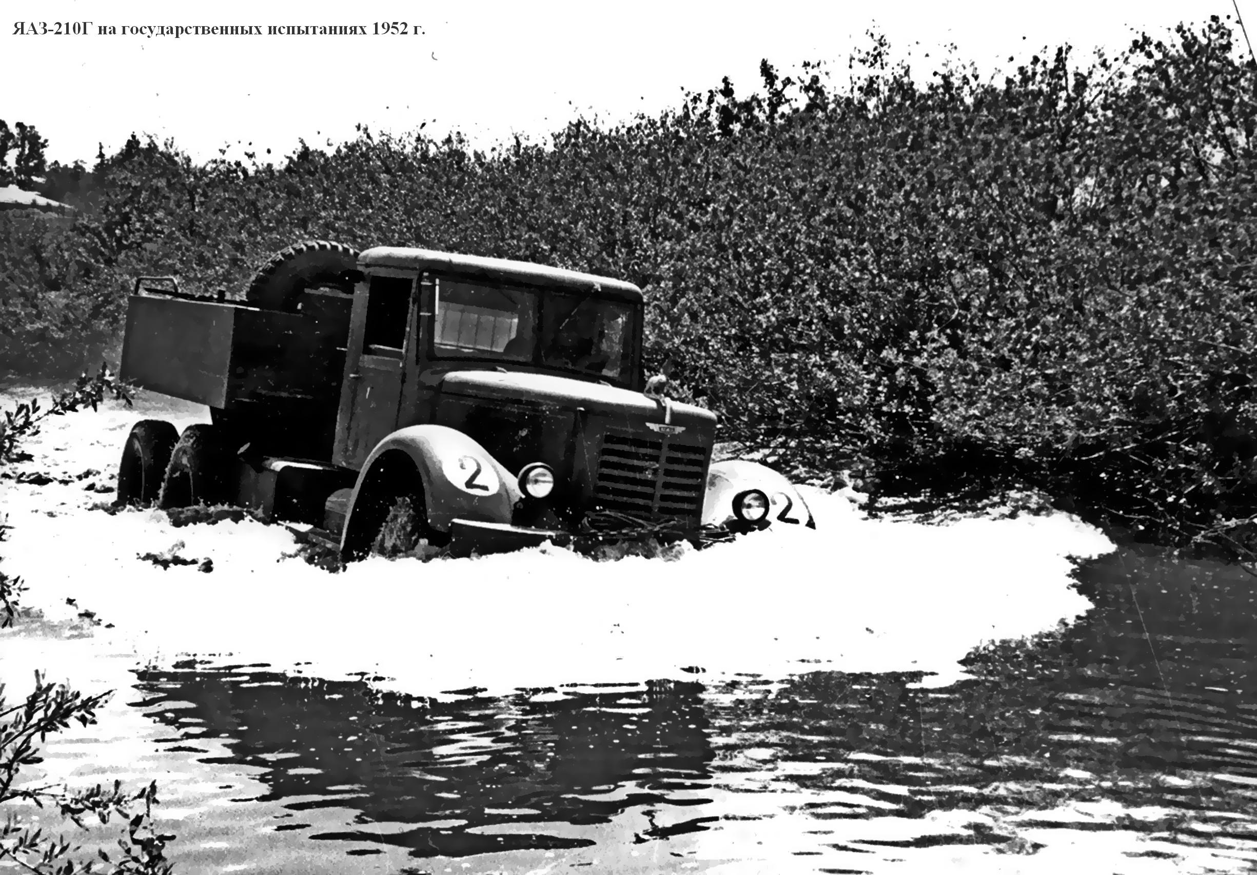 Впрочем, в выходившей в те годы справочной литературе все вышеизложенное практически никак не отражалось. Если тот факт, что с 1952 г. тягачи выпускались без лебедок, хоть изредка, но все же озвучивался, то параметры грузоподъемности (а зачастую и мощность двигателя) в справочниках по-прежнему перепечатывались с данных опытного образца, да и о полной массе буксируемого прицепа для ЯАЗ-210Г как правило умалчивали.