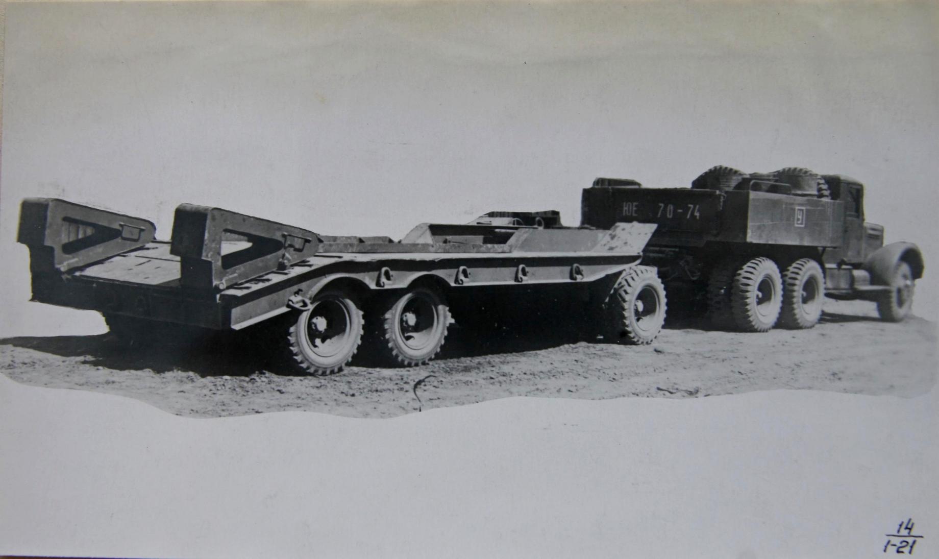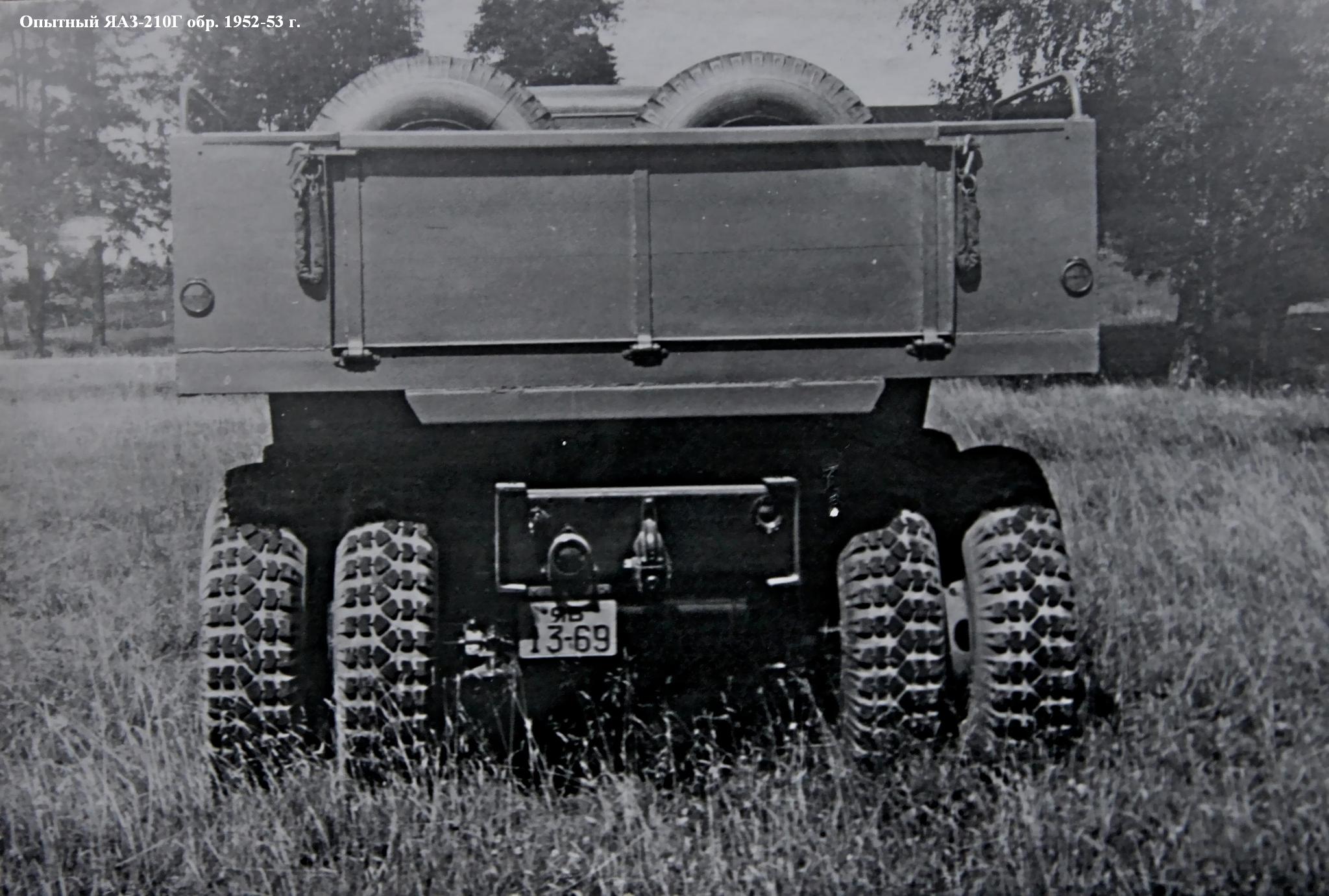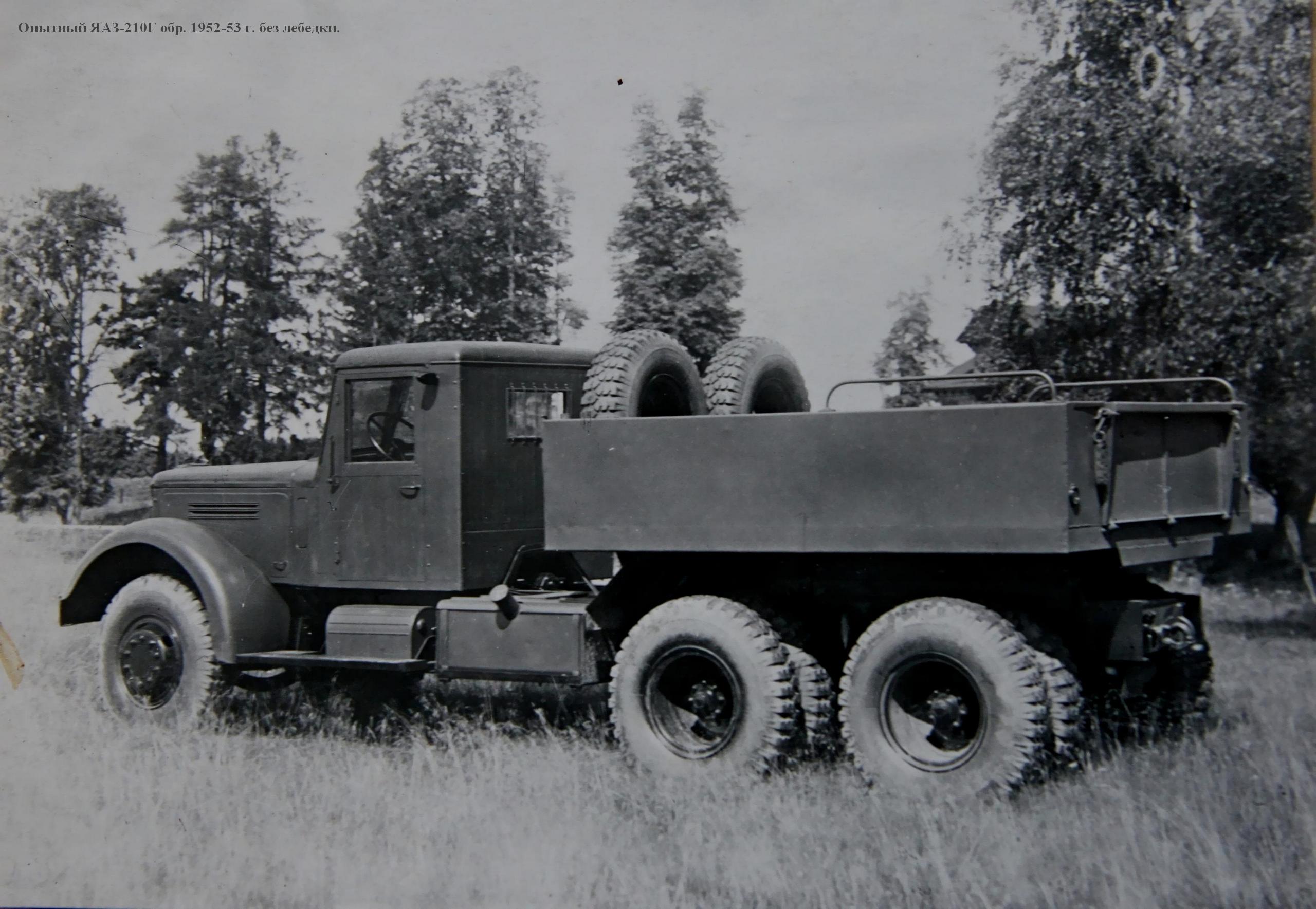 Поскольку надобность в ЯАЗ-210Г в качестве танковоза отпала, основной заказчик больше не настаивал на наличии у тягача лебедки и даже мирился с оснащением его штатным 165-сильным дизелем, но военных теперь категорически не устраивала короткая балластная платформа, тем более нелепая в отсутствие лебедки, когда между кабиной и платформой имелось пустое пространство величиной 930 мм. Вспомним кстати, что контрольные пробеговые испытания ЯАЗ-210Г, имевшие статус государственных (отчет по ним датирован апрелем 1953 г.), были проведены на образцах, которые лебедками уже не оснащались, а имели за кабиной объемные металлические ящики. Поэтому на ЯАЗе в том же 1953 г. срочно начали разработку новой универсальной платформы для «210Г». Ну а пока, тягачи продолжали некоторое время выпускать в прежнем обличии, только без лебедок.