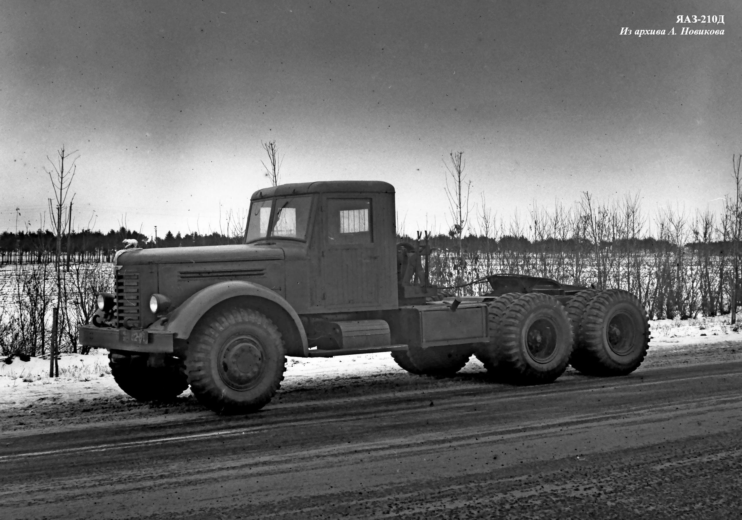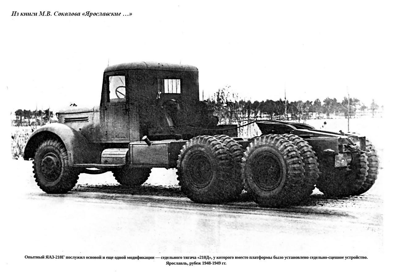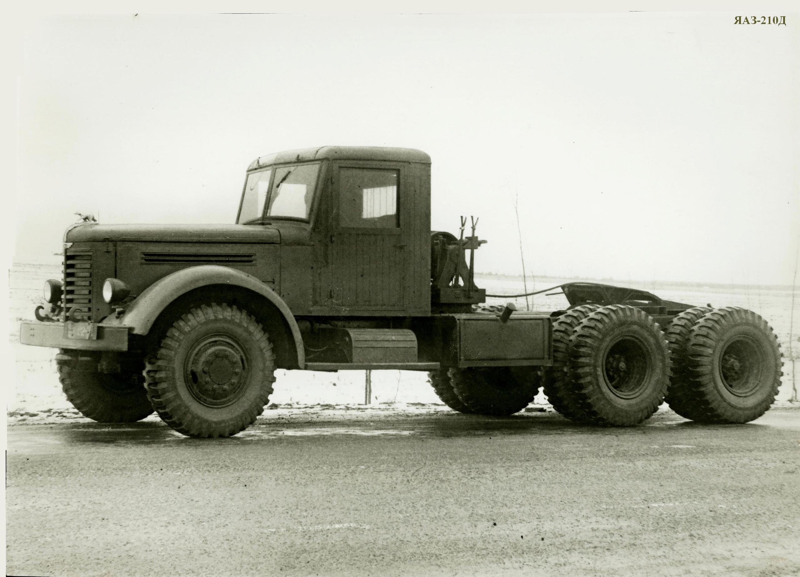 «Спроектированы и построены опытные образцы тягача ЯАЗ-210Г с балластной платформой и ЯАЗ-210Д седельного типа. База шасси обоих тягачей меньше чем у грузовика ЯАЗ-210 на 970 мм и составляет 4780 мм. Свес рамы от центра тележки до конца лонжеронов уменьшен на 1000 мм - до 1450 мм. Раздаточная коробка смещена вперед на 359 мм. Карданные валы от раздаточной коробки к задней тележке укорочены на 611 мм. Усилена задняя буксирная поперечина рамы. Крепление запасных колес снято с шасси и перенесено в балластную платформу.