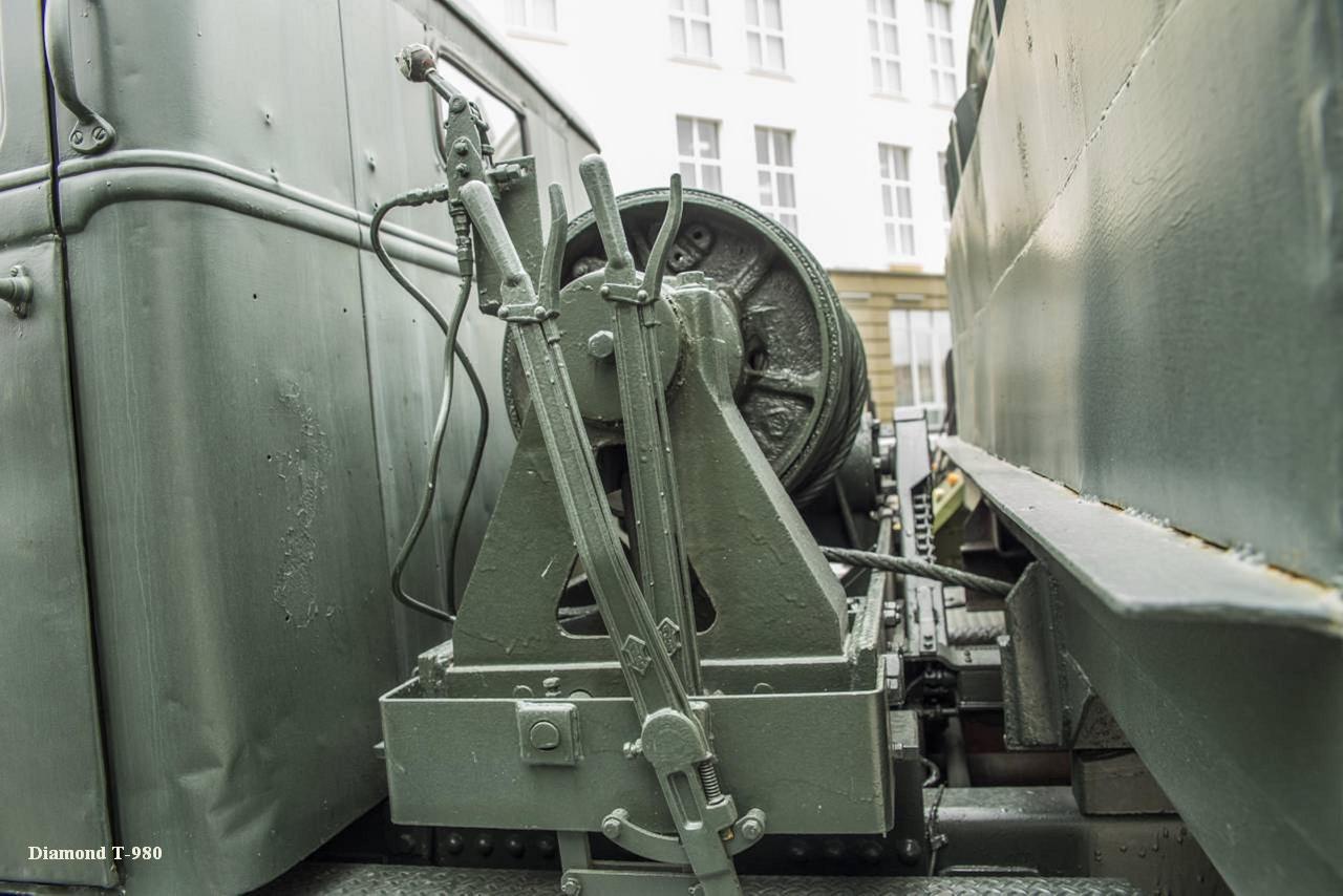 … самое интересное - лебедка. На основании анализа всех имеющихся данных с уверенностью можно сделать вывод о том, что на ранних тягачах ЯАЗ-210Г устанавливались импортные американские тяговые лебедки, а когда их запас уже в 1952 г. был исчерпан (всего ими удалось оснастить не более двух десятков «210Г»), от лебедок попросту отказались. Сложности в их освоении отечественной промышленностью в общем-то не было, но все дело здесь заключалось в назначении. Как правило, такие лебедки в армейской эксплуатации предназначались для затаскивания поврежденной бронетанковой техники на бускируемые низкорамные прицепы-тяжеловозы (именно для этого они устанавливались на тех же «Даймондах»). Однако ввиду ограничения грузоподъемности таких прицепов для ЯАЗ-210Г на грунте до 25 т, они мог перевозить разве что легкие танки и САУ типа СУ-76М, поскольку средние и тяжелые танки, появившиеся в конце войны, значительно превышали указанную массу. Другой областью применения тяговых лебедок на балластных тягачах было раздельное преодоление особо тяжелых участков: автомобиль расцеплялся с прицепом-тяжеловозом; преодолевал крутой подъем, заболоченность, глубокие колеи и т.п.; после чего подтягивал с помощью лебедки прицеп с грузом. Однако в этом случае не полноприводный балластный тягач являлся не самым лучшим решением проблемы. Еще одним назначением лебедки могло быть использование ее для самовытаскивания автомобиля, но опять же, ввиду колесной формулы 6x4 оно и здесь оказывалось мало применимым. Поэтому даже образцы ЯАЗ-210Г, предоставленные для Государственных испытаний, уже не имели лебедок (как и отверстий с левой стороны бампера), а на их месте были размещены закрытые металлические ящики.