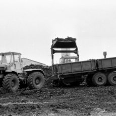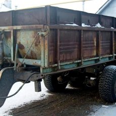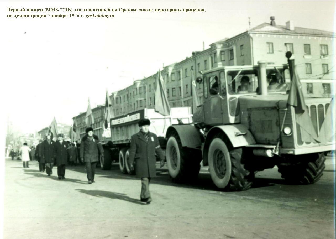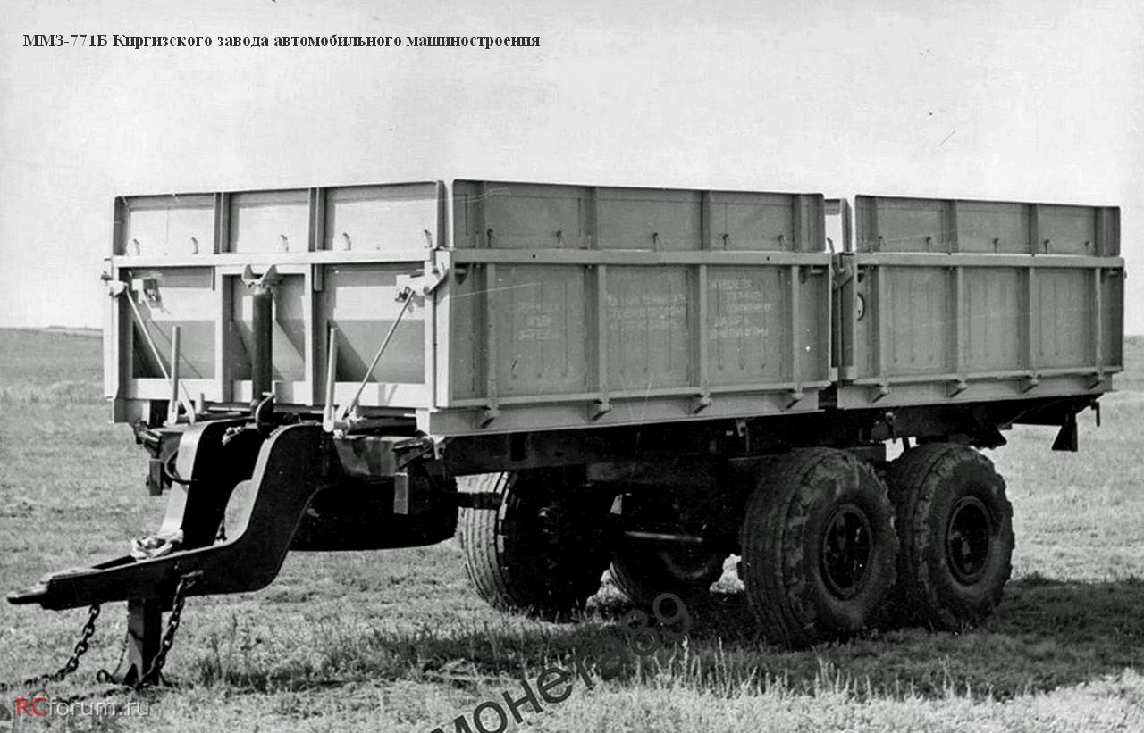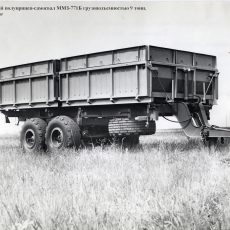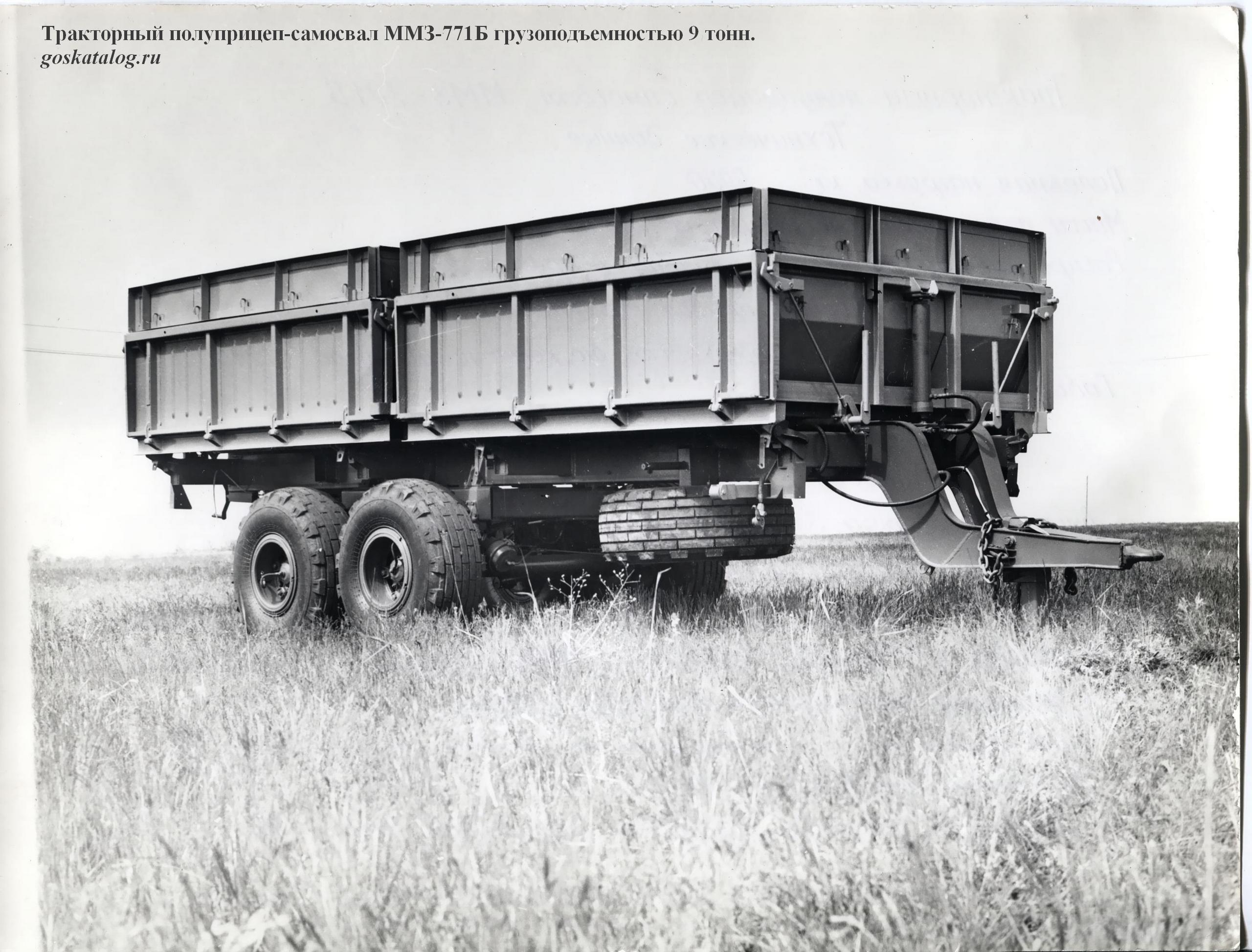ММЗ-771 (1-ПТС-9) полунавесной 2-осный самосвальный тракторный прицеп грузоподъемностью 9 тонн для перевозки сельскохозяйственных грузов в составе тракторного поезда по всем видам дорог и в полевых условиях, выгрузка боковая, объем кузова: 8.5 м3, с надставками до 17.4 м3, снаряженный вес 4.6 тонн, максимальная скорость до 33 км/час, ЧМЗАТП, г. Челябинск, 1966-72 год выпуска.