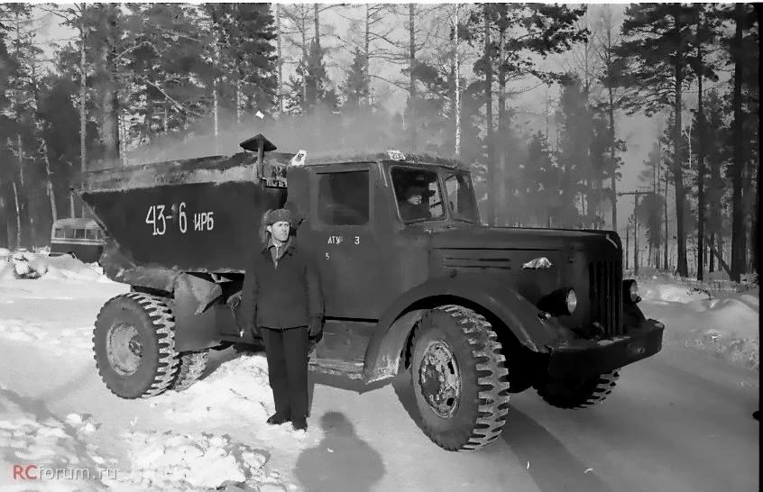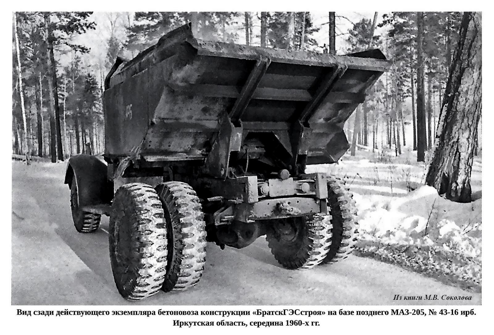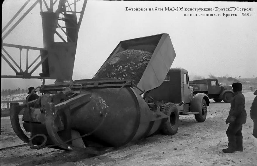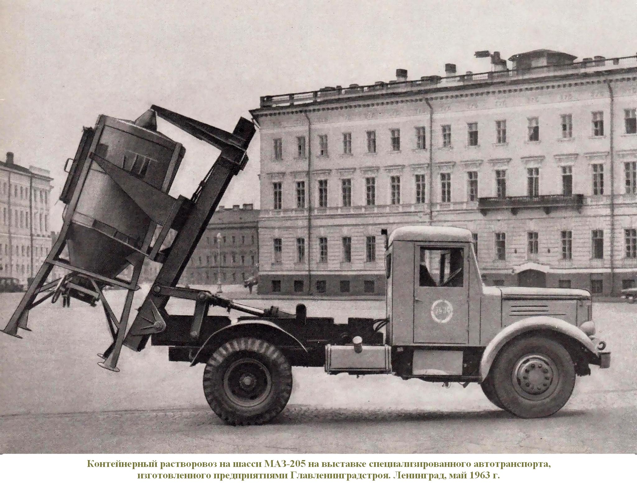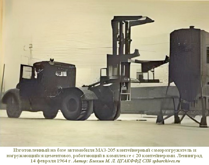 Станислав, Стас-джан rcforum.ru … от ленинградских разработчиков и эксплуатантов: "...Для транспортирования вяжущих материалов, гарцованных смесей, сухого песка и т. п. по предложению инженеров А.Д. Бабича и И.М. Кувшинова была разработана конструкция так называемого контейнерного цементовоза. Он базируется на автомашине МАЗ-205 и представляет собой комплекс механизмов для погрузки и разгрузки контейнерных ёмкостей, а также их фиксации в транспортном положении. Компоновка механизмов и схема работы контейнеровоза состоят в следующем: на автомашине МАЗ-205 монтируется надрамник и рама с захватами, с помощью которых производится подъём и опускание контейнерной ёмкости, а также гидропривод для поворота рамы относительно точки её шарнирного сочленения с надрамником и перемещения каретки с захватами в направляющих рамы.
