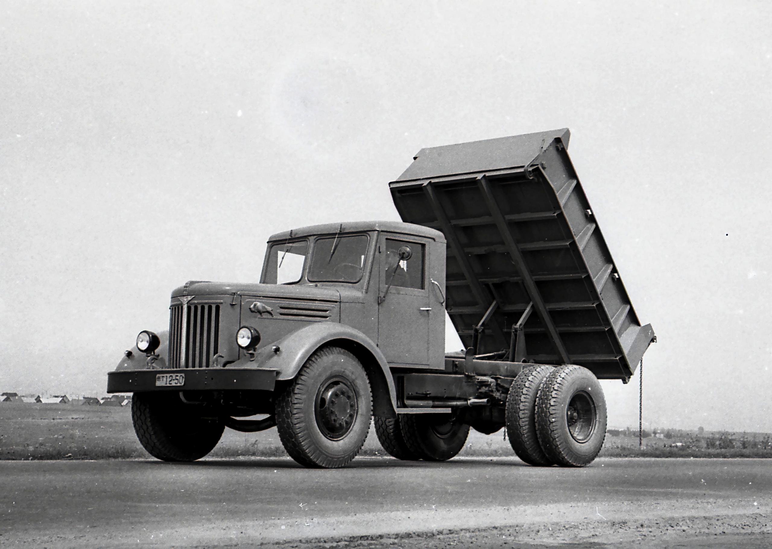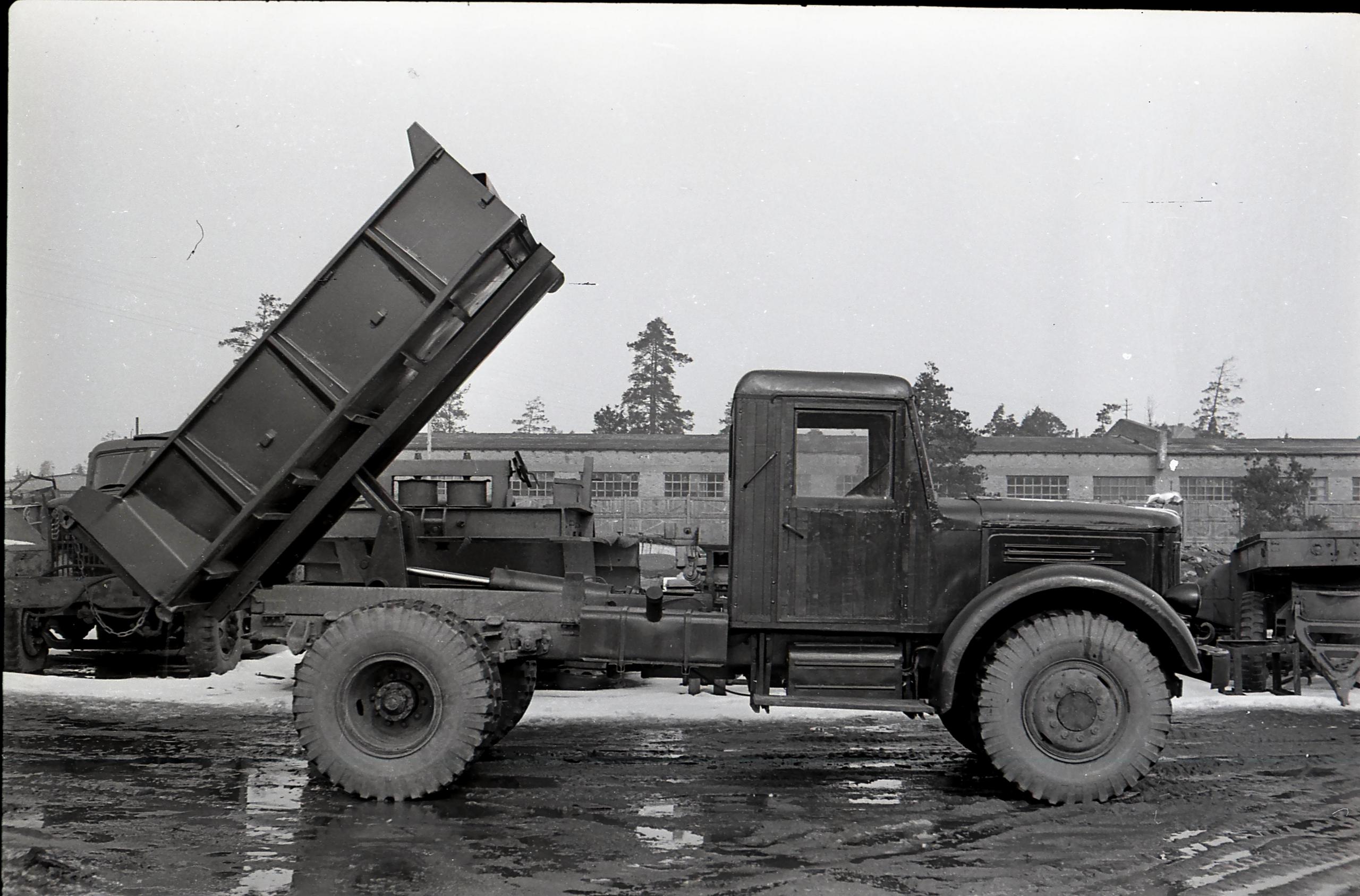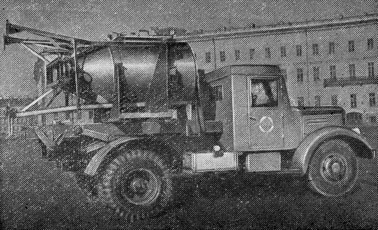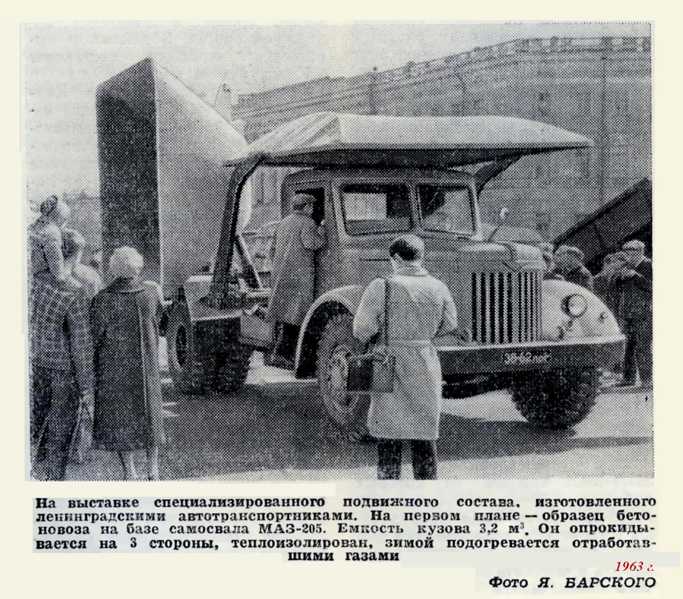 Опытный растворовоз на шасси МАЗ-205 с погрузочно-разгрузочным гидроподъемником