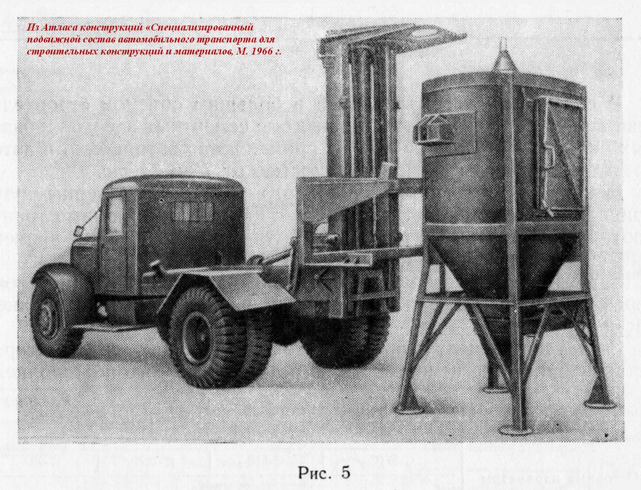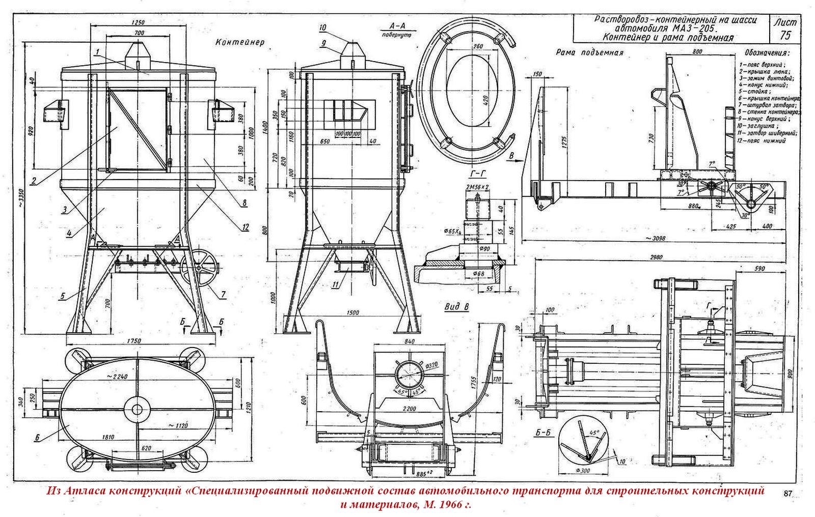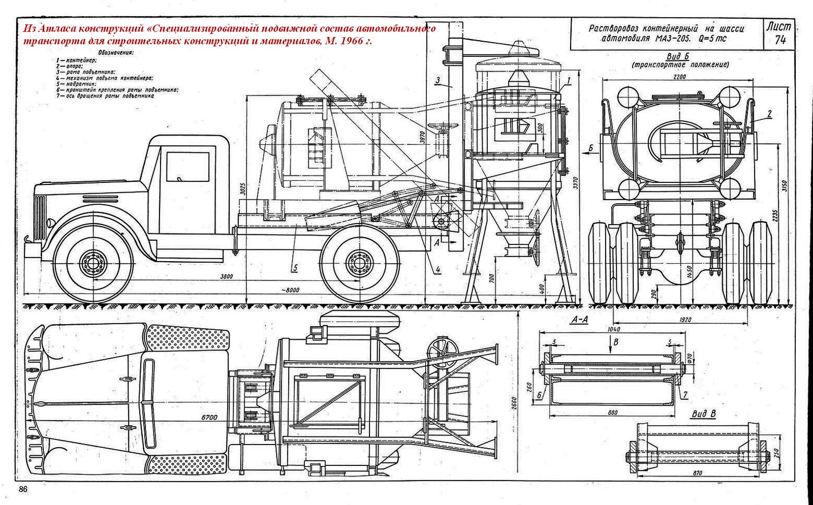 Растворовоз контейнерный на шасси автомобиля МАЗ-205 (СКБ Леноргстрой, листы 74, 75, рис. 5). На раме автомобиля МАЗ-205 установлен надрамник с рамой подъемника. Рама подъемника поднимается в вертикальное положение с помощью тяг и двух гидроцилиндров. На раме подъемника установлена подвижная каретка с длиной хода 600 мм. Каретка служит для подъема и опускания контейнера.