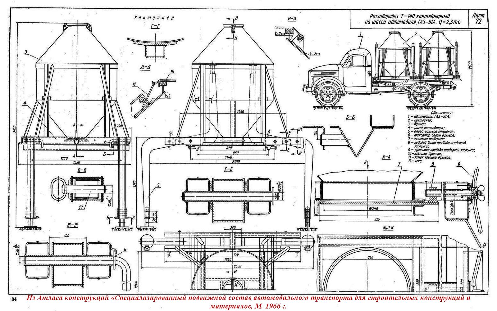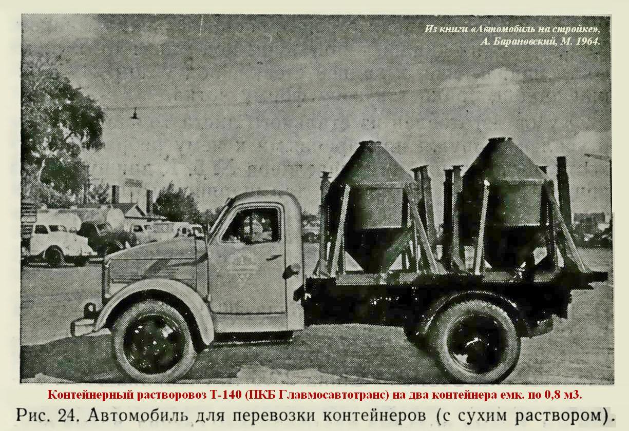 Растворовоз Т-140 контейнерный (ПКБ Главмосавтотранс, листы 72, 73), изготовленный на базе автомобиля ГАЗ-51 А, перевозит два контейнера емкостью по 0,8 м3 каждый.