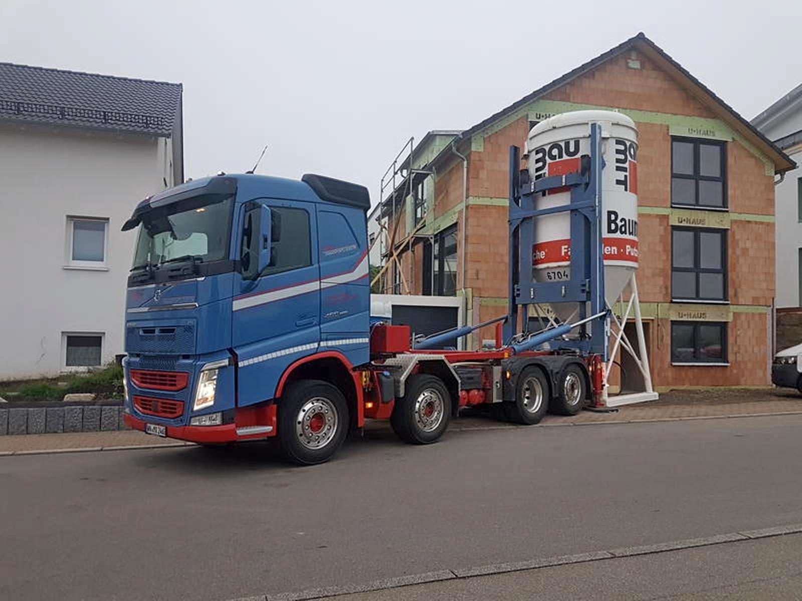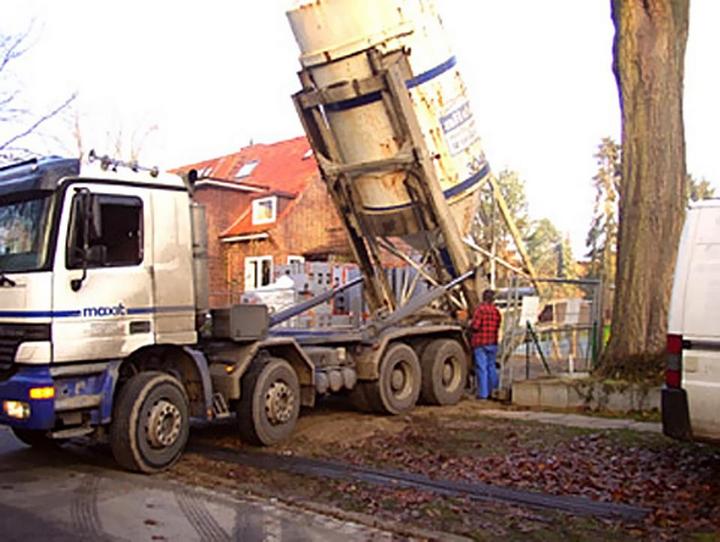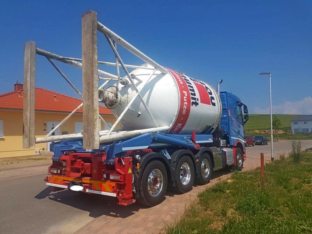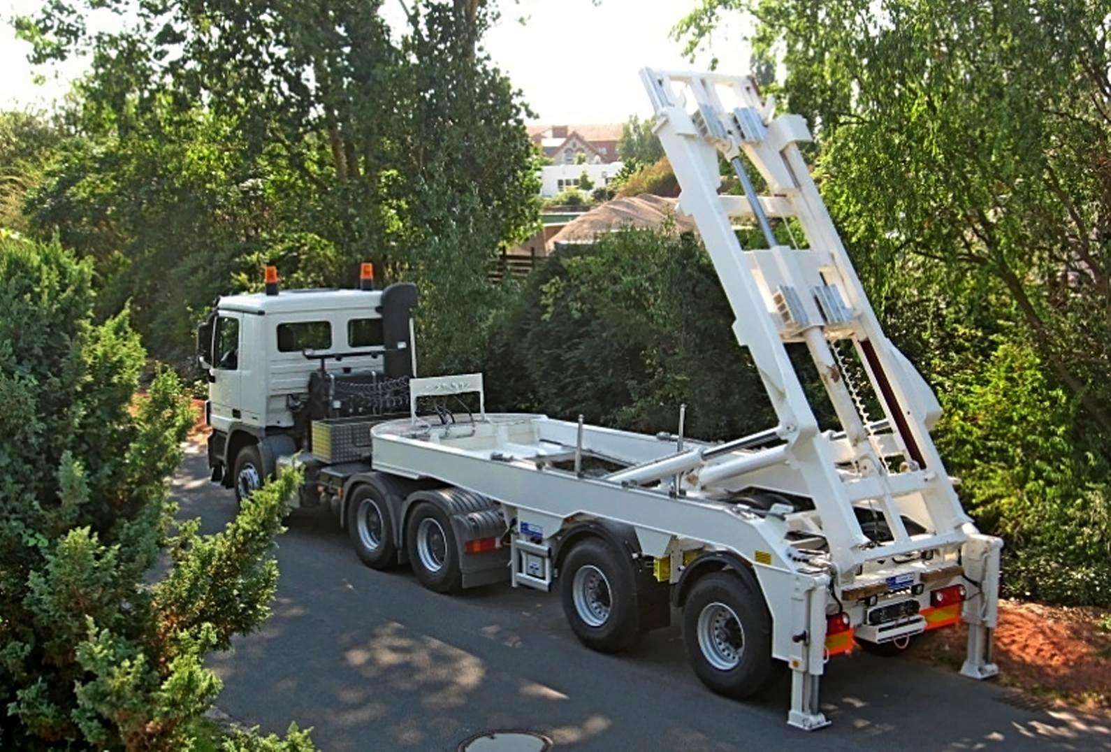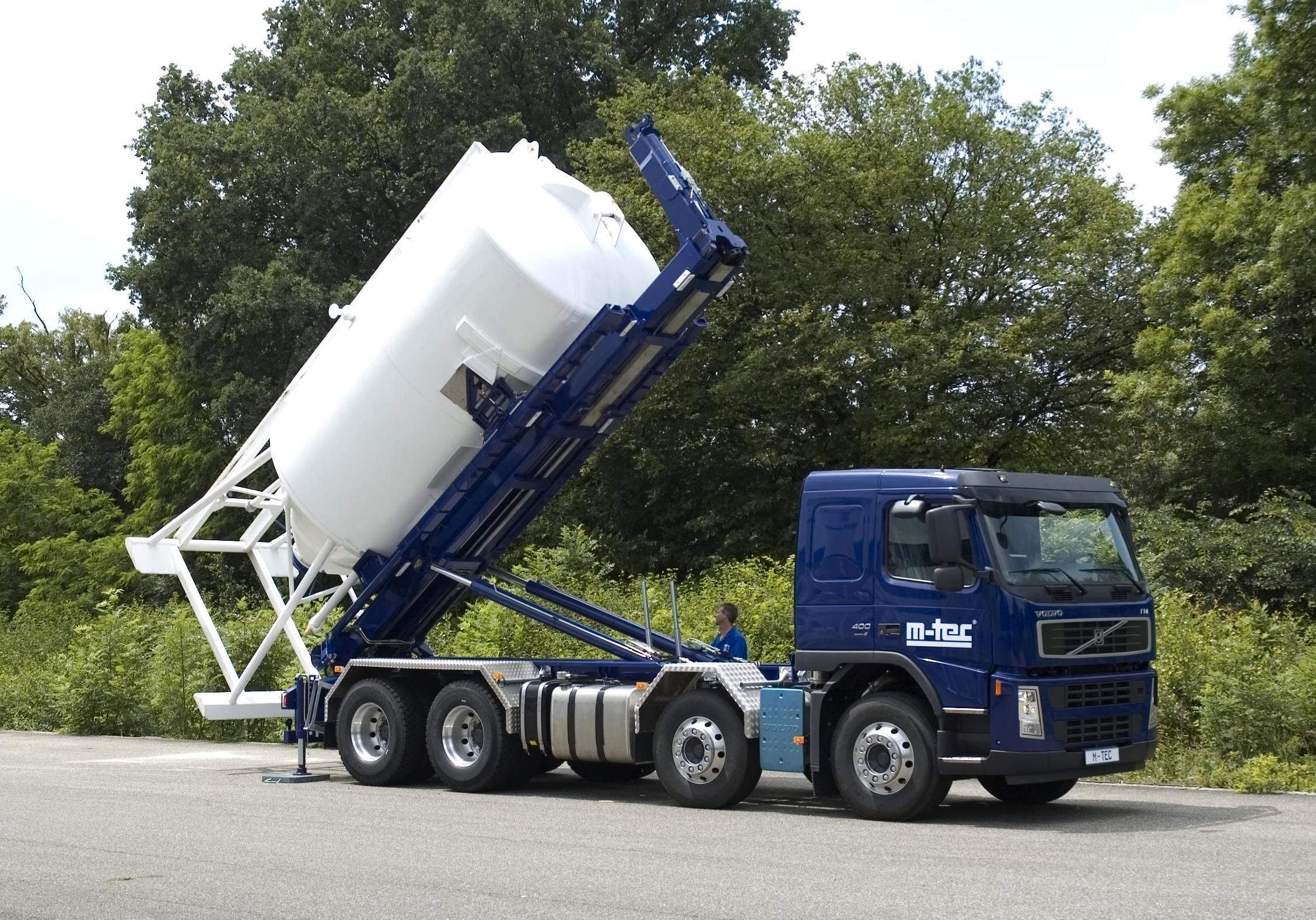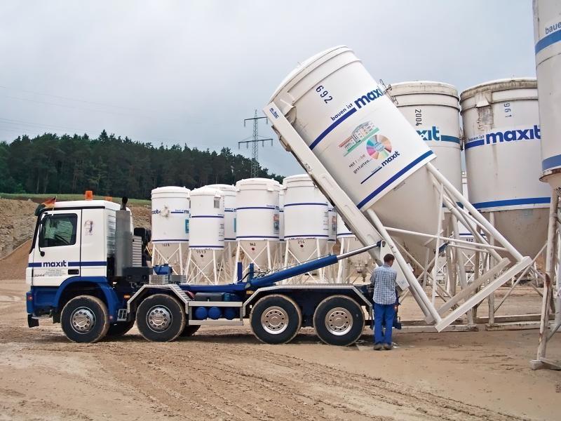Установка контейнеров на автомобиль производится следующим образом. Контейнер стоит на площадке на выдвинутых опорных стойках, автомобиль подъезжает под контейнер и с помощью гидроцилиндра поднимается специальная рама-платформа. После этого опорные стойки контейнера убираются, платформа автомобиля опускается, контейнер закрепляется на платформе, и машина готова к перевозке груза. Снятие контейнера производится в обратном порядке. Управление подъемом и опусканием платформы производится водителем из кабины. Удобство таких контейнерных растворовозов состоит в том, что в зависимости от требуемого количества материала можно иметь машины с одним, двумя или несколькими контейнерами. Для того, чтобы автомобиль не делал холостых рейсов, необходимо иметь запасные контейнеры.