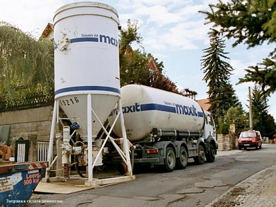 В случае надобности навесное оборудование может быть быстро снято и автомашина освобождена. Сыпучие материалы при транспортировании и на строительных объектах хранятся в металлических контейнерах эллиптической формы с конусным основанием ёмкостью 3 куб. м (?). Заполняются они материалом через отверстие - люк в боковой стенке. В момент заполнения контейнер находится на автомашине в горизонтальном положении. После наполнения люк герметически закрывается специальной крышкой. На объекте с помощью захватов, имеющихся на раме, контейнер устанавливается в вертикальное положение, а контейнерный цементовоз, приняв освободившуюся емкость, следует вновь к месту централизованной загрузки. Разгрузка контейнера производится через затвор, находящийся в нижней его части. Более чем двухгодичная эксплуатация контейнерных цементовозов в системе Главленинградстроя показала, что они весьма удобны и высокоэффективны при транспортировании сыпучих строительных материалов..."