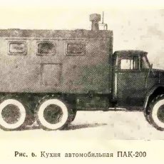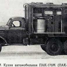 ПАК-170 войсковая передвижная автомобильная кухня для приготовления, транспортирования и выдачи горячей пищи для обслуживая до 170 чел. в день в полевых условиях, экипаж 3, шасси - ЗиЛ-157К 6х6, кузов - дерево-металлический, котлов 3, жарочный шкаф 1, бак для: воды 200 л, топлива 48 л, полный вес, 7.95 тонн, военный завод №111, г. Брянск, с 1969 года.