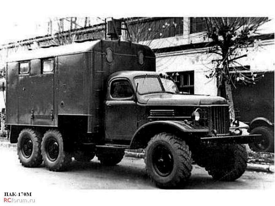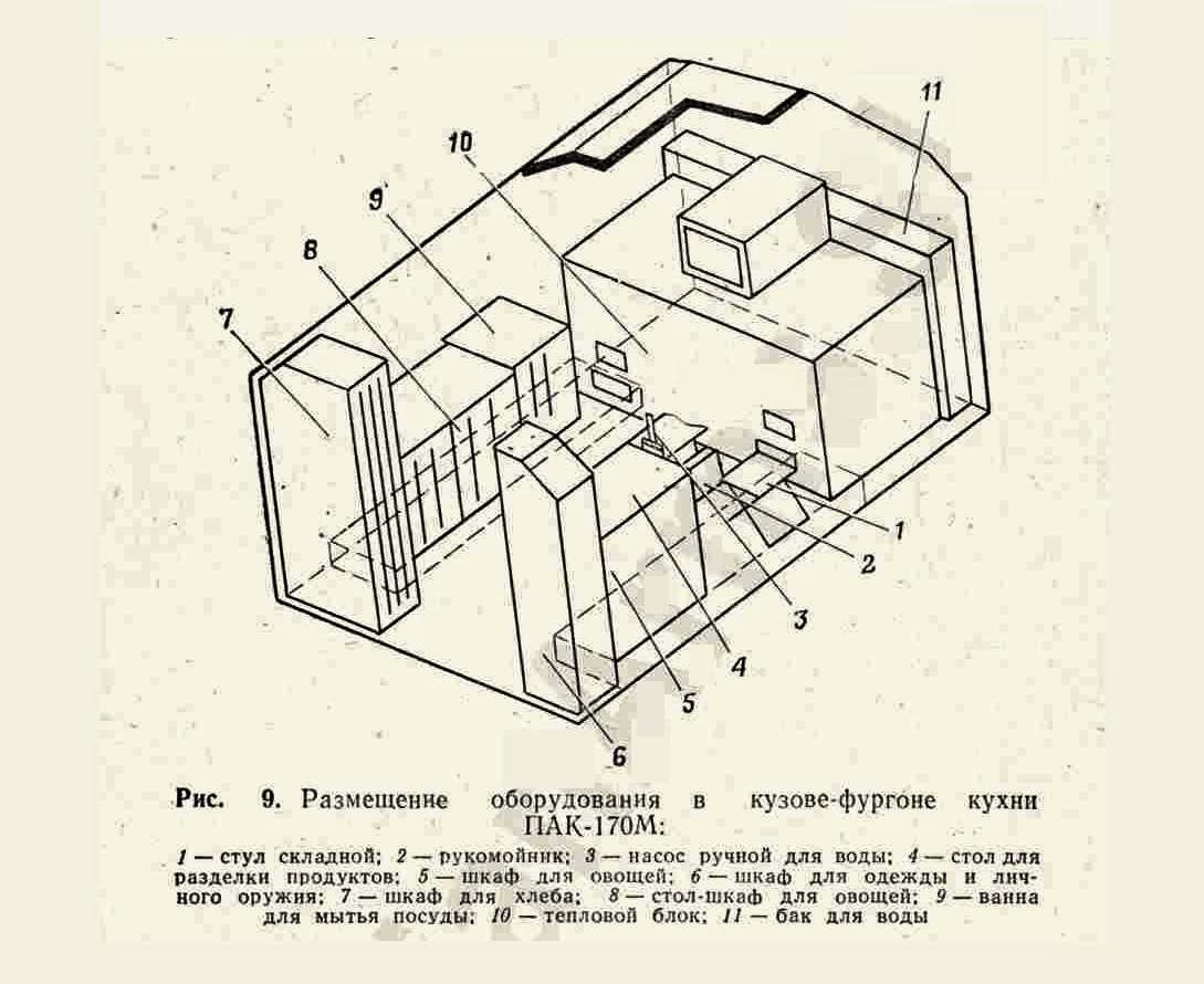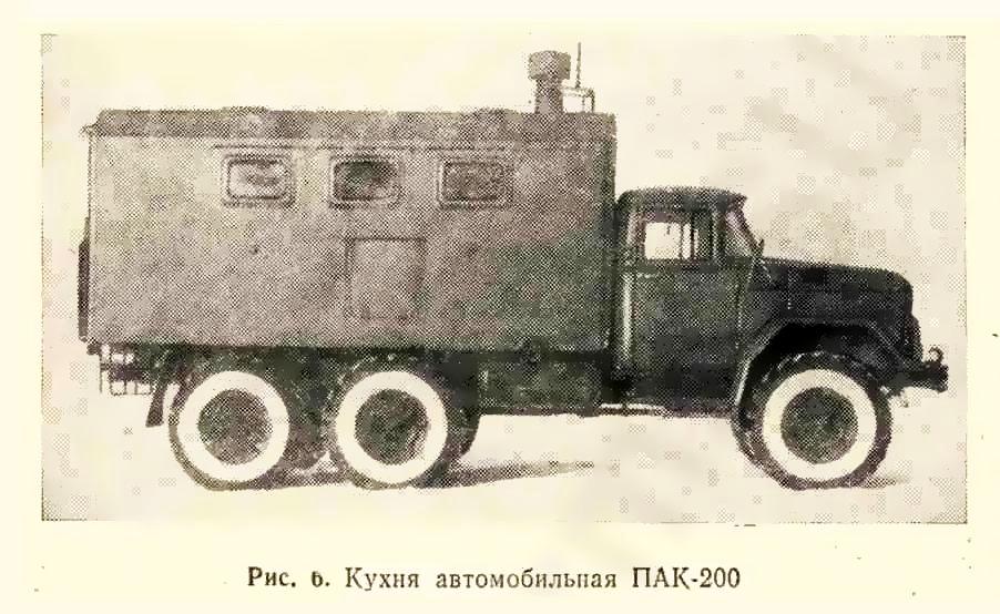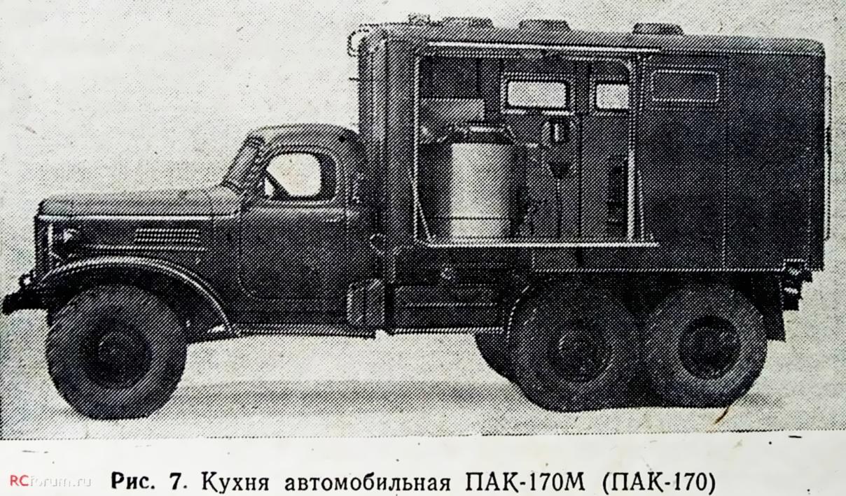 ПАК-170 войсковая передвижная автомобильная кухня для приготовления, транспортирования и выдачи горячей пищи для обслуживая до 170 чел. в день в полевых условиях, экипаж 3, шасси - ЗиЛ-157К 6х6, кузов - дерево-металлический, котлов 3, жарочный шкаф 1, бак для: воды 200 л, топлива 48 л, полный вес, 7.95 тонн, военный завод №111, г. Брянск, с 1969 года.