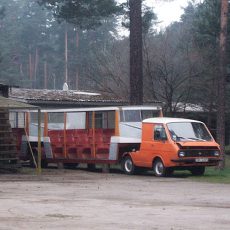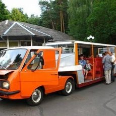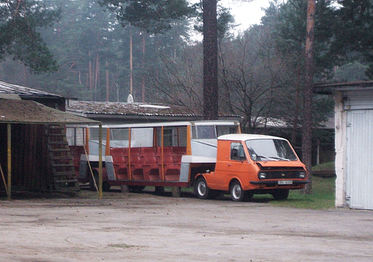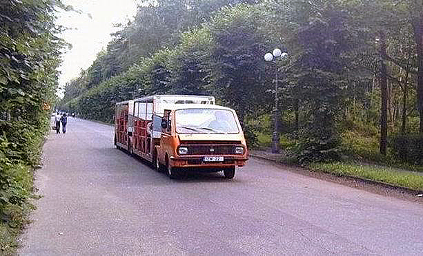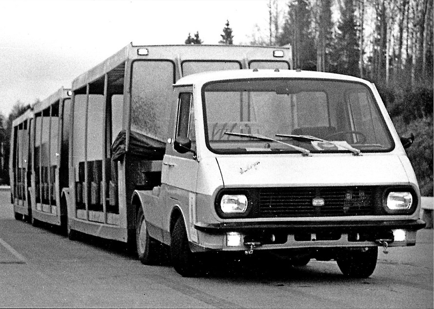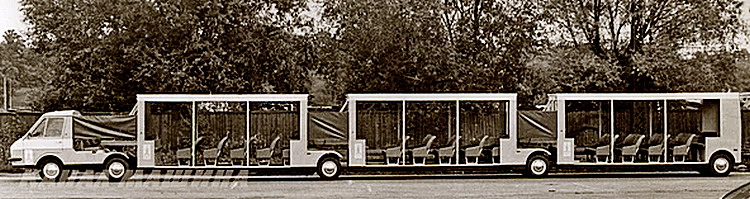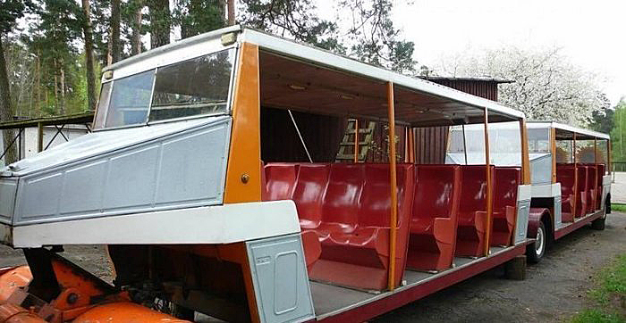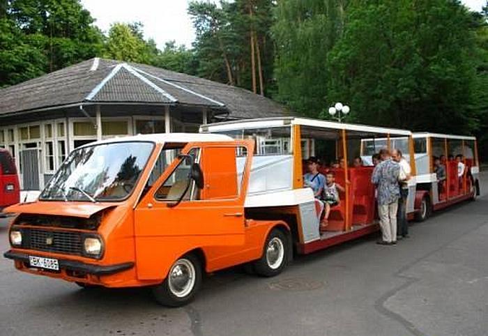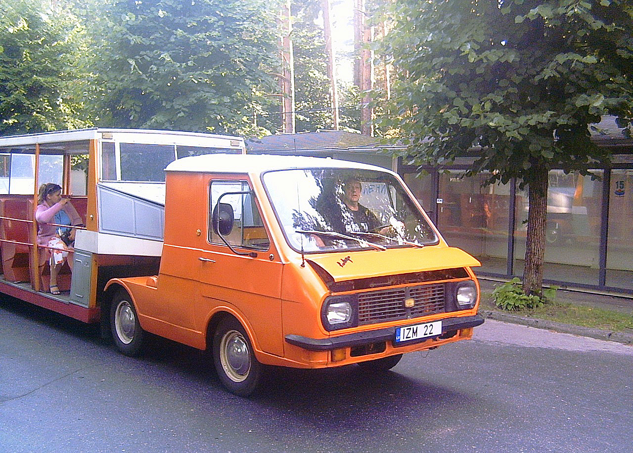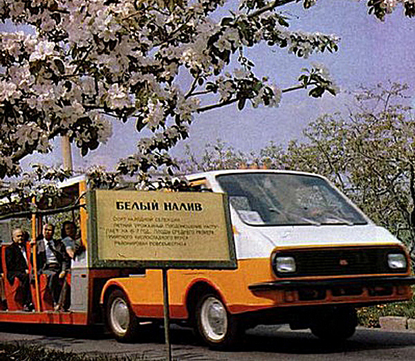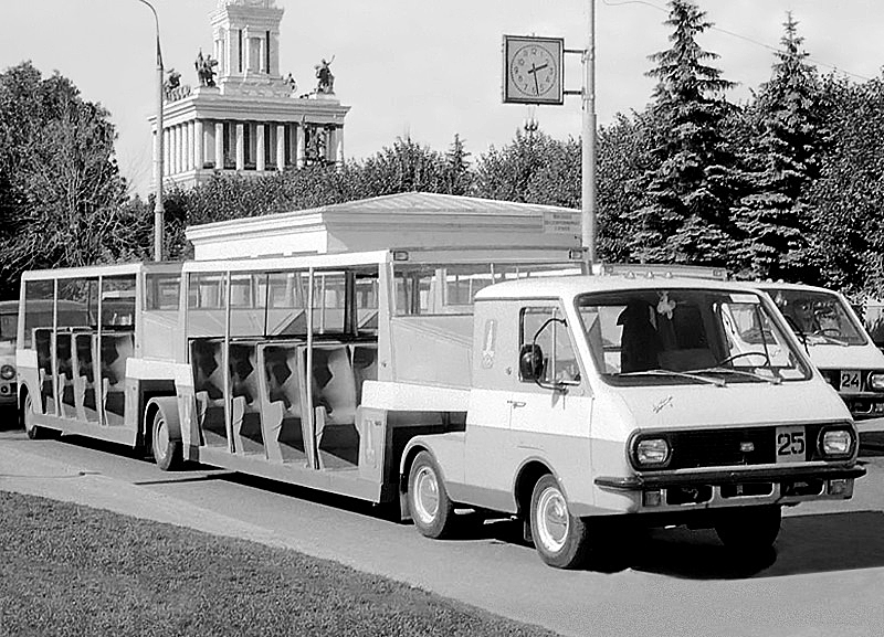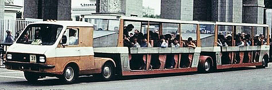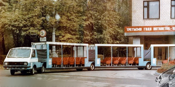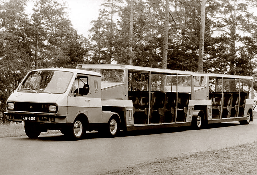Пассажирский автопоезд из тягача РАФ-3407 4х2 и 1-осных полуприцепов-вагонов: промежуточного РАФ-9225 и замыкающего РАФ-9226, мест: 2 плюс 20 плюс 20, максимальная скорость 15 км/час.
