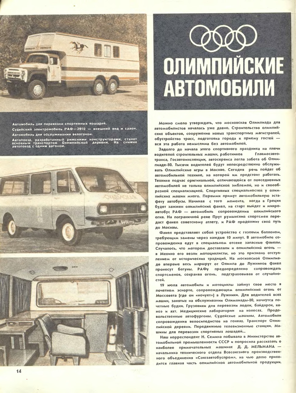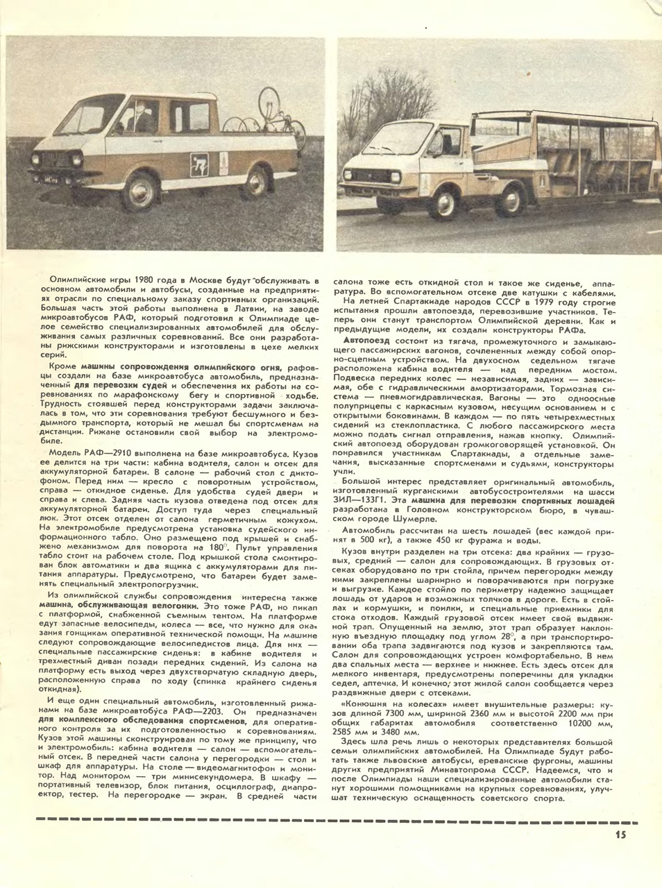 Приказом Министра автомобильной промышленности СССР № 18 от 15.01.1976 года Заводу микроавтобусов «РАФ» имени XXV съезда КПСС было поручено спроектировать и изготовить опытно-промышленной партией целую серию специальных модификаций микроавтобуса РАФ-2203 для оргкомитета «Олимпиады-80». Это были машины сопровождения олимпийского огня, велотехнические и судейские машины, передвижные лаборатории, пассажирские автопоезда для перевозки гостей Олимпийской деревни.