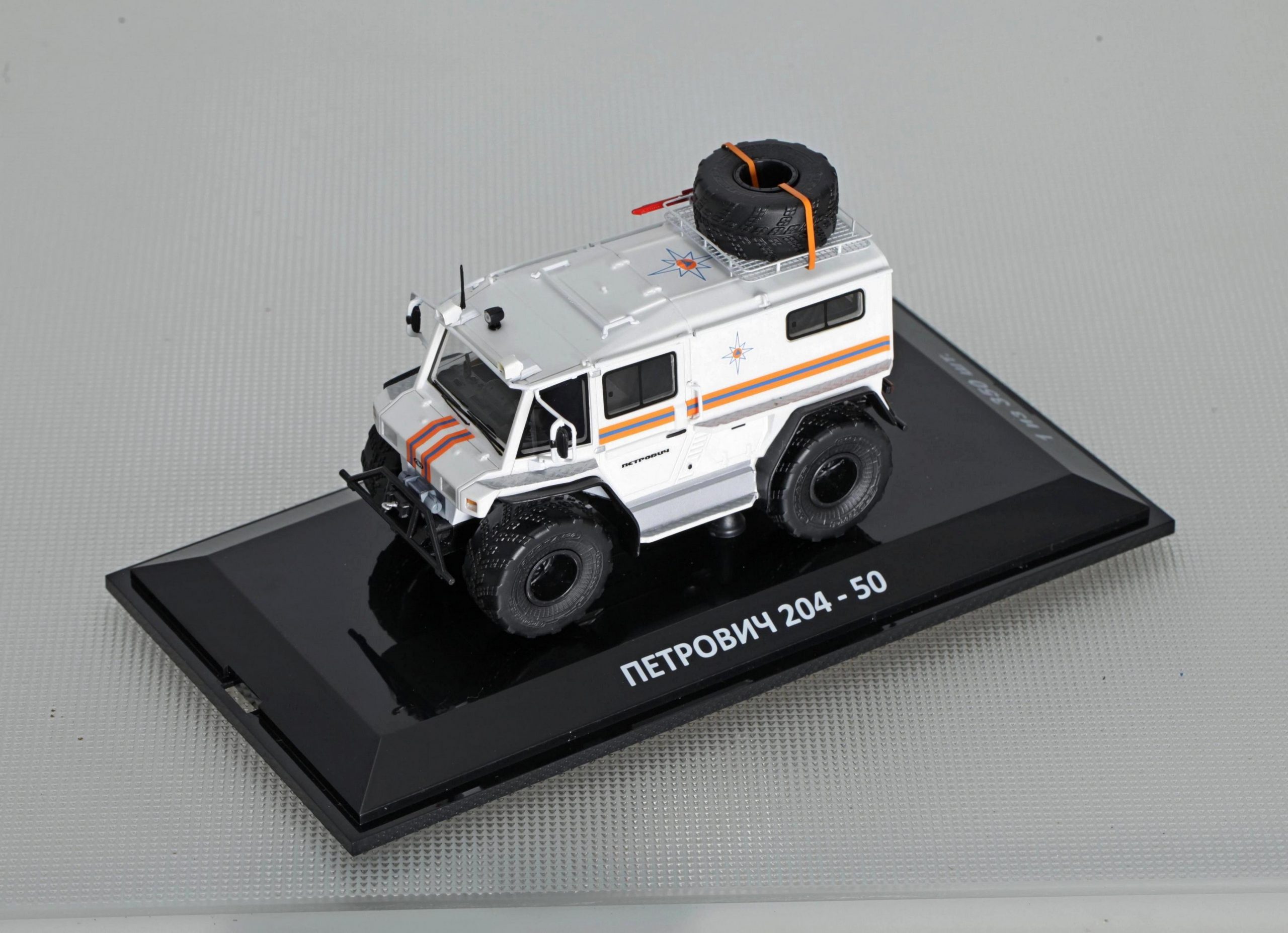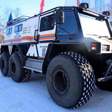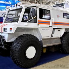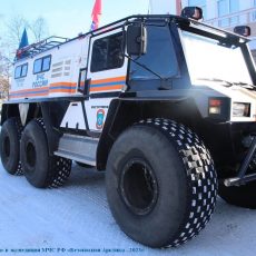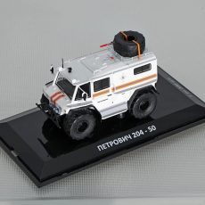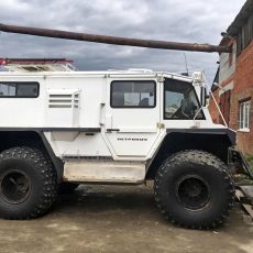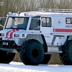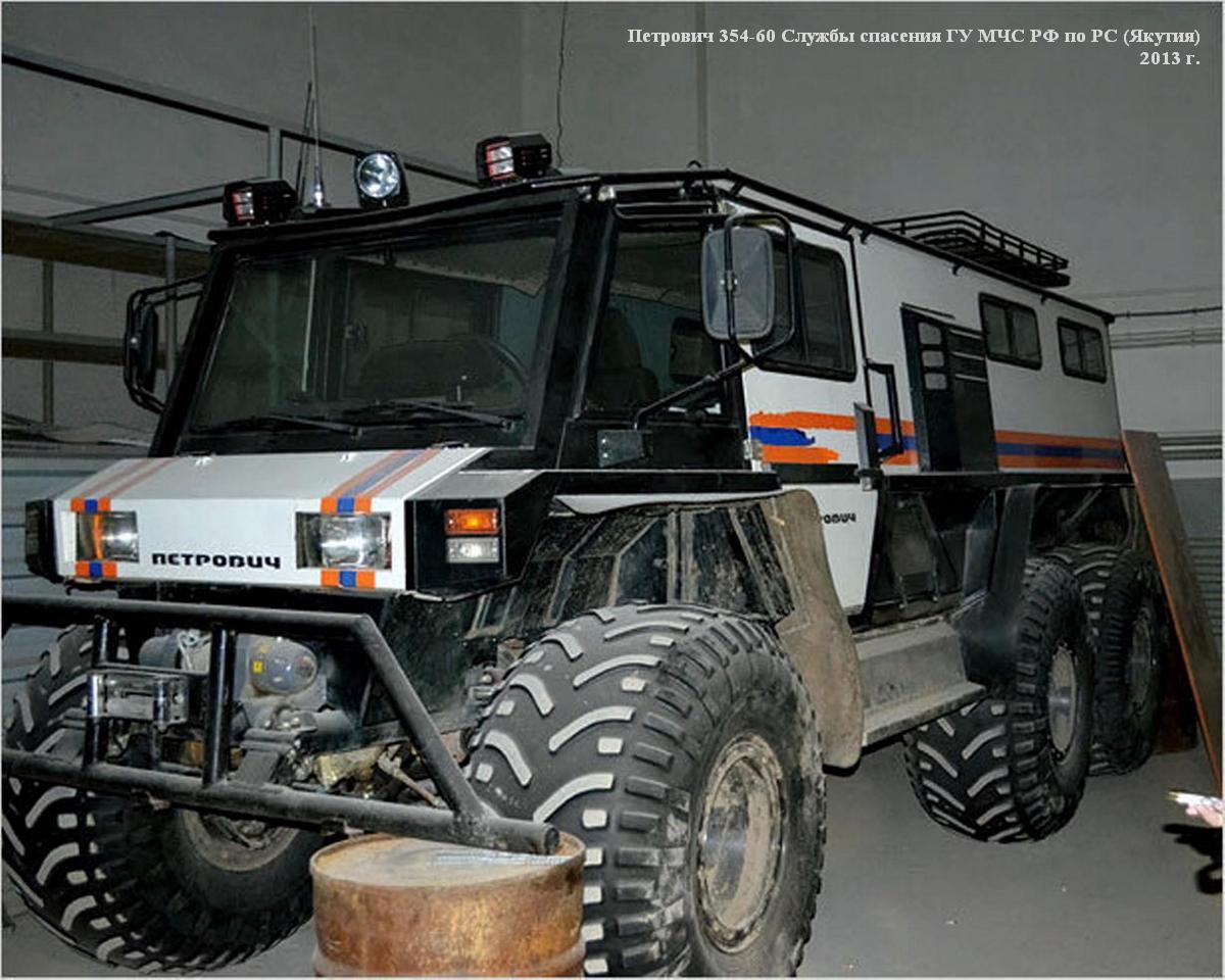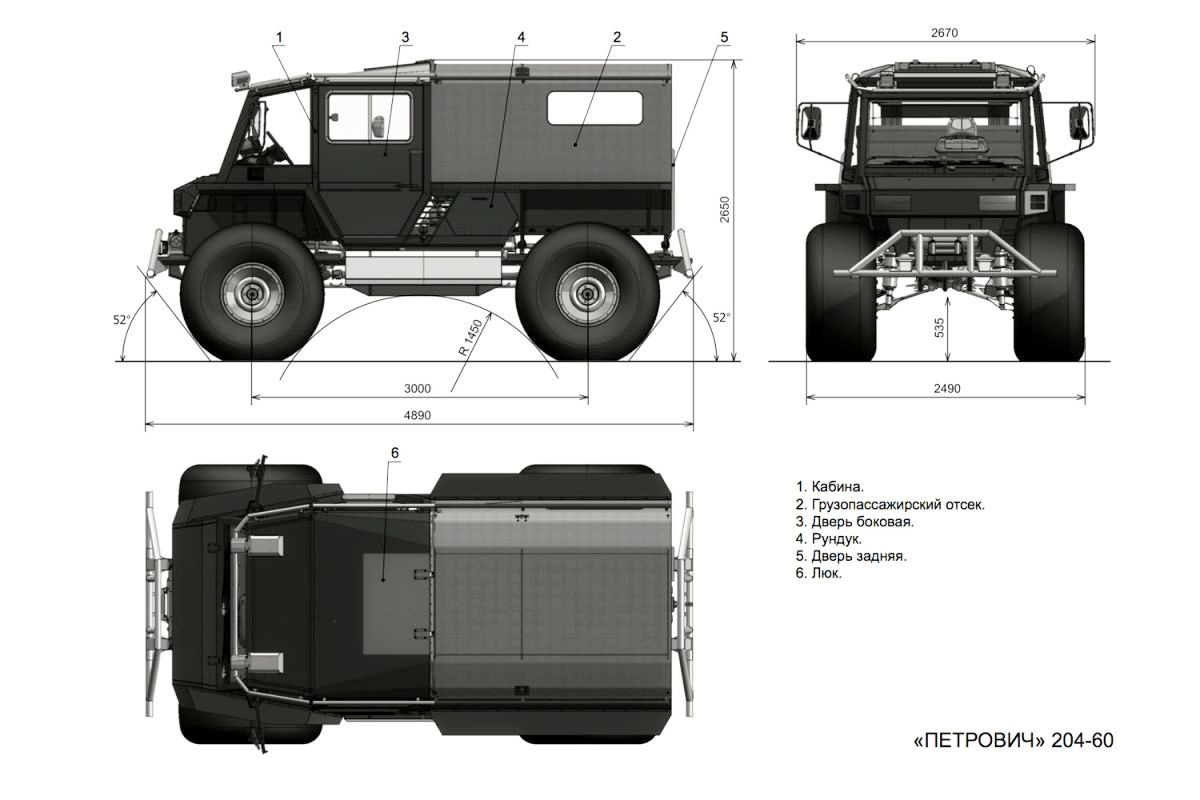 Петрович 204-60 4х4 поисково-спасательный снегоболотоход с несущей рамой на шинах сверхнизкого давления, кузов 1-объемный с центральным расположением силового агрегата, грузоподъемность: на суше 800 кг, на плаву 600 кг, мест: 1 плюс 6, вес: снаряженный 1.95 тонн, полный 2.75 тонн, максимальная скорость по шоссе 50 км/час.