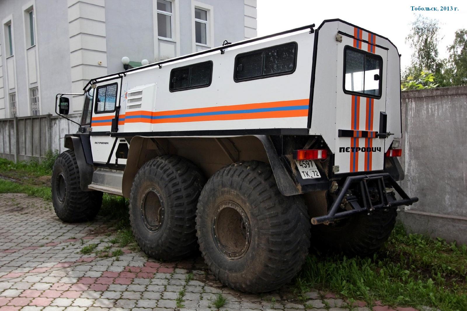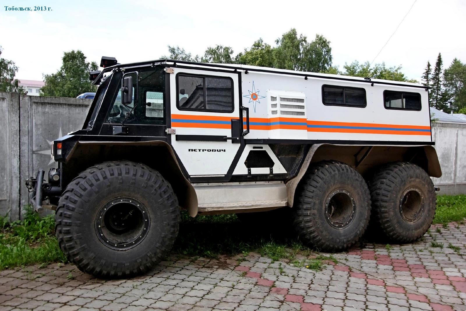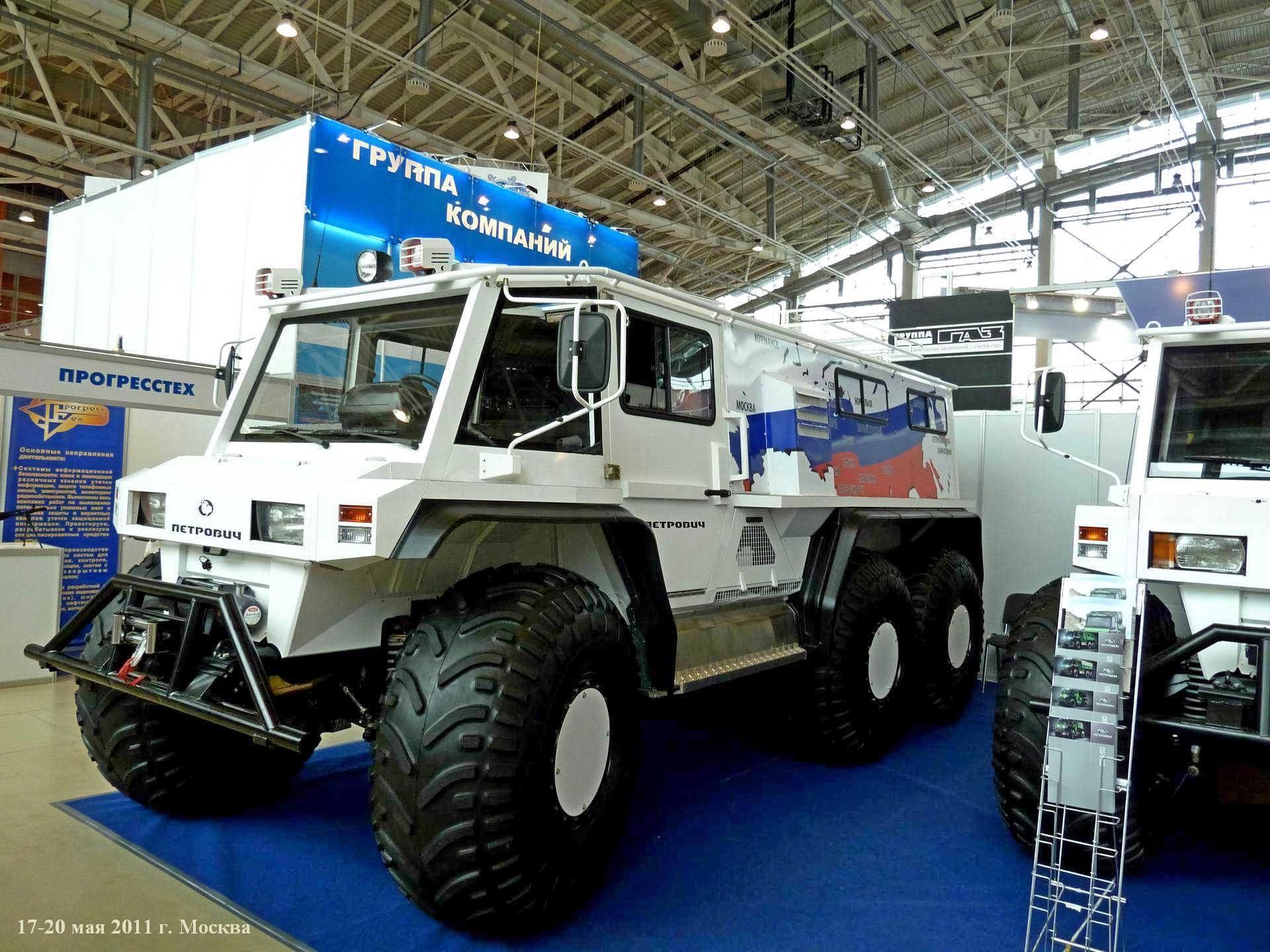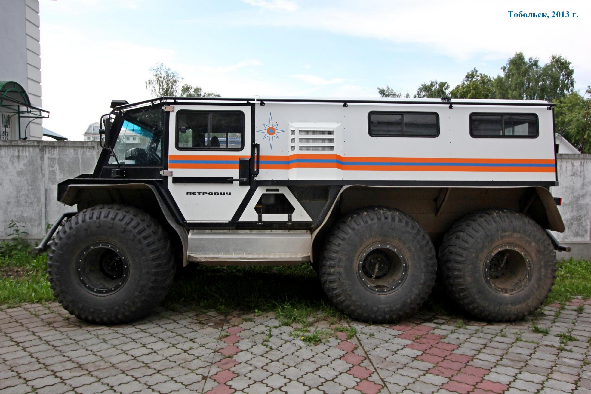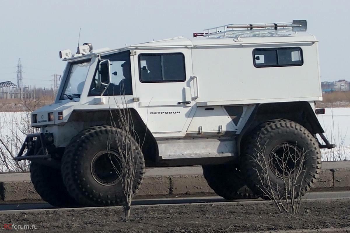 В 2011-м на смену «Гриве», на которой, очевидно, прорабатывалась концепция будущей серийной машины, пришел «Петрович». О нем уже можно говорить как о состоявшемся и массовом (конечно, в рамках вездеходостроения) продукте, имеющем модельный ряд и по-прежнему дизайнерски изящном. Схема трансмиссии у них принципиально не изменилась, разве что центральный дифференциал стал принудительно блокироваться. И в трехосном варианте появилась дополнительная «раздатка» для привода заднего моста, который включается электромуфтой после блокировки дифференциала в первой РК. Остались на месте и колесные редукторы, и пружинная «двухрычажка». На «Петровиче» 4х4 используется 1,7-литровый нивовский агрегат. Для модификации 6х6 на выбор предлагаются турбодизели Hyundai, итальянский CMD или Iveco. Весят машины 2 и 2,5 т соответственно, грузоподъемность чуть больше 700 и 1300 кг. Мы не зря даем целую серию фото «Петровичей» — красивый аппарат! Судя по всему, еще и неплохо передвигающийся и надежный. На его счету испытания на Ямале, в пустынях ОАЭ, несколько встреч приземлившихся космонавтов, не говоря уже о «простом» русском бездорожье.