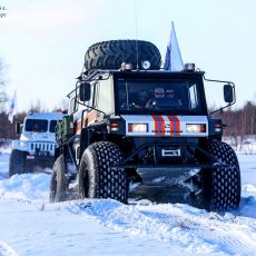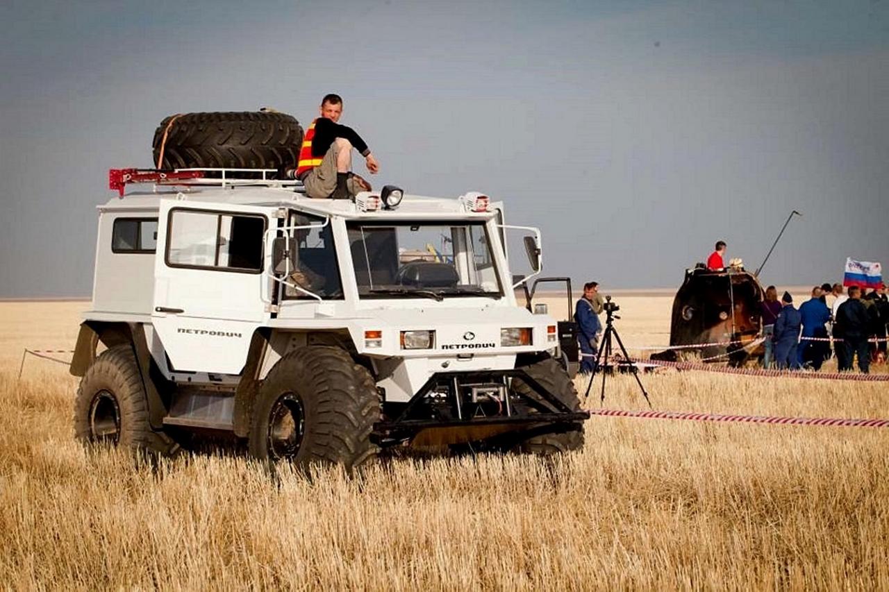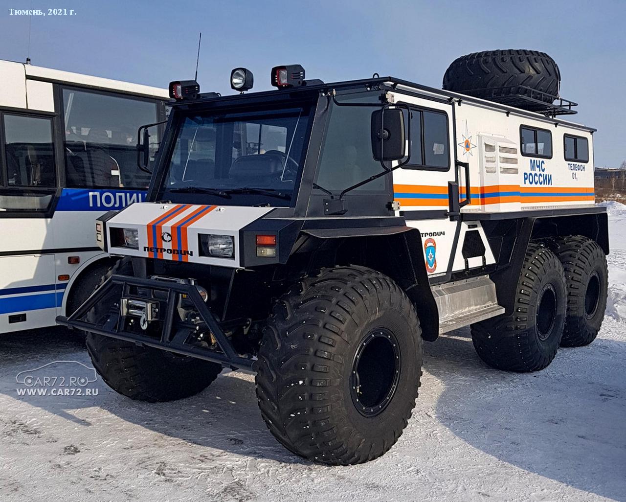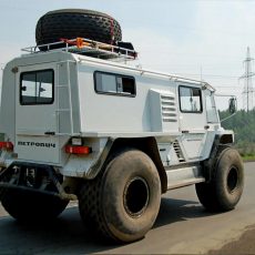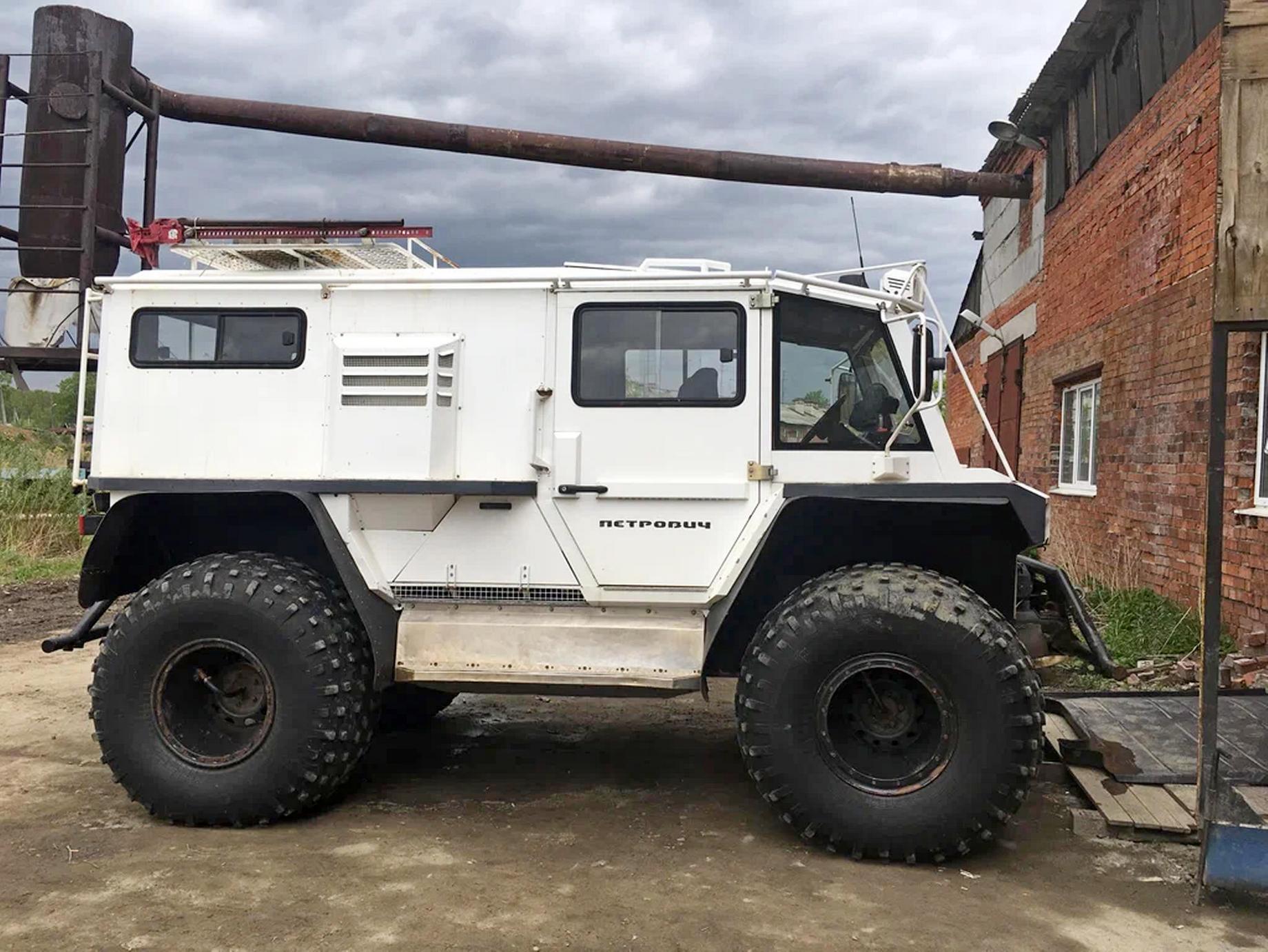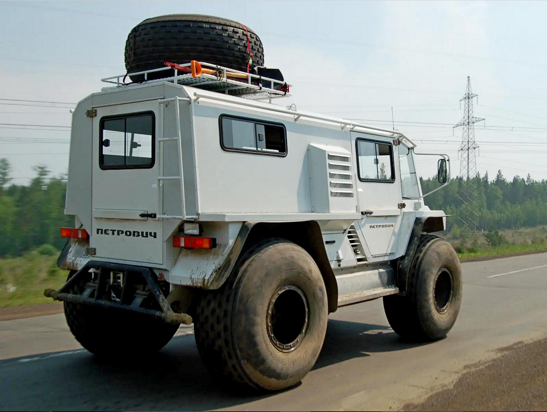 В 2011-м на смену «Гриве», на которой, очевидно, прорабатывалась концепция будущей серийной машины, пришел «Петрович». О нем уже можно говорить как о состоявшемся и массовом (конечно, в рамках вездеходостроения) продукте, имеющем модельный ряд и по-прежнему дизайнерски изящном. Схема трансмиссии у них принципиально не изменилась, разве что центральный дифференциал стал принудительно блокироваться. И в трехосном варианте появилась дополнительная «раздатка» для привода заднего моста, который включается электромуфтой после блокировки дифференциала в первой РК. Остались на месте и колесные редукторы, и пружинная «двухрычажка». На «Петровиче» 4х4 используется 1,7-литровый нивовский агрегат. Для модификации 6х6 на выбор предлагаются турбодизели Hyundai, итальянский CMD или Iveco. Весят машины 2 и 2,5 т соответственно, грузоподъемность чуть больше 700 и 1300 кг. Мы не зря даем целую серию фото «Петровичей» — красивый аппарат! Судя по всему, еще и неплохо передвигающийся и надежный. На его счету испытания на Ямале, в пустынях ОАЭ, несколько встреч приземлившихся космонавтов, не говоря уже о «простом» русском бездорожье.