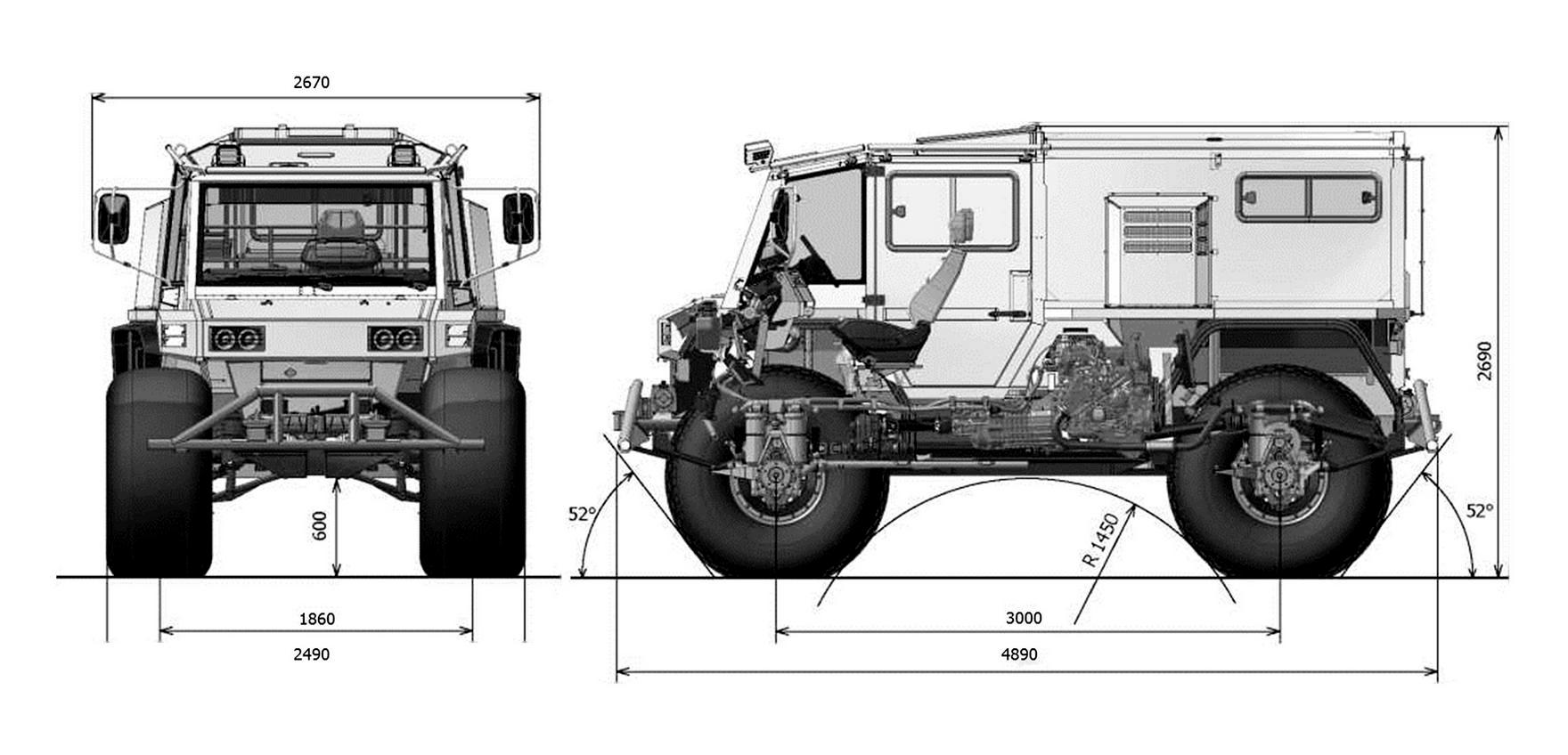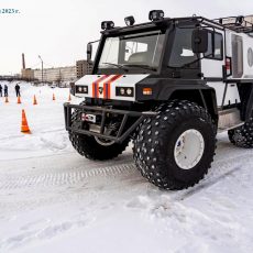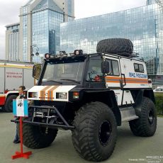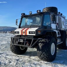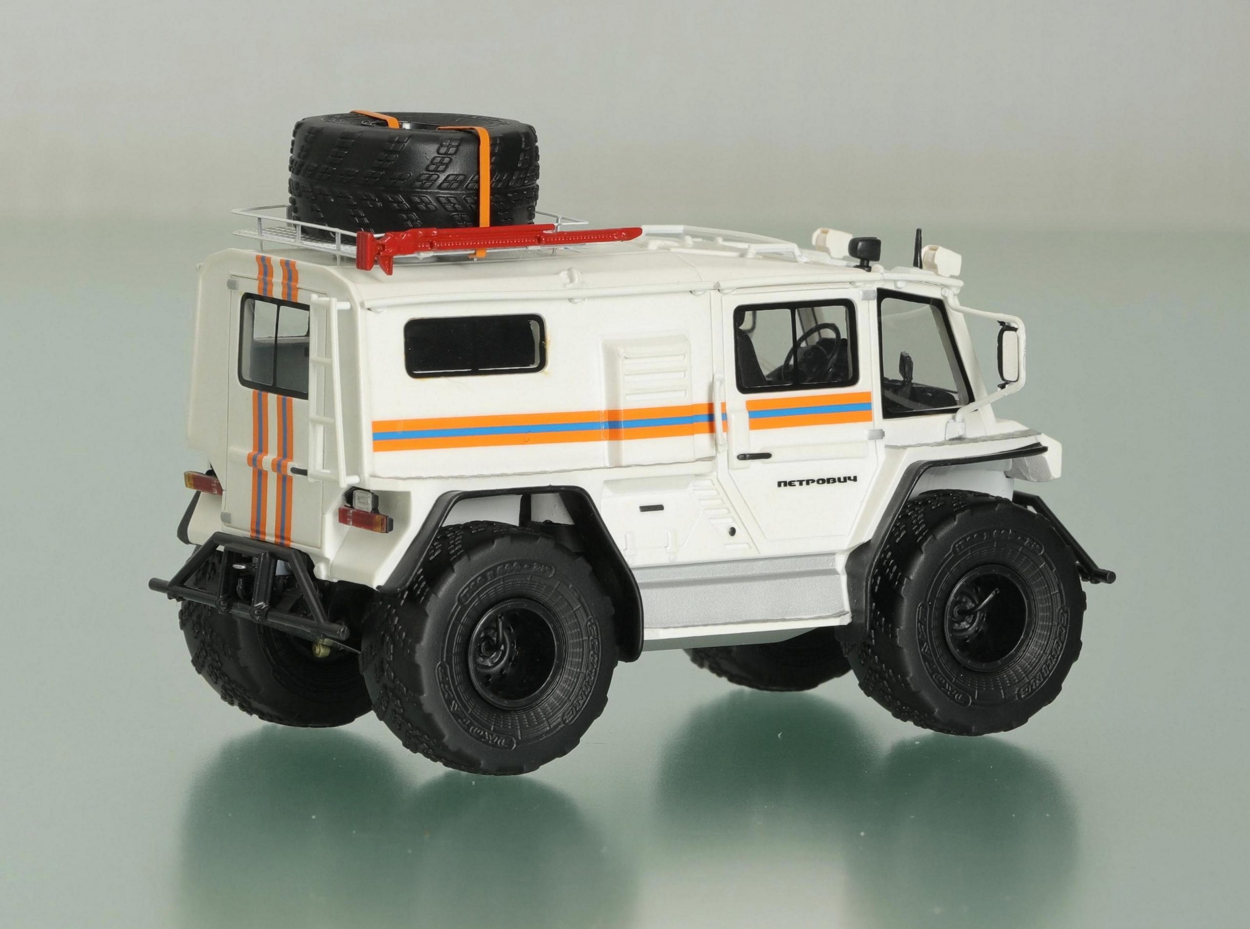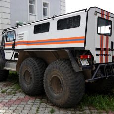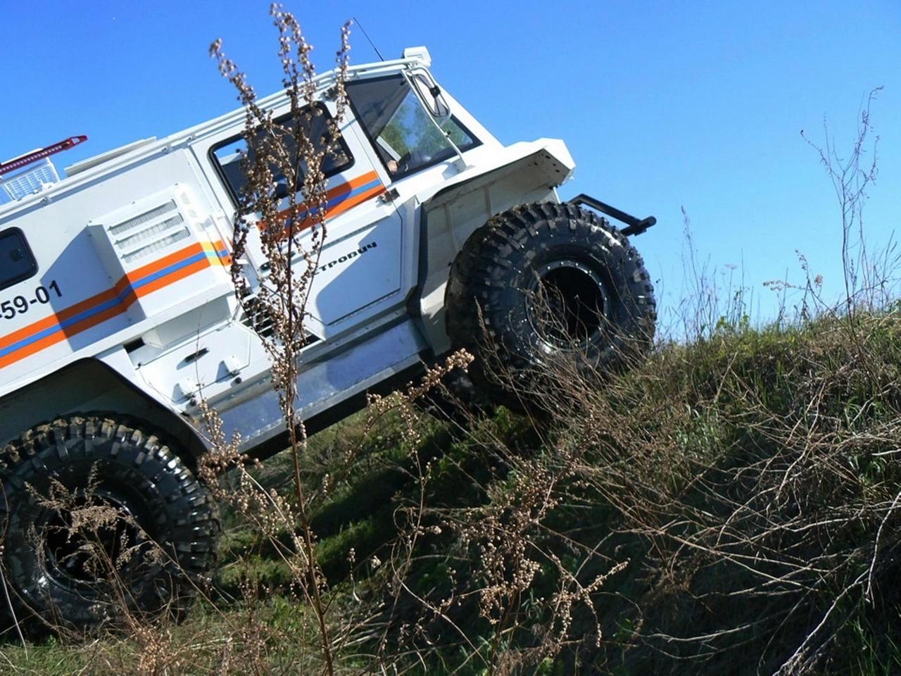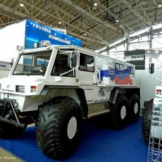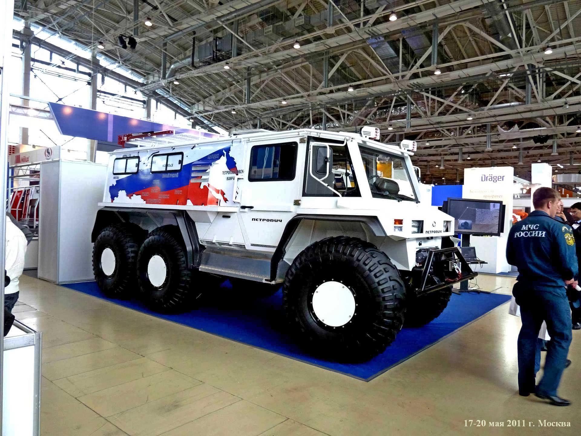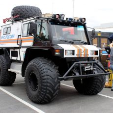В 2011-м на смену «Гриве», на которой, очевидно, прорабатывалась концепция будущей серийной машины, пришел «Петрович». О нем уже можно говорить как о состоявшемся и массовом (конечно, в рамках вездеходостроения) продукте, имеющем модельный ряд и по-прежнему дизайнерски изящном. Схема трансмиссии у них принципиально не изменилась, разве что центральный дифференциал стал принудительно блокироваться. И в трехосном варианте появилась дополнительная «раздатка» для привода заднего моста, который включается электромуфтой после блокировки дифференциала в первой РК. Остались на месте и колесные редукторы, и пружинная «двухрычажка». На «Петровиче» 4х4 используется 1,7-литровый нивовский агрегат. Для модификации 6х6 на выбор предлагаются турбодизели Hyundai, итальянский CMD или Iveco. Весят машины 2 и 2,5 т соответственно, грузоподъемность чуть больше 700 и 1300 кг. Мы не зря даем целую серию фото «Петровичей» — красивый аппарат! Судя по всему, еще и неплохо передвигающийся и надежный. На его счету испытания на Ямале, в пустынях ОАЭ, несколько встреч приземлившихся космонавтов, не говоря уже о «простом» русском бездорожье.