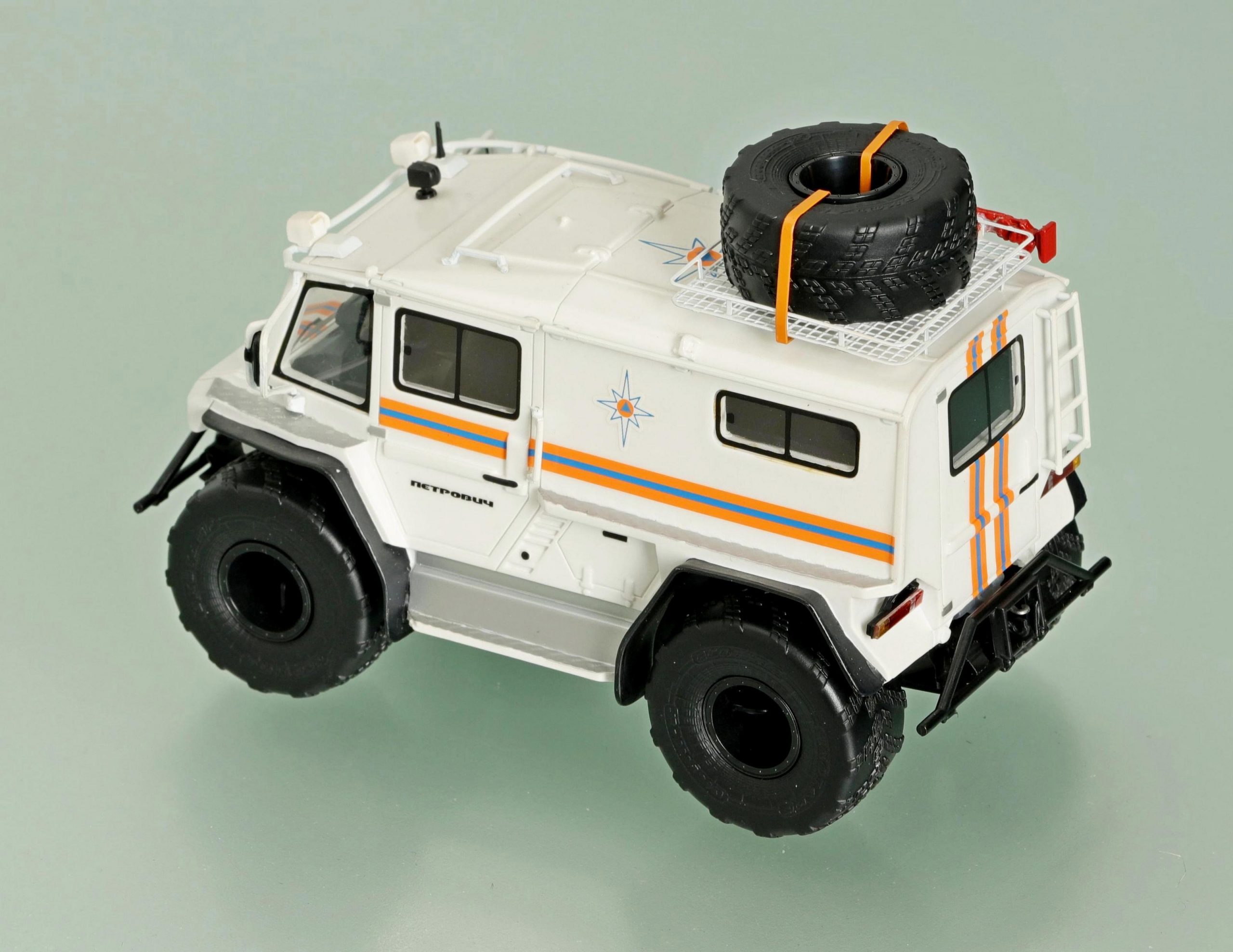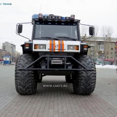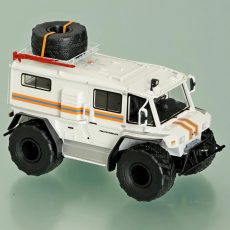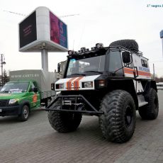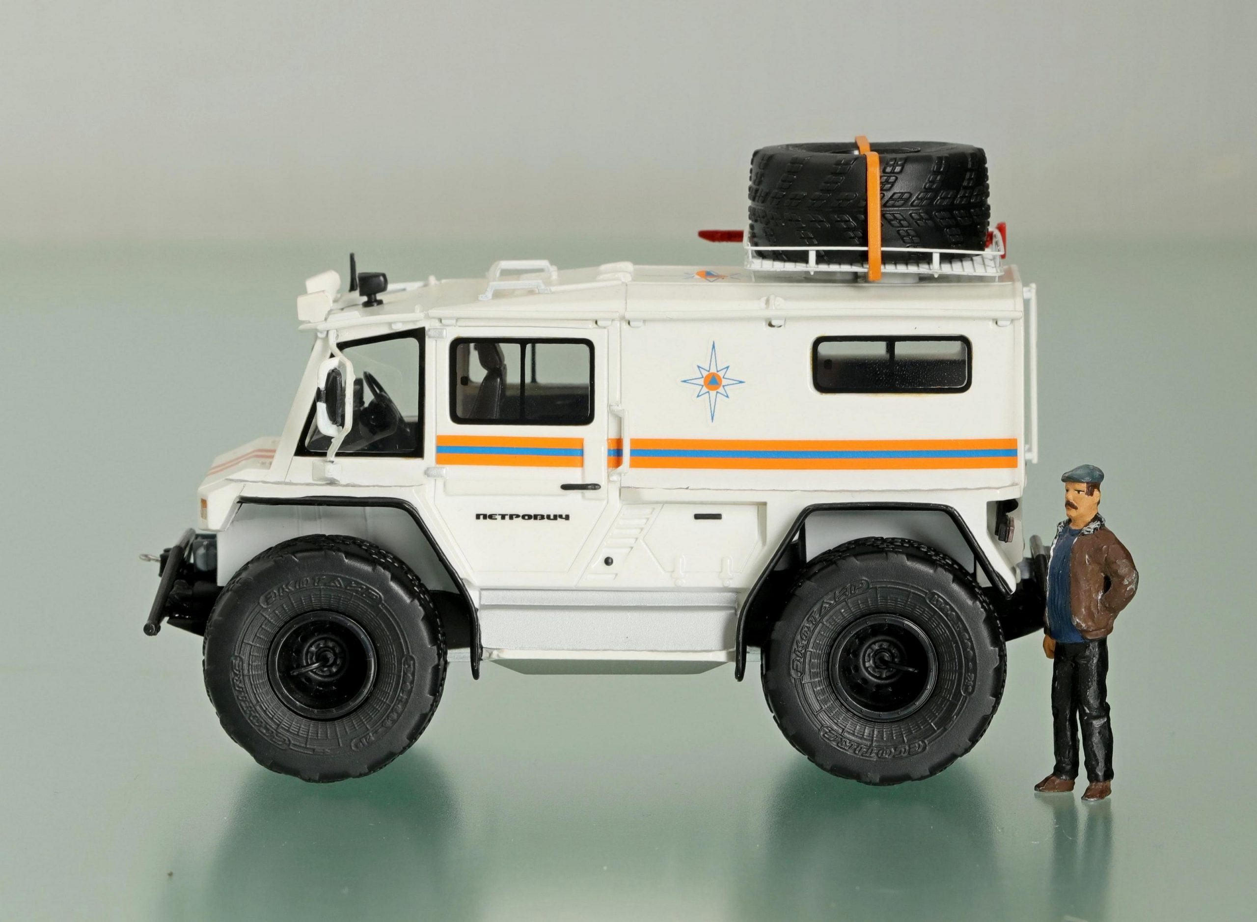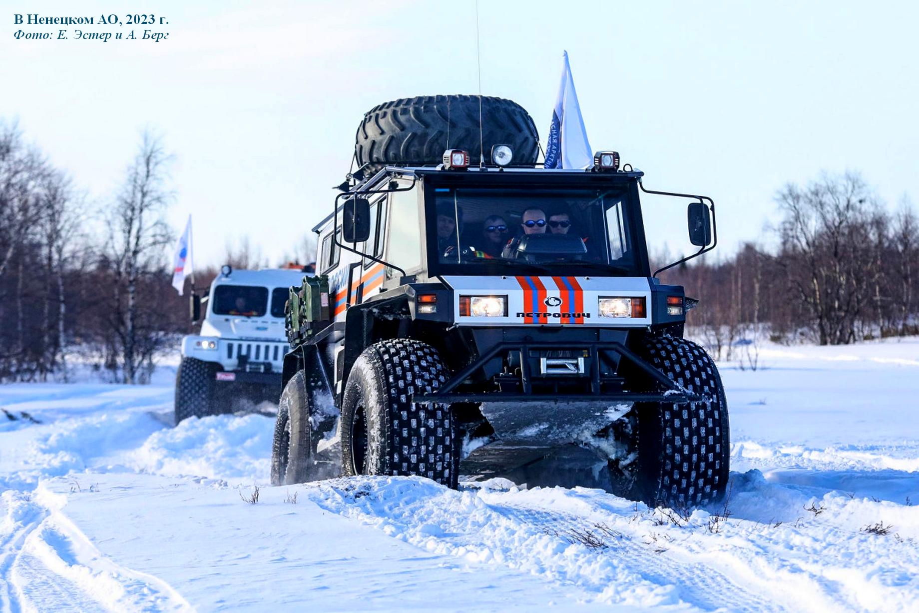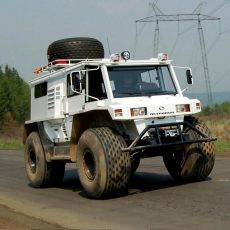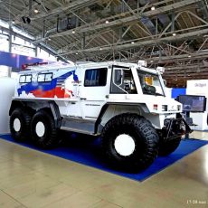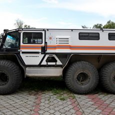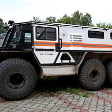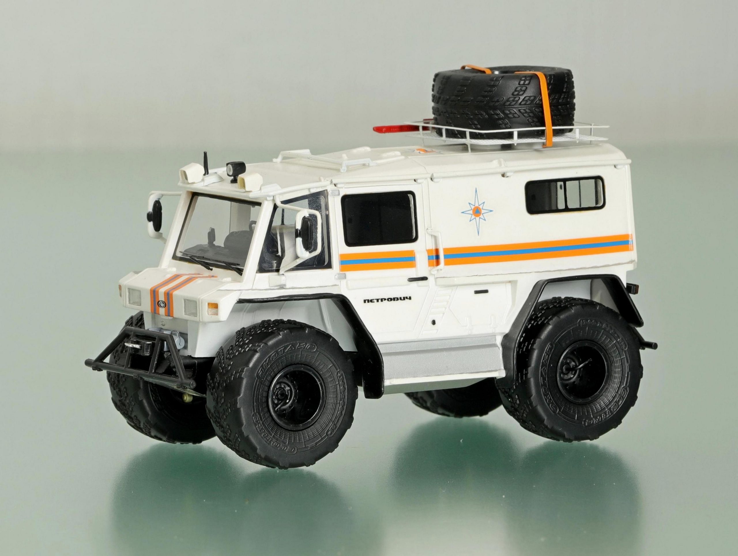 В 2011-м на смену «Гриве», на которой, очевидно, прорабатывалась концепция будущей серийной машины, пришел «Петрович». О нем уже можно говорить как о состоявшемся и массовом (конечно, в рамках вездеходостроения) продукте, имеющем модельный ряд и по-прежнему дизайнерски изящном. Схема трансмиссии у них принципиально не изменилась, разве что центральный дифференциал стал принудительно блокироваться. И в трехосном варианте появилась дополнительная «раздатка» для привода заднего моста, который включается электромуфтой после блокировки дифференциала в первой РК. Остались на месте и колесные редукторы, и пружинная «двухрычажка». На «Петровиче» 4х4 используется 1,7-литровый нивовский агрегат. Для модификации 6х6 на выбор предлагаются турбодизели Hyundai, итальянский CMD или Iveco. Весят машины 2 и 2,5 т соответственно, грузоподъемность чуть больше 700 и 1300 кг. Мы не зря даем целую серию фото «Петровичей» — красивый аппарат! Судя по всему, еще и неплохо передвигающийся и надежный. На его счету испытания на Ямале, в пустынях ОАЭ, несколько встреч приземлившихся космонавтов, не говоря уже о «простом» русском бездорожье.