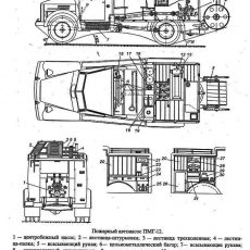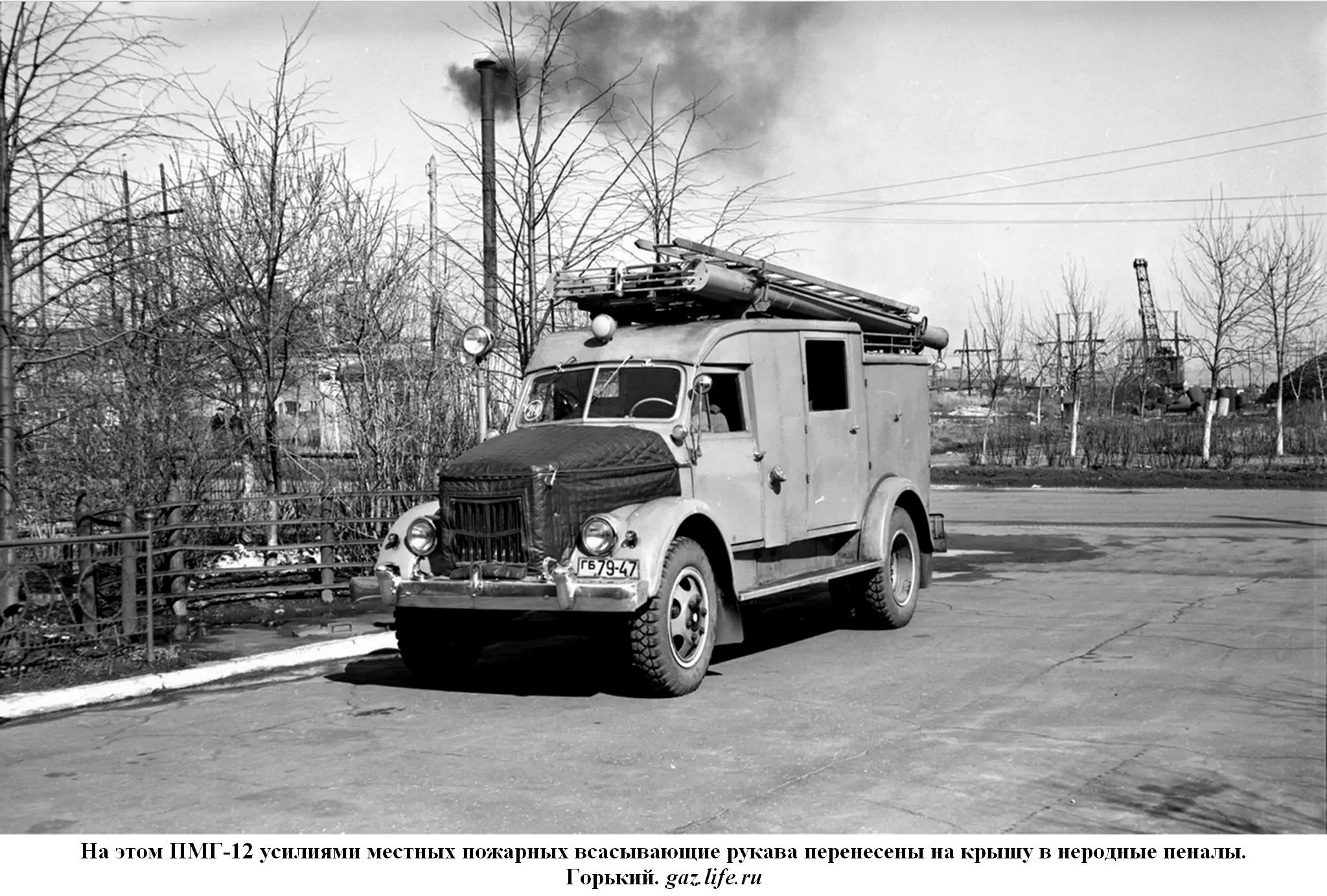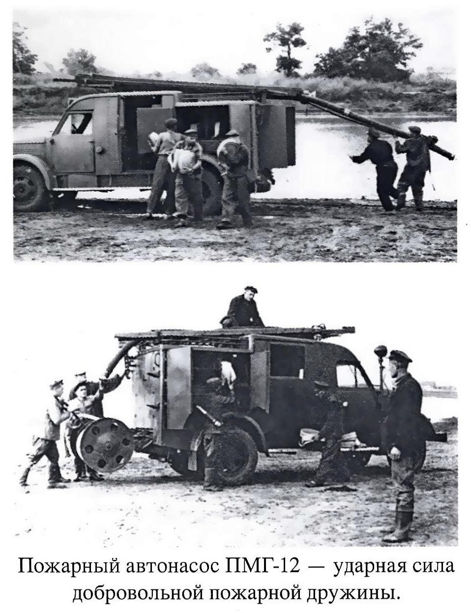 ПМГ-12, она же АН-25(51)-12, пожарный автонасос на шасси ГАЗ-51 4х2с металлическим закрытым кузовом и рукавной катушкой, насос ПН-25А подачей 20 л/сек, боевой расчет 2 плюс 6 человек, емкости: для воды - нет, для пенообразователя 130 л, боевой вес 4.93 тонн, максимальная скорость 70 км/час.