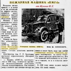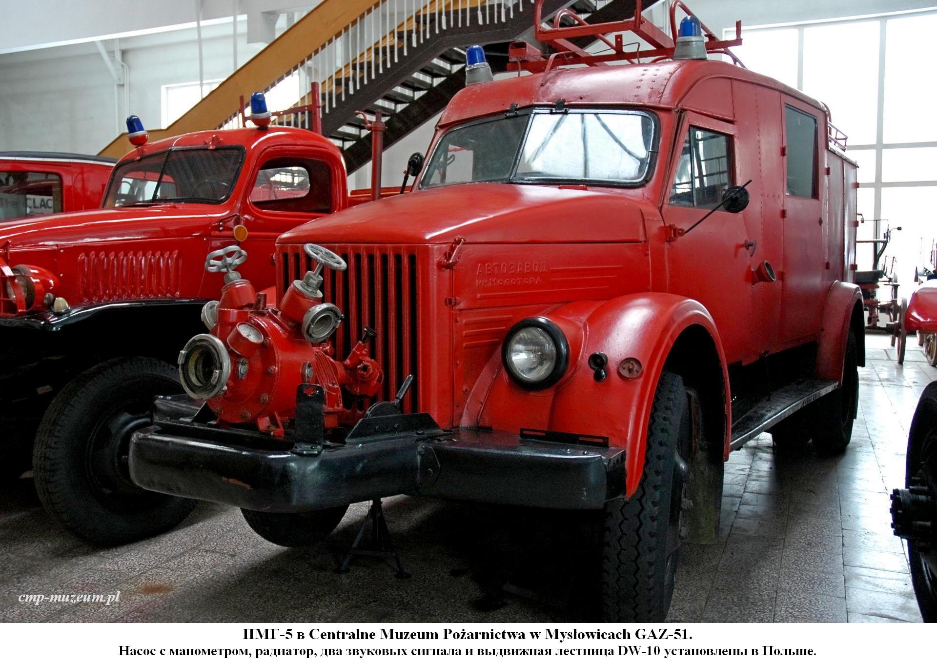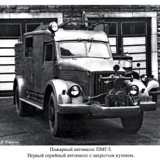 ПМГ-5 пожарный автонасос с рукавной катушкой на шасси ГАЗ-51 4х2, кузов цельнометаллический закрытого типа, насос: открытый переднего расположения ПН-1200 подачей 20 л/с, боевой расчет 2 плюс 6 человек, емкостей для воды и пенообразователя нет, общий вес в пределах 5 тонн, максимальная скорость 70 км/час.