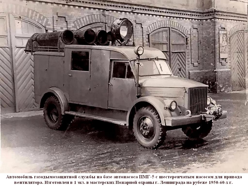 ПМГ-5 пожарный автонасос с рукавной катушкой на шасси ГАЗ-51 4х2, кузов цельнометаллический закрытого типа, насос: открытый переднего расположения ПН-1200 подачей 20 л/с, боевой расчет 2 плюс 6 человек, емкостей для воды и пенообразователя нет, общий вес в пределах 5 тонн, максимальная скорость 70 км/час.
