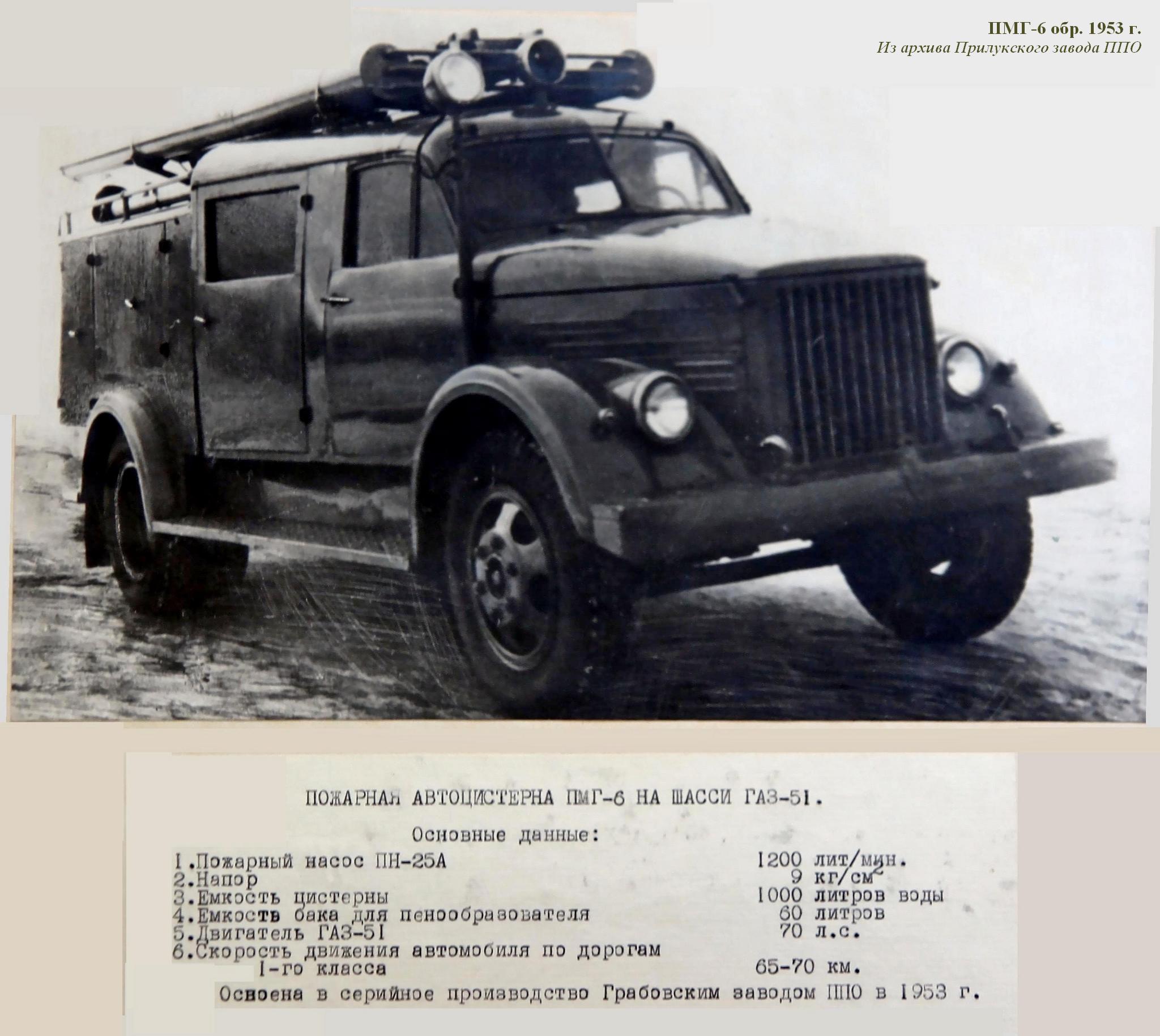 ПМГ-6(51) обр. 1950 г. пожарная автоцистерна закрытого типа с дерево-металлическим кузовом на шасси ГАЗ-51 4х2, ёмкости: для воды 1000 л, для пенообразователя 50 л, боевой расчет 2 плюс 3 человека, насос ПН-25А подачей 1200 л/мин, рабочий вес 5.58 тонн, максимальная скорость 70 км/час.