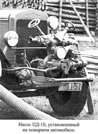На пожарном автонасосе ПД-10 устанавливался перед радиатором на сварной раме, прикреплённой к лонжеронам шасси. Особенностью насоса была установка специального редуктора для нормальной работы насоса, повышающего в два раза обороты двигателя. Вал редуктора насоса соединялся с коленчатым валом двигателя промежуточным валом. Для присоединения всасывающего рукава на всасывающий патрубок насоса навёртывался штуцер с полугайкой Кустова. Для подключения напорных рукавов на нагнетательном патрубке имеется тройник с двумя штуцерами, снабжёнными полугайками Ротт и тарельчатыми клапанами. Из измерительных приборов в конструкции имелись: мановакууметр, показывающий разрежение во время работы насоса из открытого водоёма и давление при работе насоса от гидранта, и манометр, установленный на тройнике, показывающий давление в нагнетательном штуцере. Не защищённые ни сеткой, ни ограждением, контрольные приборы в сложных условиях эксплуатации часто выходили из строя, и тогда на места их установки ставили заглушки или пробки, работая вообще без приборов. Забор воды осуществлялся при помощи водокольцевого вакуум-аппарата, который часто замерзал в условиях зимы.