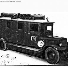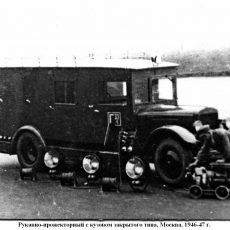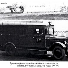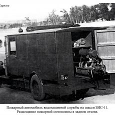 Пожарный автомобиль газодымозащитной службы закрытого типа на шасси ЗиС-11 4х2 с двумя дымососами и электрогенератором 6 кВт 120В, боевой расчет 11 человек, прожекторов 3 шт., полный вес до 6.5 тонн, максимальная скорость до 60 км/час.