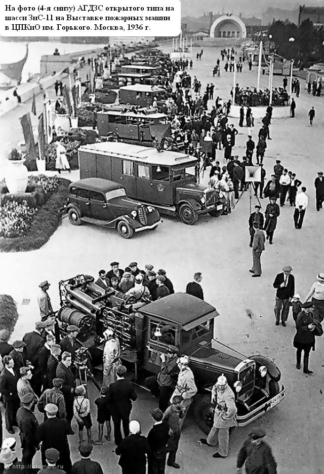 Согласно заметке газете "Вечерняя Москва" первый АГДЗС должен был отправиться служить в 7-ю Городскую пожарную команду, располагавшуюся тогда по адресу Столовый переулок, дом 12. Эту команду в середине 1930-х планировали сделать первым в Москве специализированным подразделением, оснащённым специальными пожарными машинами. И действительно, первая "газовка" изначально попала в эту часть. Но уже в мае 1934 года эта машина была переведена в 17-ю ГПК на Кропоткинскую улицу дом 22.В дальнейшем мастерскими УПО было создано ещё несколько подобных АГДЗС на шасси АМО-4 и ЗиС-11. Внешне машины можно разделить на три варианта - 1-й с полностью открытой кабиной расчёта, 2-й с полностью закрытой кабиной расчёта, 3-й с открытой кабиной водителя, но закрытой кабиной остального расчёта. Сейчас очень трудно определить, сколько было выпущено "газовок" на шасси АМО-4/ЗиС-11. По доступным фото я могу только предположить, что было три полностью открытых машины, одна закрытая машина, и одна полузакрытая. Машины первого (открытого) варианта немного отличались между собой укладкой рукавов дымососа (дыморефулера) на крыше.