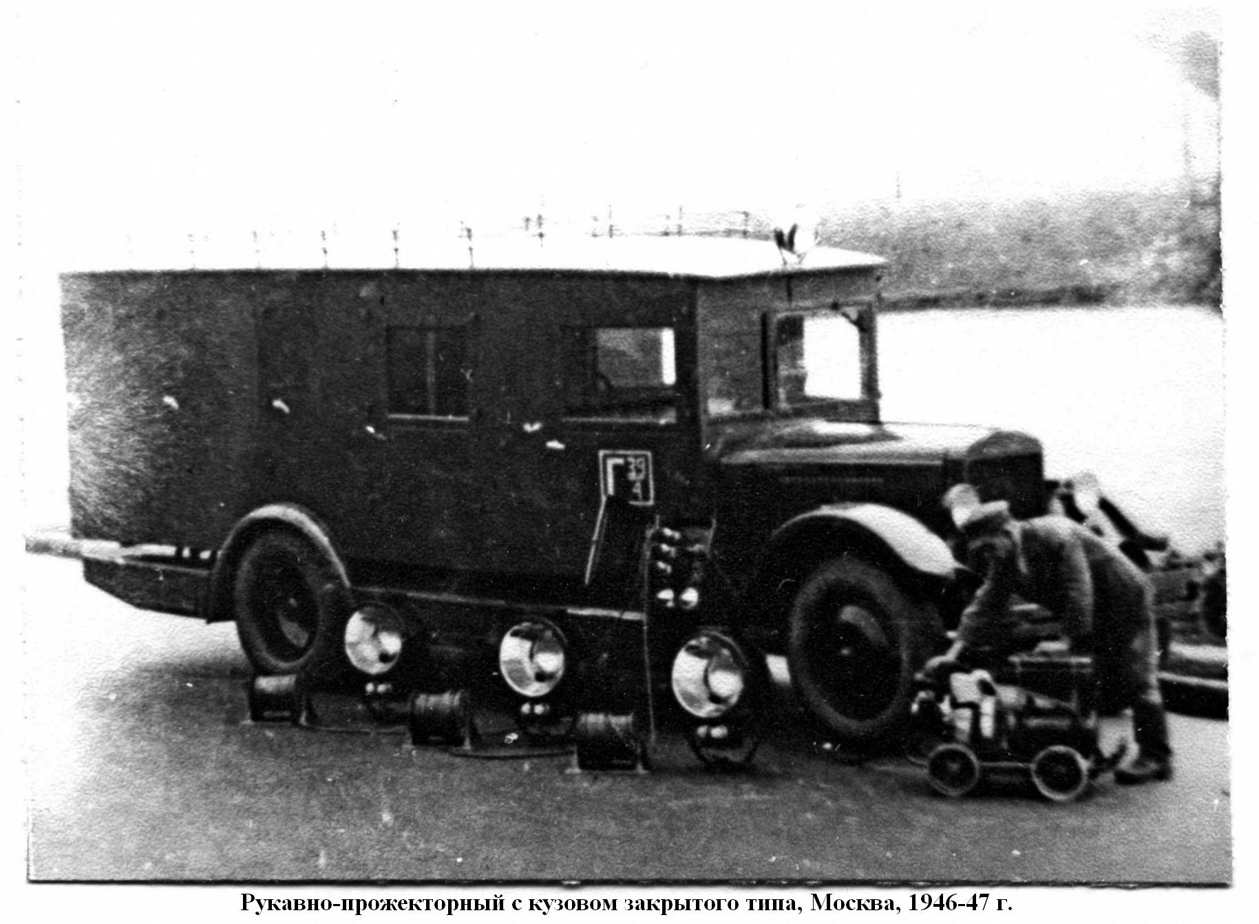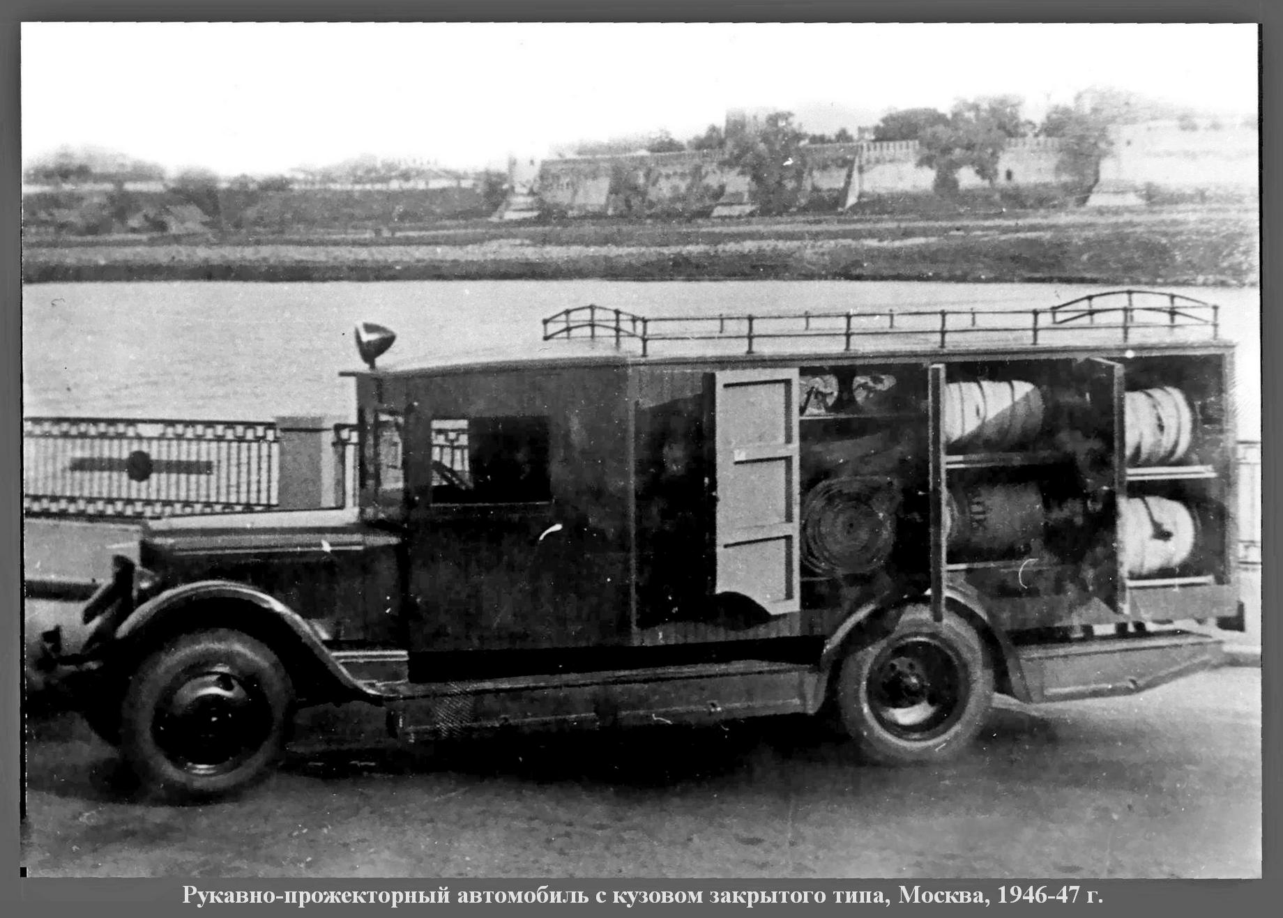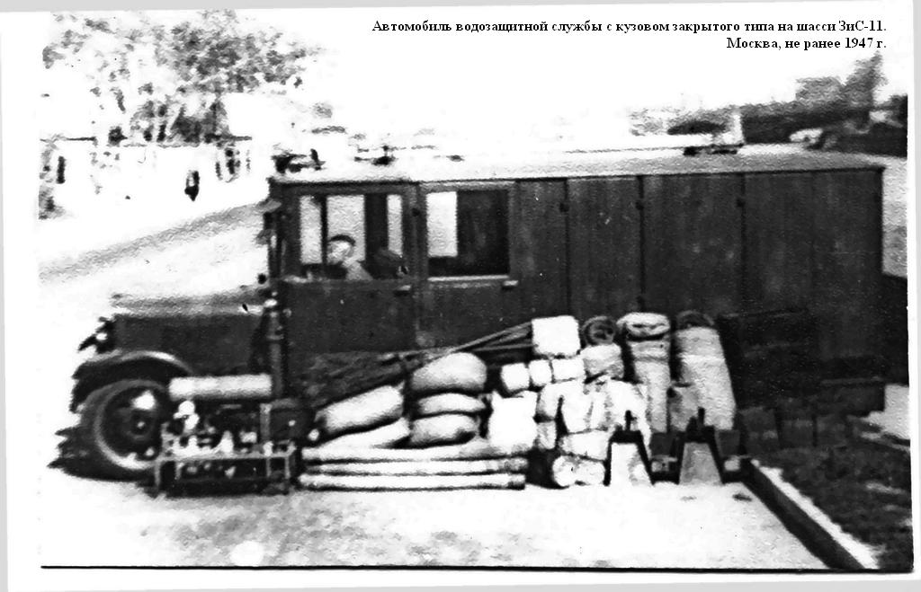 Пожарный автомобиль газодымозащитной службы закрытого типа на шасси ЗиС-11 4х2 с двумя дымососами и электрогенератором 6 кВт 120В, боевой расчет 11 человек, прожекторов 3 шт., полный вес до 6.5 тонн, максимальная скорость до 60 км/час.