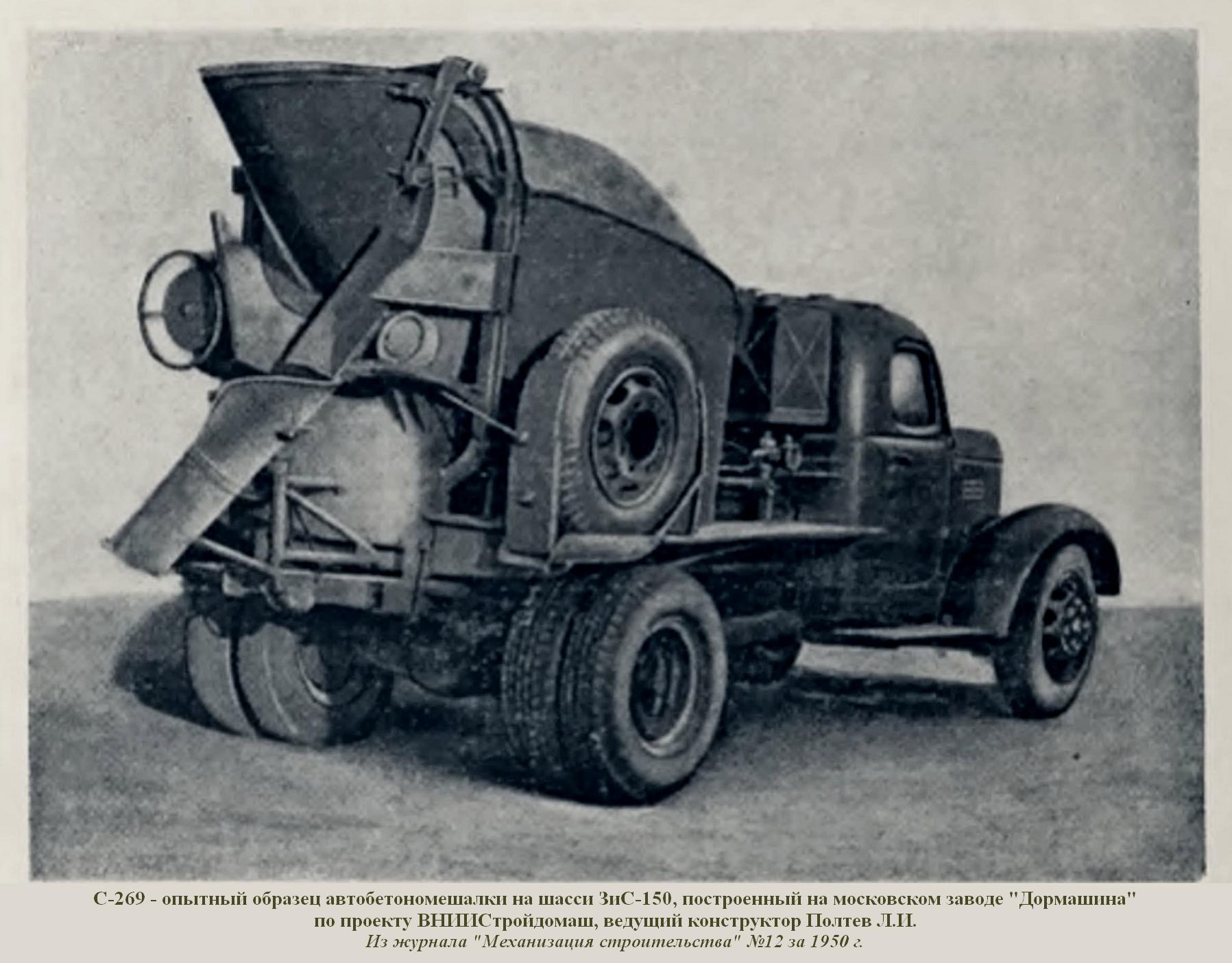 ЗиС-150 бортовойВ конце 40-х годов ВНИИстройдормаш разработал проект автобетоносмесителя С-269 на шасси грузовика ЗиС-150. Опытный образец машины изготовил московский завод "Дормашина". В отличие от довоенных конструкций, новинка имела ряд принципиальных отличий: смесительный барабан был не цилиндрическим, а грушевидной формы, и устанавливался не горизонтально, а под углом 17° к горизонту. Его полезная емкость была чуть выше, чем у предшественника СССМ-738, - 1,6 м3 водяной бак также увеличенной вместимости: 270 + 80 л. Неизменным остался тип привода барабана, как и прежде, он осуществлялся от коробки отбора мощности базового автомобиля, что являлось существенным недостатком. По сравнению с СССМ-738, автобетоносмеситель С-269 прибавил в весе почти на полтонны, его надстройка весила 2308 кг. Правда, после доработки машина стала более легкой, масса модернизированного варианта С-306 равнялась 2185 кг.