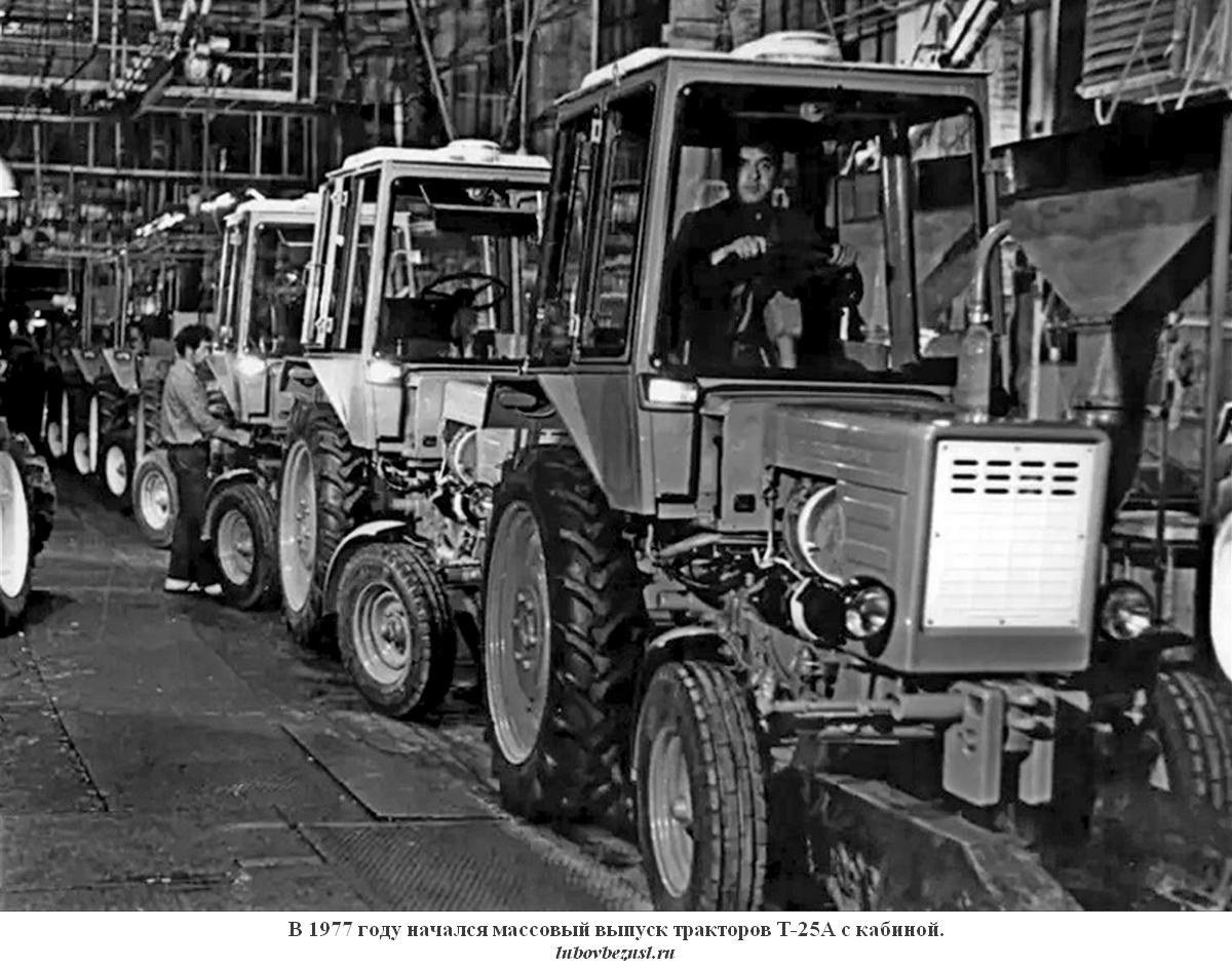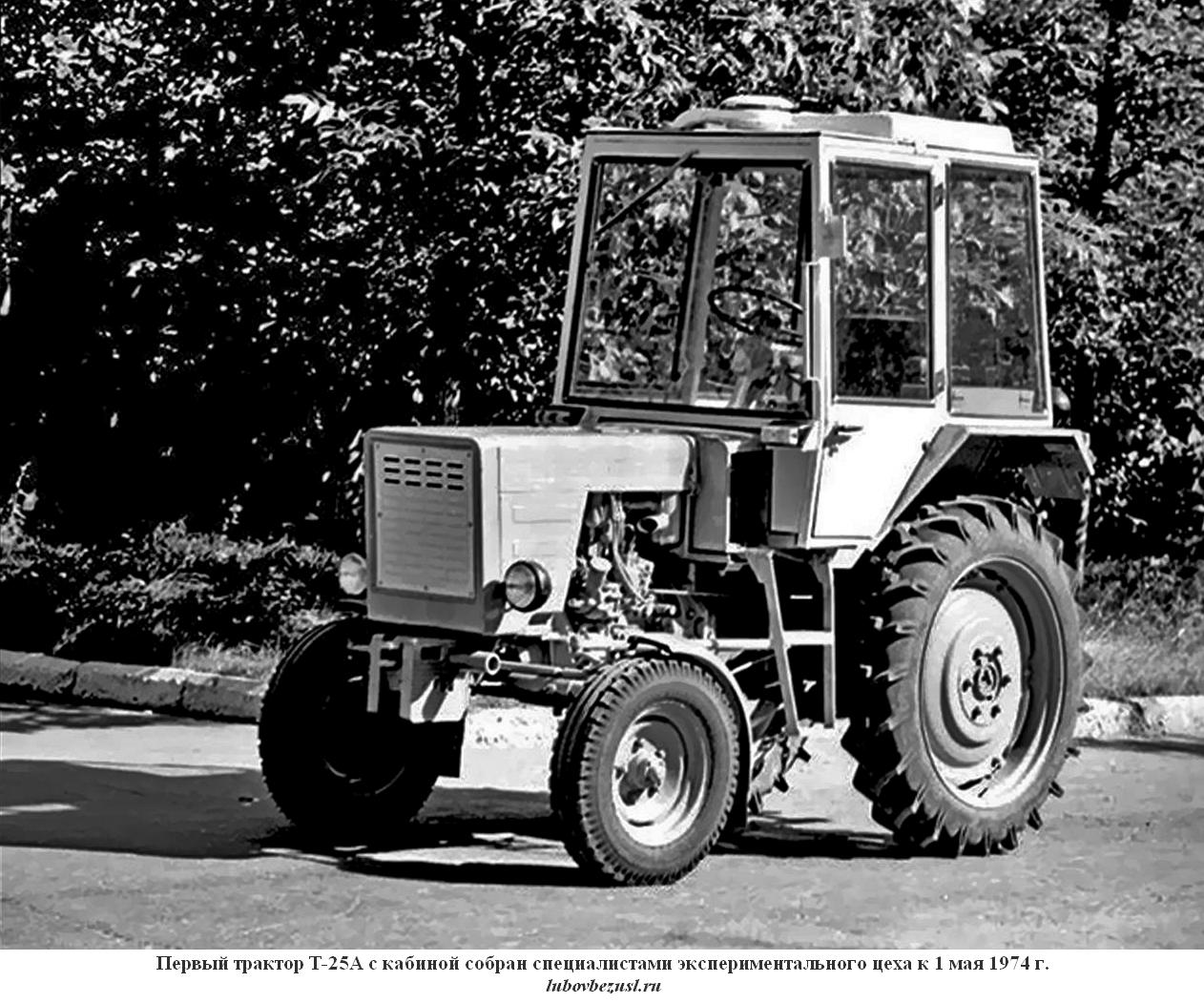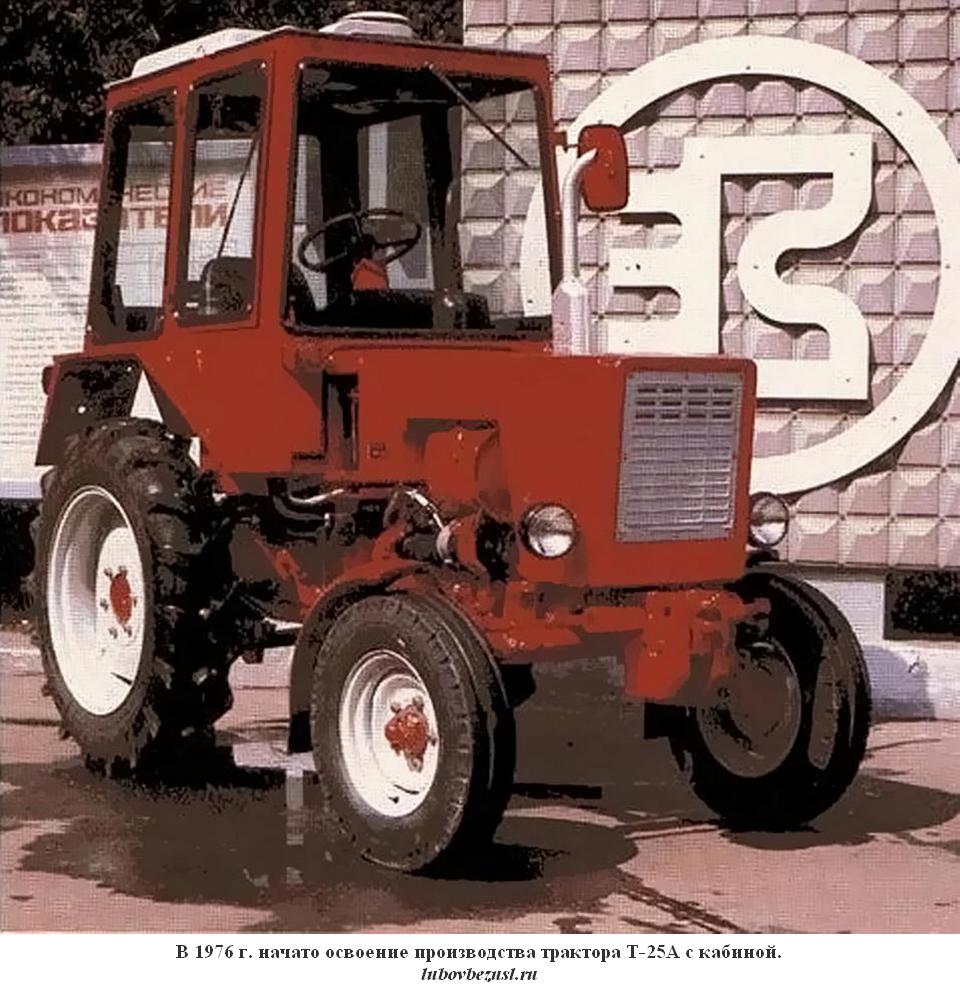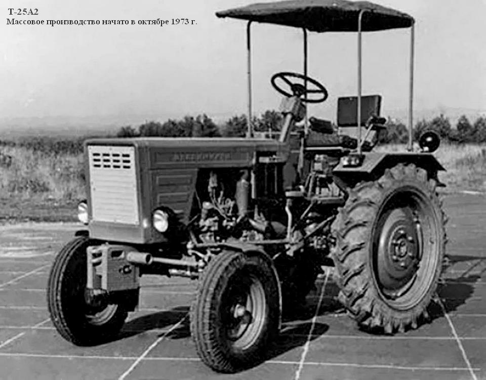 (lubovbezusl.ru) Массовое производство тракторов Т-25А (мод. А2 с тентом) начато в октябре 1973 г. Первый трактор Т-25А, оснащенный кабиной, собран специалистами экспериментального цеха к 1 мая 1974 г., в 1976 г. началось освоение производства трактора Т-25А с кабиной (базовая модель), а их массовый выпуск начался в 1977 г. В этом же году освоено производство трактора Т-25А3 со съемным каркасом безопасности для работы на пересеченной местности.