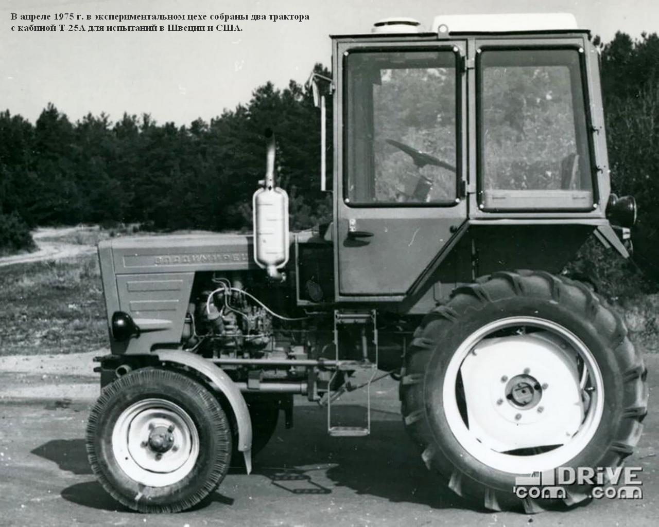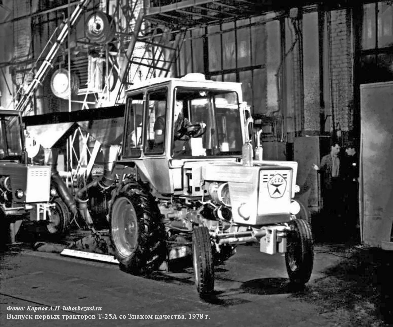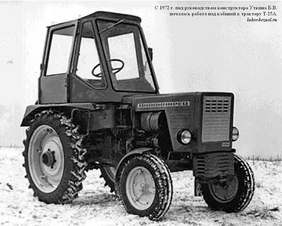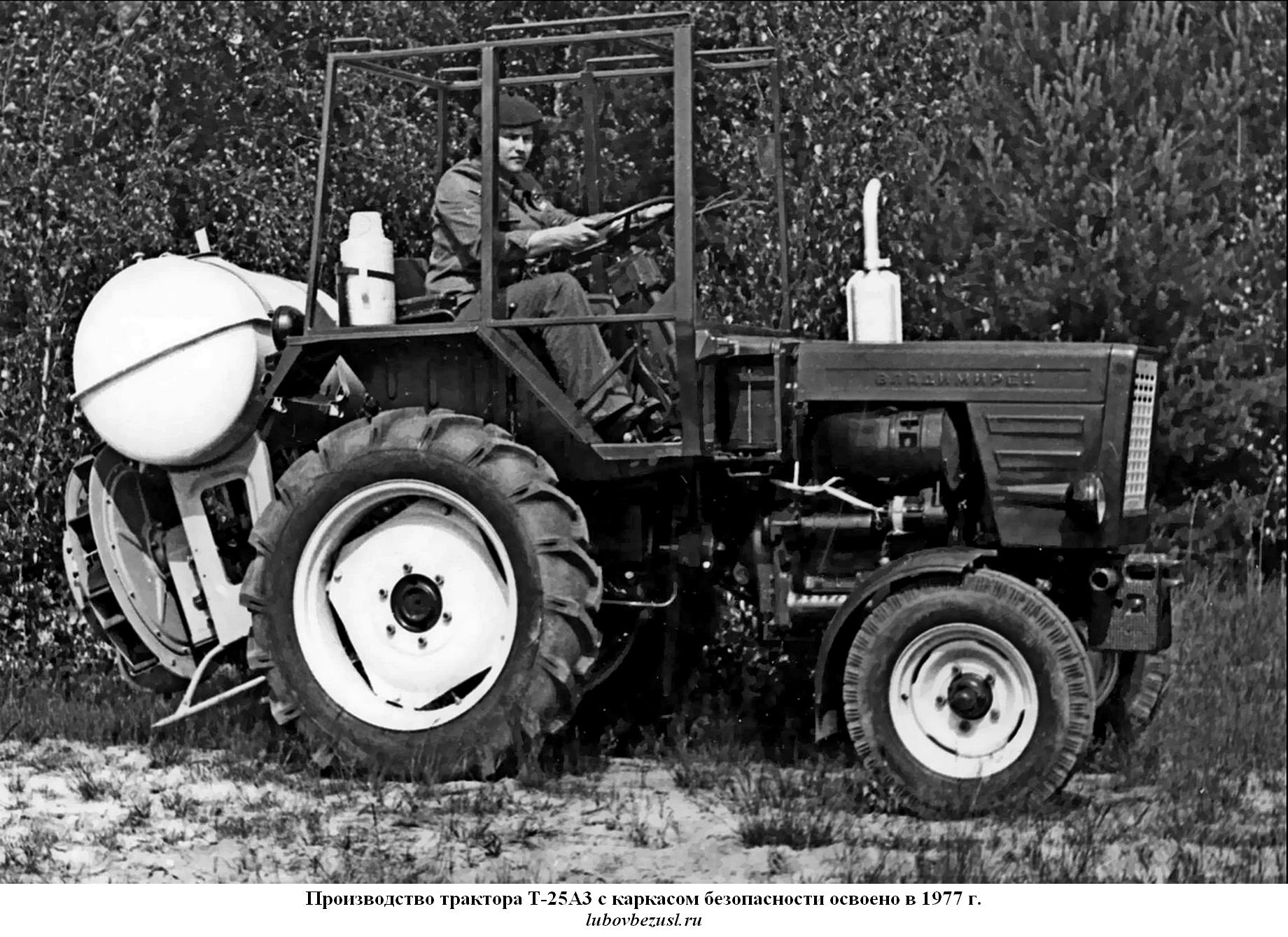 (lubovbezusl.ru) Массовое производство тракторов Т-25А (мод. А2 с тентом) начато в октябре 1973 г. Первый трактор Т-25А, оснащенный кабиной, собран специалистами экспериментального цеха к 1 мая 1974 г., в 1976 г. началось освоение производства трактора Т-25А с кабиной (базовая модель), а их массовый выпуск начался в 1977 г. В этом же году освоено производство трактора Т-25А3 со съемным каркасом безопасности для работы на пересеченной местности.