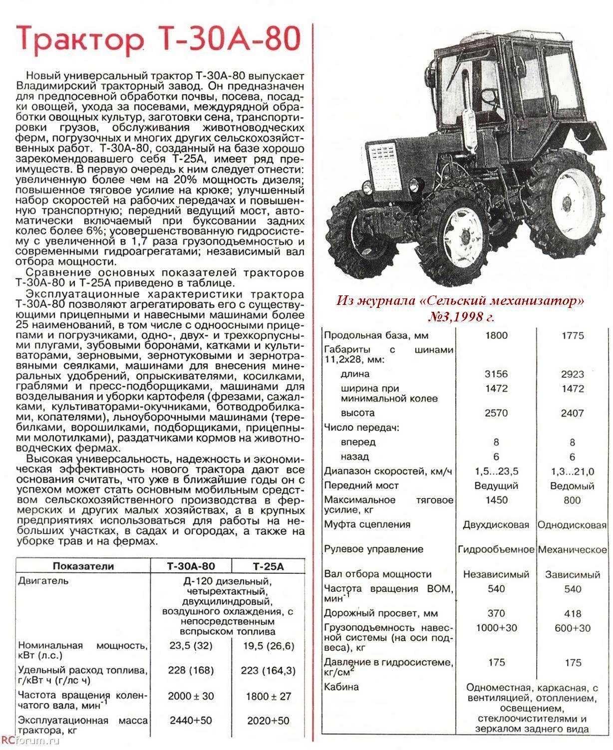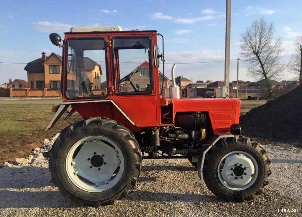Новый универсальный трактор Т-30А-80 выпускает Владимирский тракторный завод. Он предназначен для предпосевной обработки почвы, посева, посадки овощей, ухода за посевами, междурядной обработки овощных культур, заготовки сена, транспортировки грузов, обслуживания животноводческих ферм, погрузочных и многих других сельскохозяйственных работ. Т-30А-80, созданный на базе хорошо зарекомендовавшего себя Т-25А, имеет ряд преимуществ. В первую очередь к ним следует отнести: увеличенную более чем на 20% мощность дизеля; повышенное тяговое усилие на крюке; улучшенный набор скоростей на рабочих передачах и повышенную транспортную; передний ведущий мост, автоматически включаемый при буксовании задних колес более 6%; усовершенствованную гидросистему с увеличенной в 1,7 раза грузоподъемностью и современными гидроагрегатами; независимый вал отбора мощности.