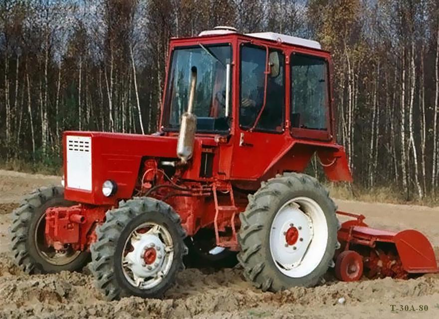Переходная модель — Т-30А-80 помогла решить многие проблемы Т-25А. У новой машины имелись дисковые тормоза, гидрообъемное рулевое управление, независимый вал отбора мощности, передний ведущий мост, кабина жесткой конструкции, снижены шумовые характеристики.