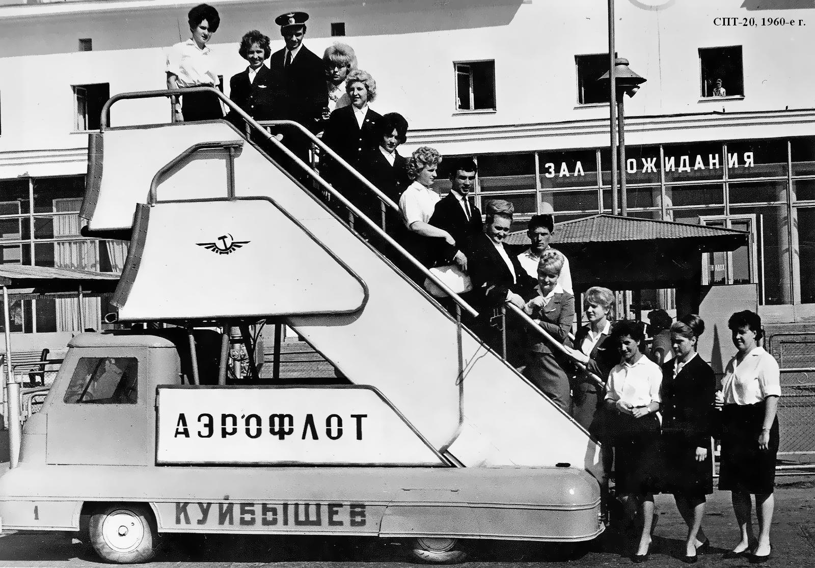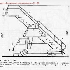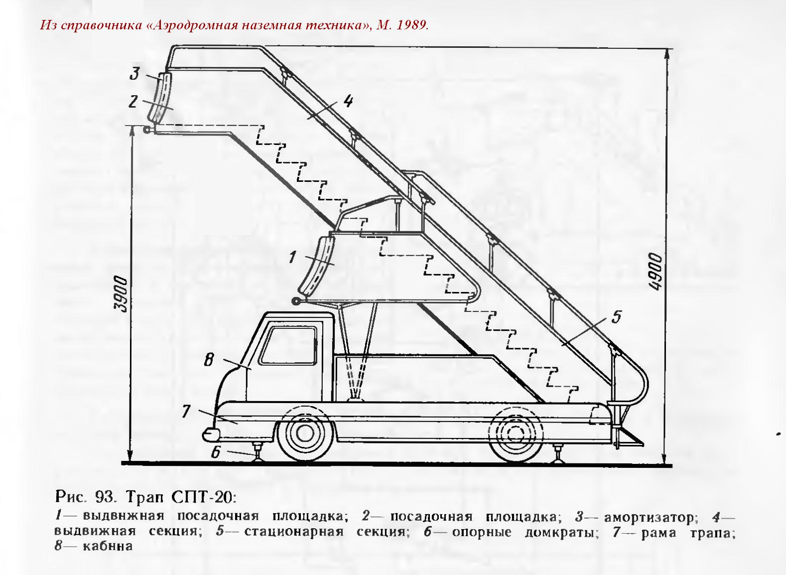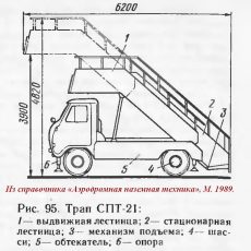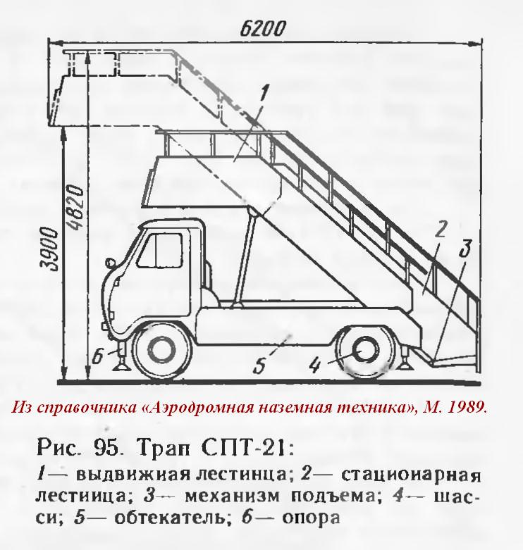 Конструкция. Лестница трапа СПТ-20 имеет постоянный угол наклона и состоит из стационарной части, укрепленной на шасси трапа, выдвижной секции б, посадочной площадки 4 и дополнительной выдвижной посадочной площадки 3, предназначенной для обслуживания самолетов с высотой порога пассажирских дверей около 2 м.