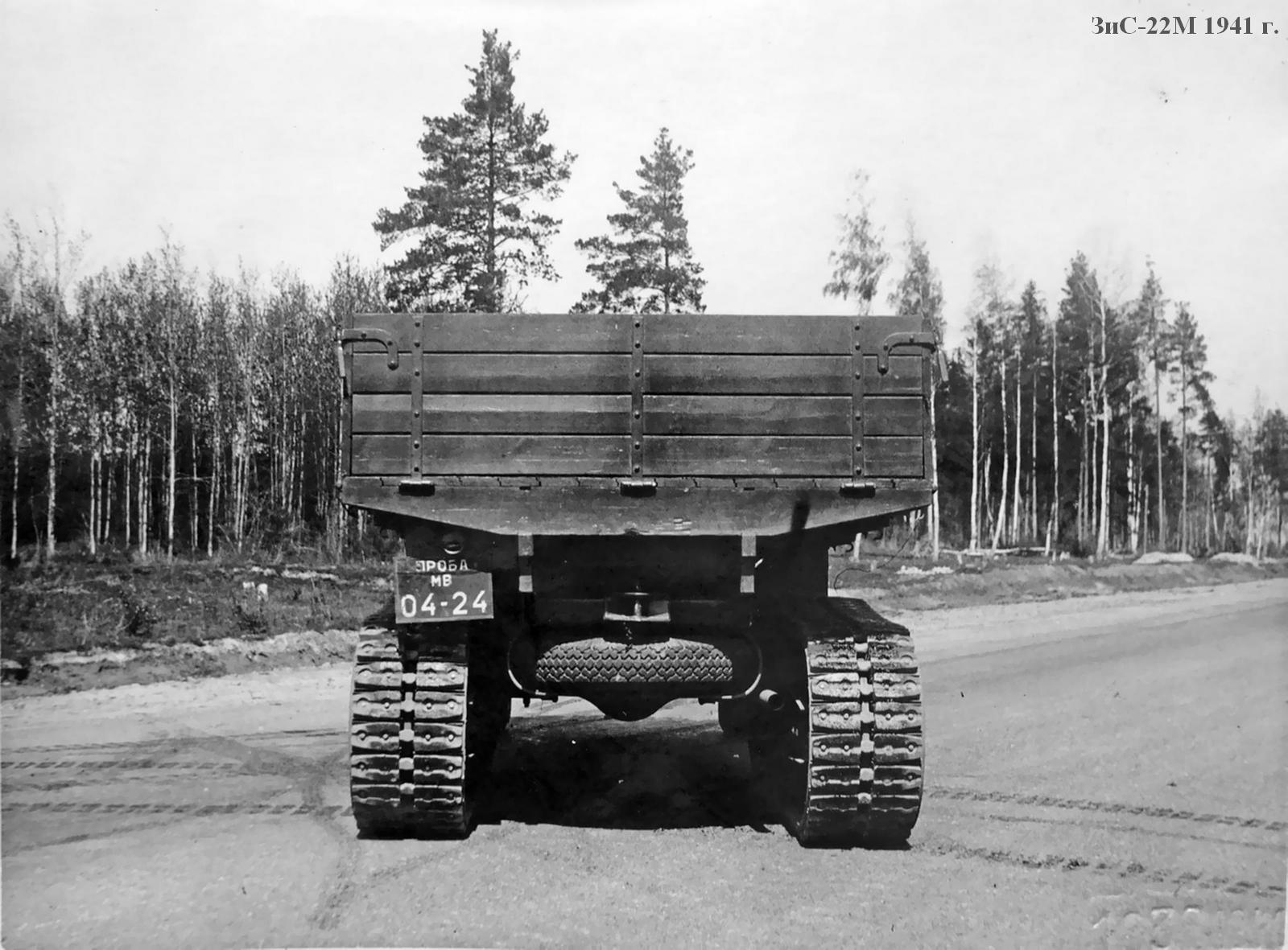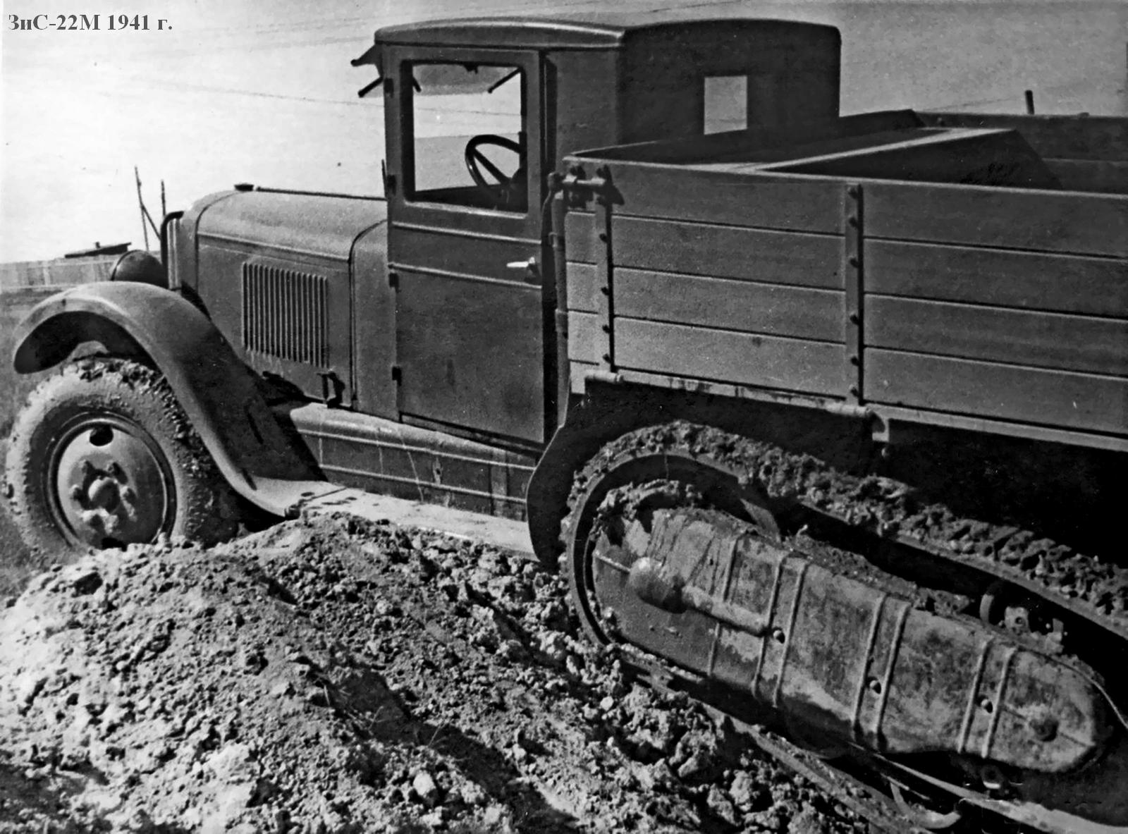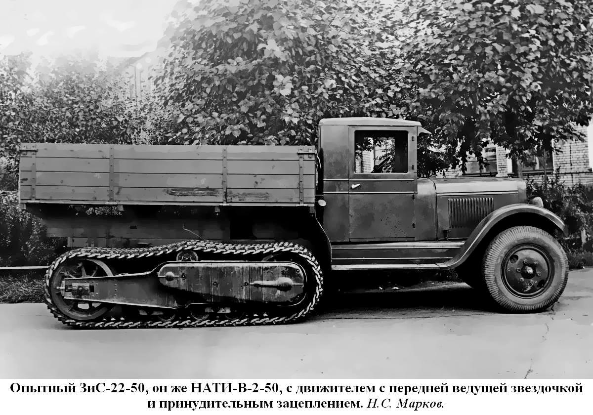 В апреле-мае 1940 г. состоялся ряд совещаний о перспективах возобновления выпуска полугусеничных автомобилей. С учетом выявленных недостатков конструкцию ЗиС-22 решили доработать, причем главным нововведением стало внедрение принудительного зацепления ведущего колеса и гусеницы. Сначала на опытном образце ЗиС-22-Н ("новый"), построенном весной 1940 года, решили сохранить привод на оба бортовых ведущих колеса, оборудовав их звездочками для принудительного зацепления с гусеницей. На следующем образце машины — ЗиС-22-50— ликвидировали привод на заднюю звездочку — достаточно оказалось и одной передней. В передних ведущих колесах тележек смонтировали колодочные тормоза с ножным приводом, хотя на выходе из коробки передач по-прежнему сохранялся центральный дисковый тормоз (от ЗиС-6) с ручным приводом. Запас хода повысился за счет увеличенной на 160 л емкости бензобаков. И, самое главное, был установлен более мощный двигатель ЗиС-16 (85 — 88 л.с.). Ввиду постоянных перегревов двигателя радиатор поставили увеличенный, от ЗиС-6. Следующий, более рационально спроектированный полугусеничный автомобиль ЗиС-22-52 (тогда еще НАТИ-В22-52) получил совершенно новую, менее тяжелую гусеницу. Для уменьшения потерь при движении по глубокому снегу и болоту на передние колеса могли надеваться стальные лыжи коробчатого сечения длиной 1100 мм и шириной 410 мм, закрепляемые на шинах цепями с резьбовыми тендерами. Одновременно для облегчения движения по глубоким колеям и для предварительного уплотнения глубокого снега под передней осью размещался жесткий поддон, закрепленный на первой трубчатой поперечине рамы и на балке переднего моста. От попадания снега наверх он защищался кожухом.