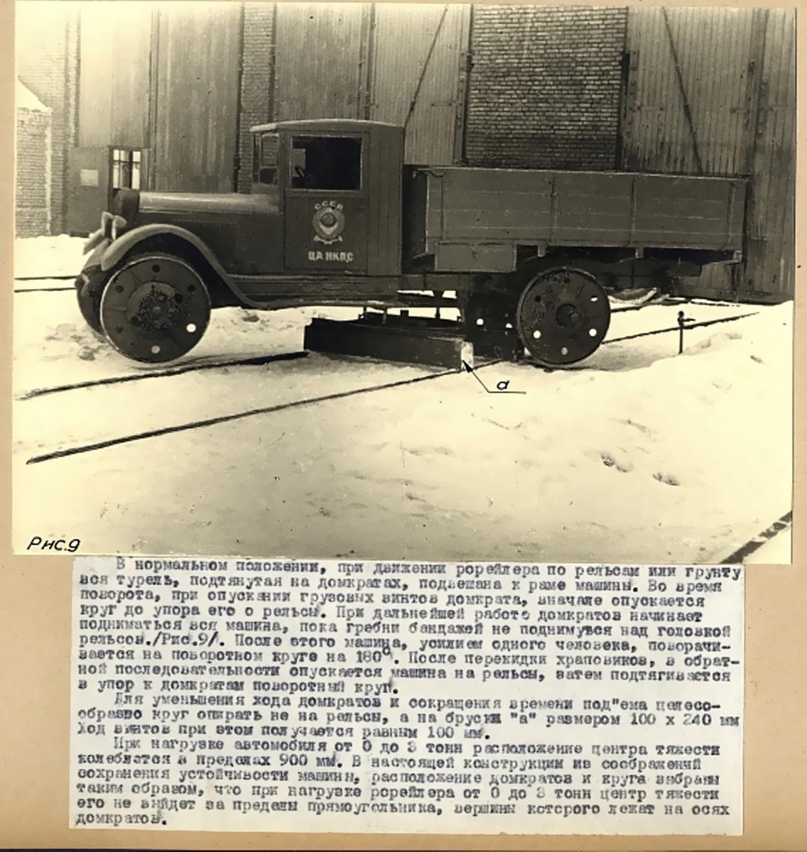 Далее для определения возможности транспортировки дополнительного груза к рорейлеру была прицеплена платформа автодрезины У2, нагруженная чугунными слитками весом 2,5 тонны, и нагруженный бревнами ЗиС уверенно тянул прицеп по 14-градусному подъему. Но самыми интересными испытаниями были, конечно же, пит-стоп и разворот на 180 градусов. Хронометристами было подсчитано, что если менять все четыре колеса вдвоем, то на это требуется 1 час 5 минут, а если втроем, то всего 27 минут. На поворот порожнего рорейлера водителю требовалось 45 минут, а груженого - 20 минут. Такой удивительный результат объяснялся улучшением тренированности водителя и приработкой поворотного приспособления. Предположу, что с третьей попытки с 45-минутного результата можно было бы скинуть еще полчаса времени.