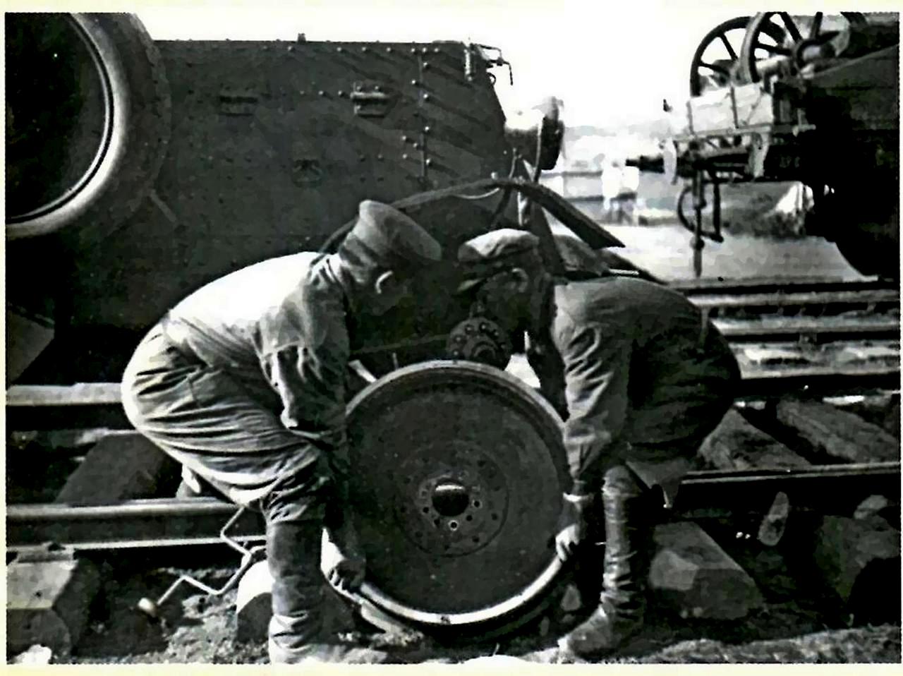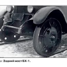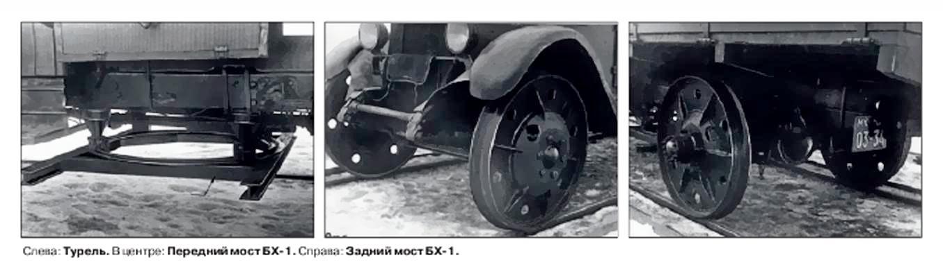 Это приспособление было названо поворотной турелью, и работало оно так. Водитель вылезал из кабины, подставлял под машину чурбачки 2000x100x240 мм и вручную с помощью съемного рычага, вставляемого в храповик каждого из четырех укрепленных на лонжеронах рамы винтовых домкратов с роликами на концах, опускал турель на подставки. Турель представляла собой поворотный круг, состоящий из кольца с приваренным к нему минирельсом для роликов. Кольцо, в свою очередь, было приварено к легкой раме, сваренной из швеллеров. Клиренс под турелью составлял 250 мм, и в этом случае проходимость БХ-1 примерно равнялась автобусу ЗиС-8. При езде по сильно пересеченной местности кольцо могло быть снято и погружено в грузовик, хотя для этого требовались изрядные физические усилия: вес всей турели и домкратов составлял 120 кг. «Чурбачки», напоминающие скорее шпалы, весили тоже по 22 кг каждый. Они были нужны, так как домкраты имели малый ход, а благодаря деревянным упорам для вывешивания машины надо было опустить их всего на 100 мм. Вес каждого железнодорожного колеса составлял 77 кг, что примерно соответствовало массе обычного стандартного ЗиСовского колеса с пневматической шиной 34x7. Кстати, колеса для БХ-1 использовались штатные, только творчески переработанные. Выглядело это так: обычный диск от ЗиС-5 обрезался с двух сторон, а потом к нему крепился со стороны ступицы кольцевой диск, вырезанный из листового железа, а к нему, в свою очередь, бандаж от списанных вагонных колес. Жесткость похудевшего колеса обеспечивали многочисленные ребра из приваренных стальных уголков.
